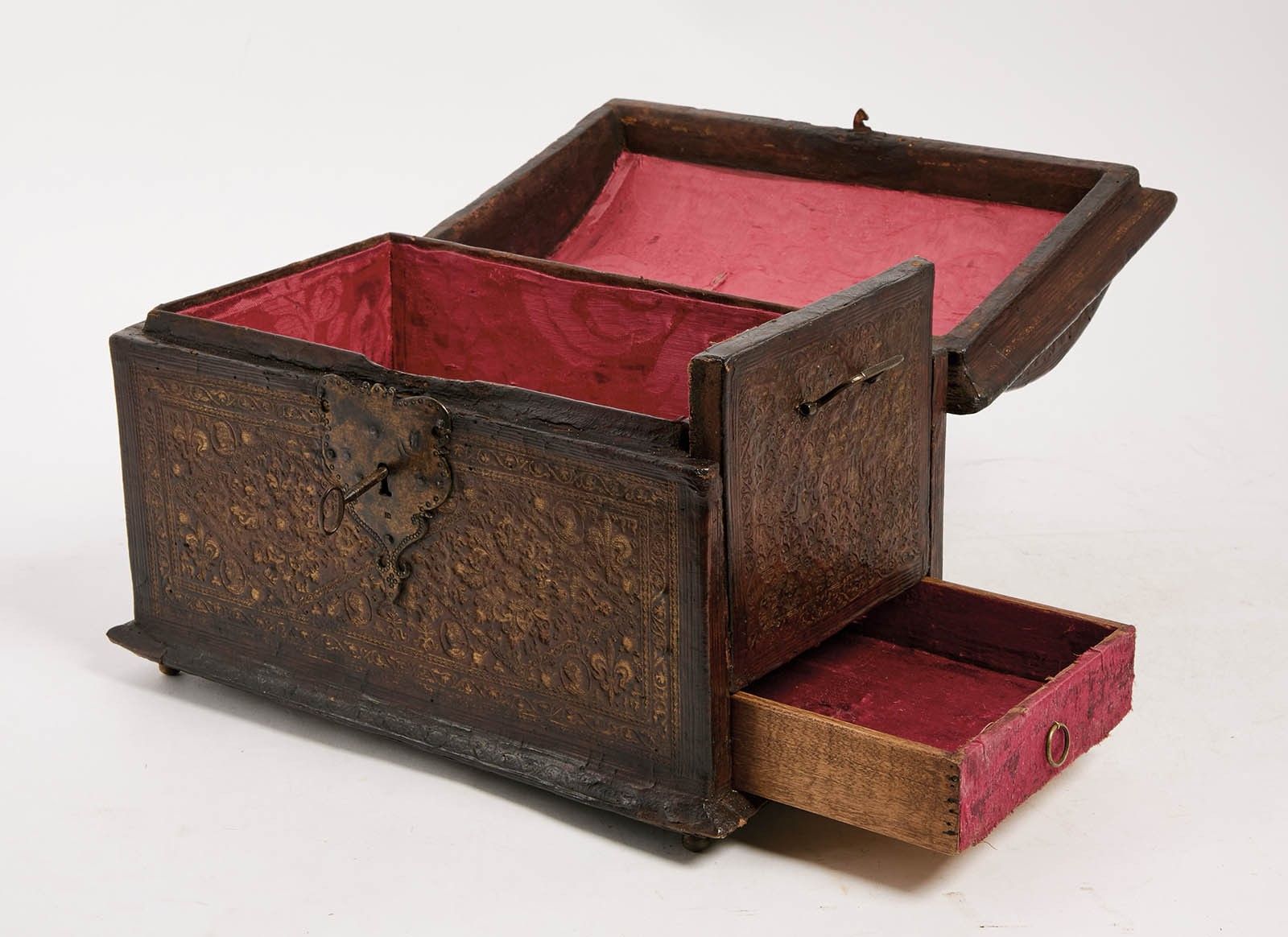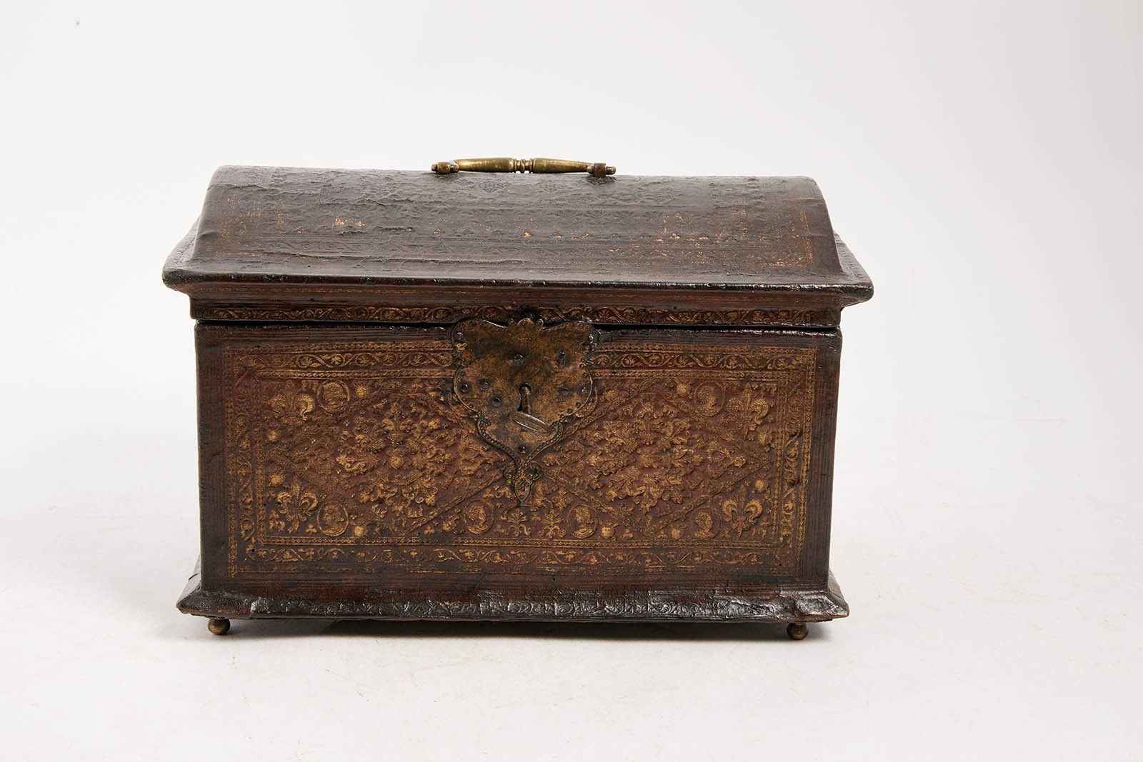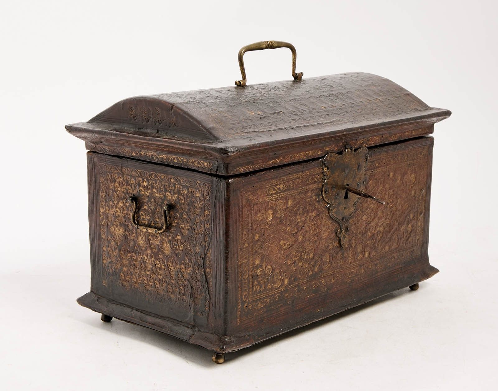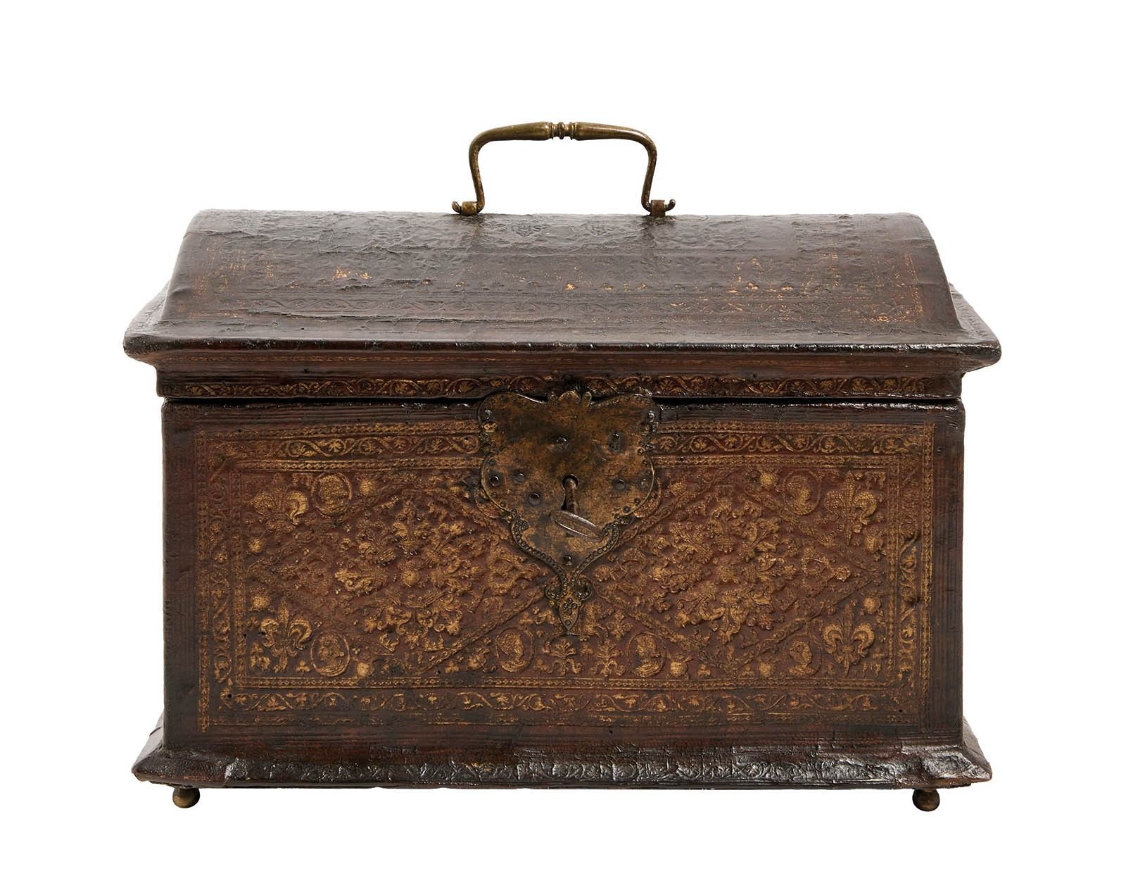161 A handsome chest upholstered in embossed morocco with gilt highlights and decorated with heads of figures, fleurs-de-lis and stylised motifs, with gilt metal trim on the lock escutcheons, handles and feet.