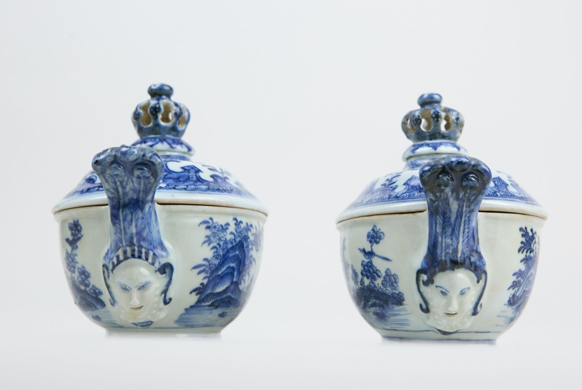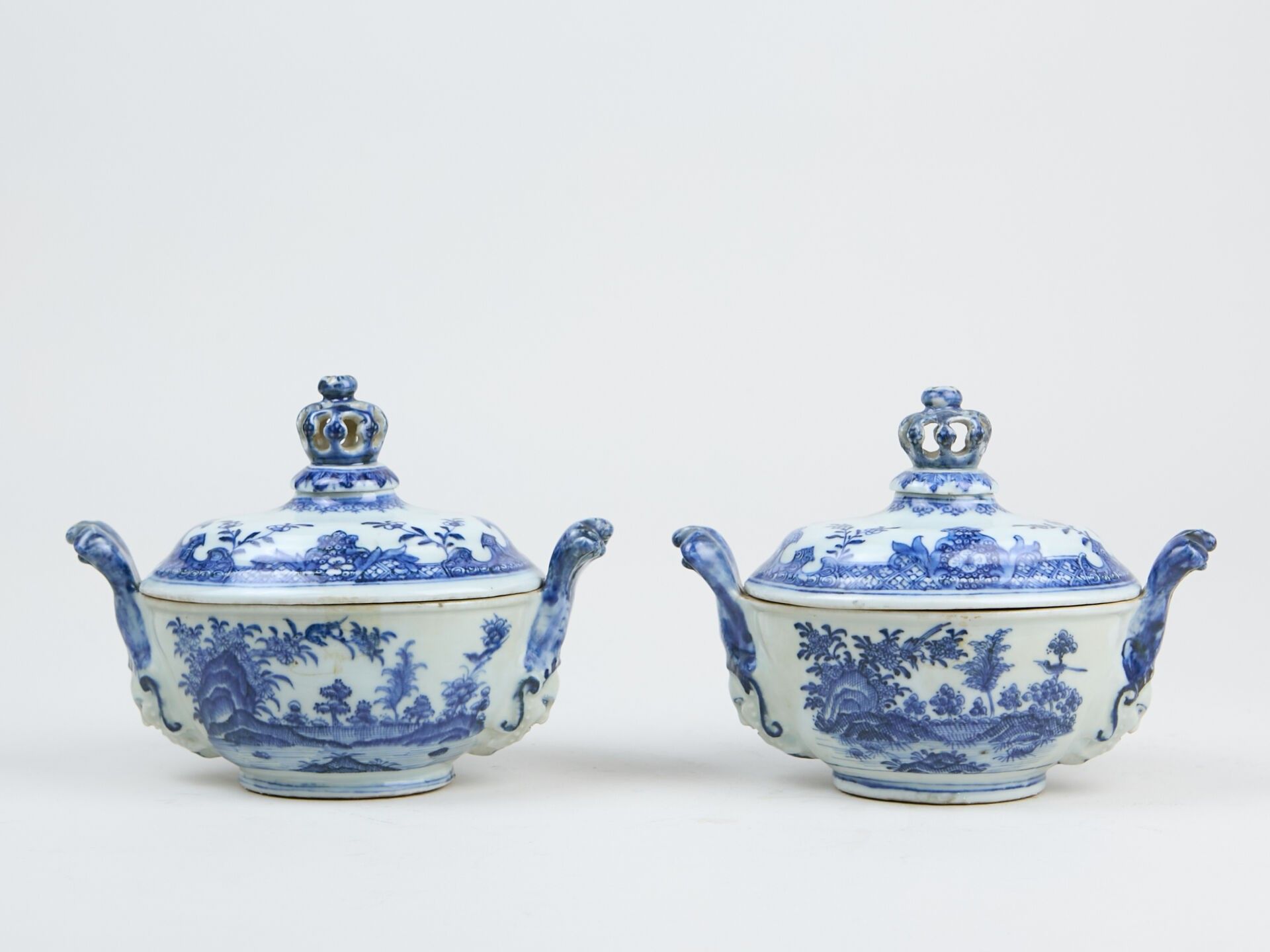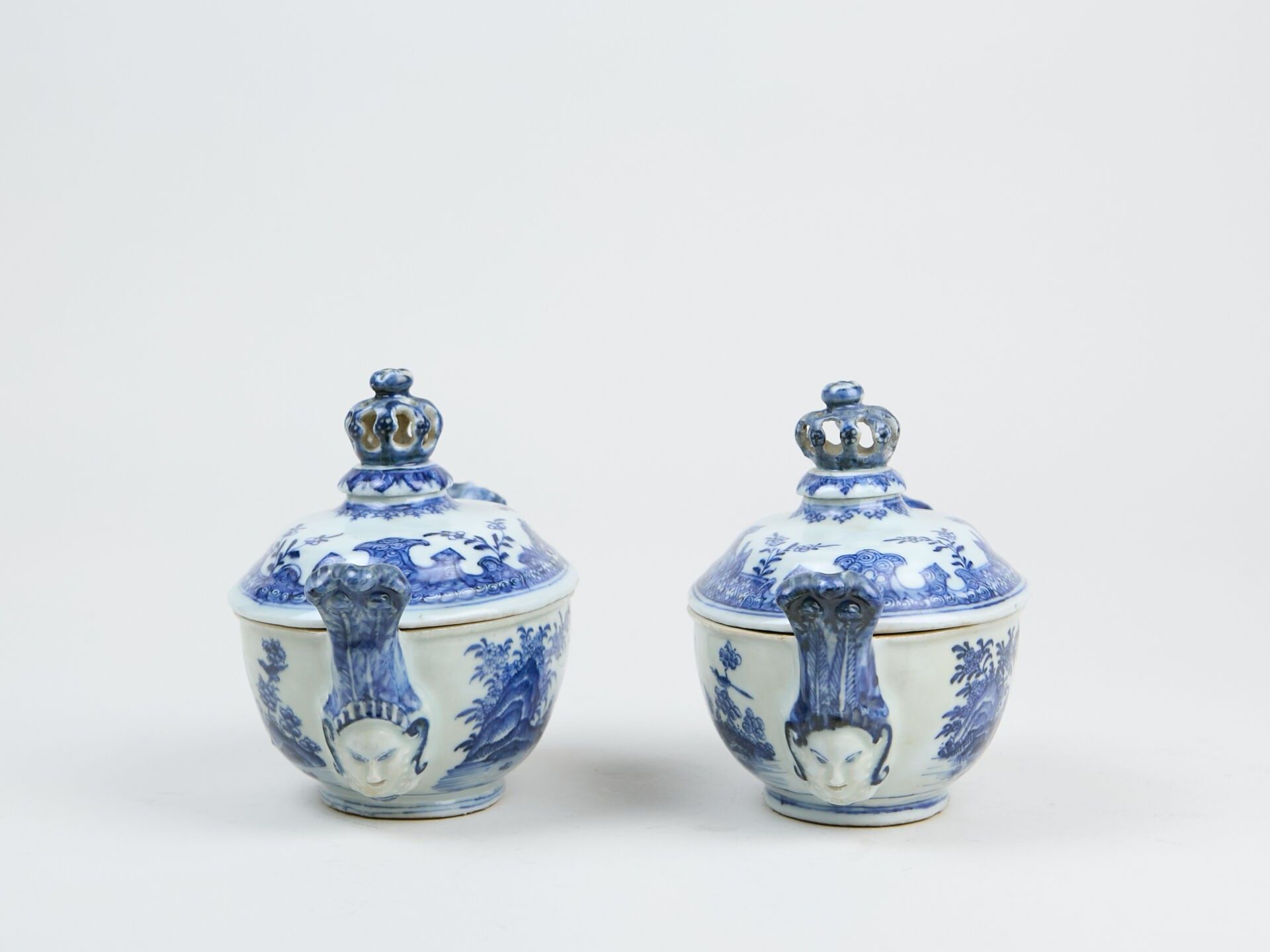 CHINA Pair of small 2-handle porcelain terrines decorated with blue monochrome landscapes. Compagnie des Indes. 18th century. 15 x 20 x 12 cm
