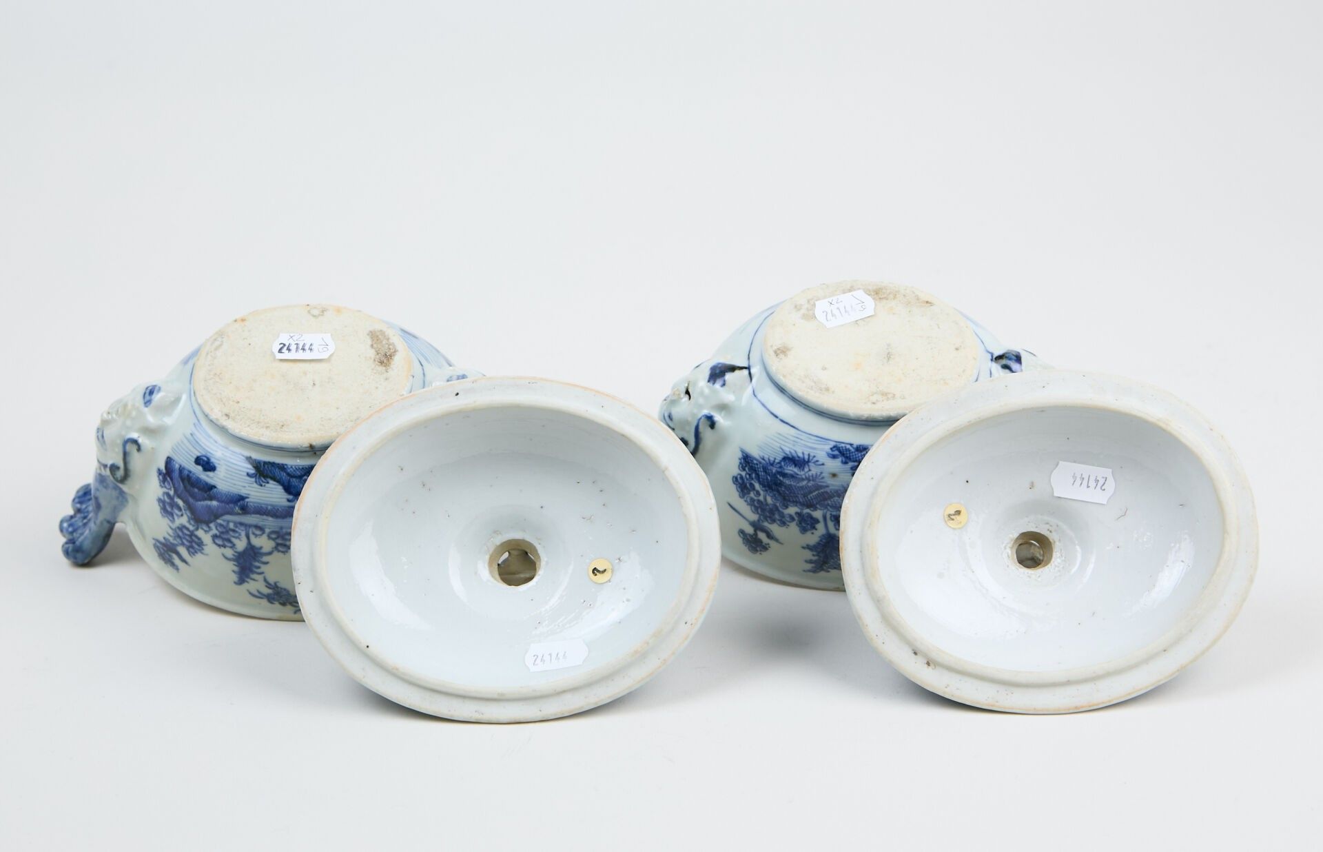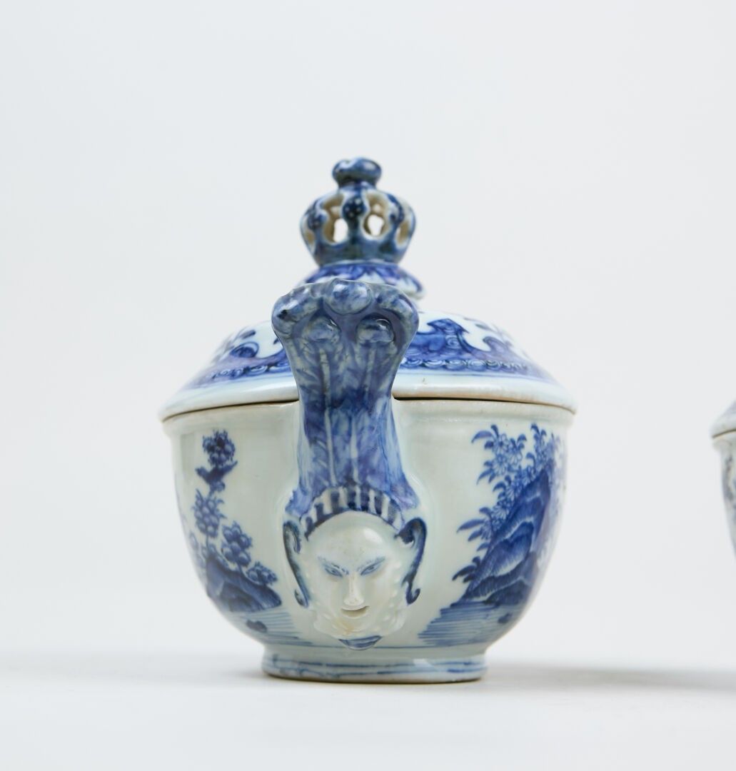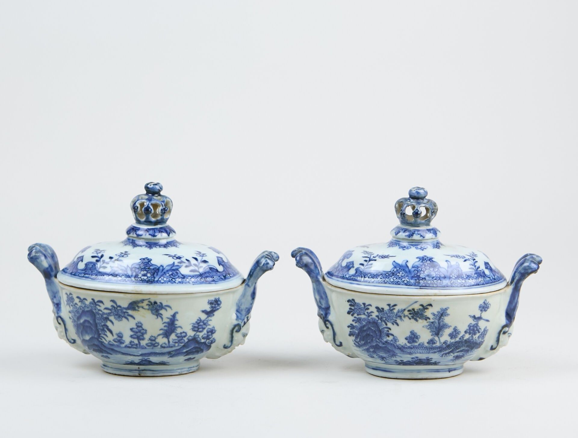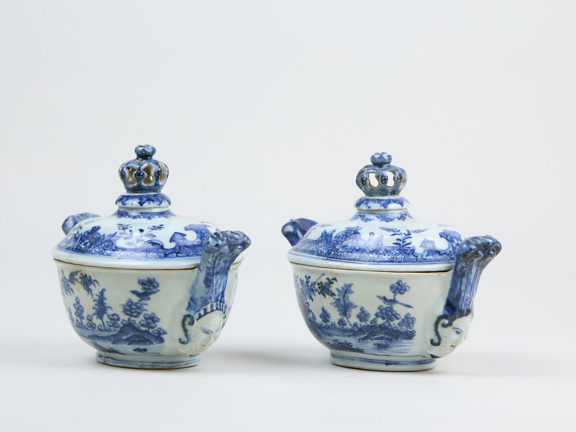 CHINA Pair of small 2-handle porcelain terrines decorated with blue monochrome landscapes. Compagnie des Indes. 18th century. 15 x 20 x 12 cm