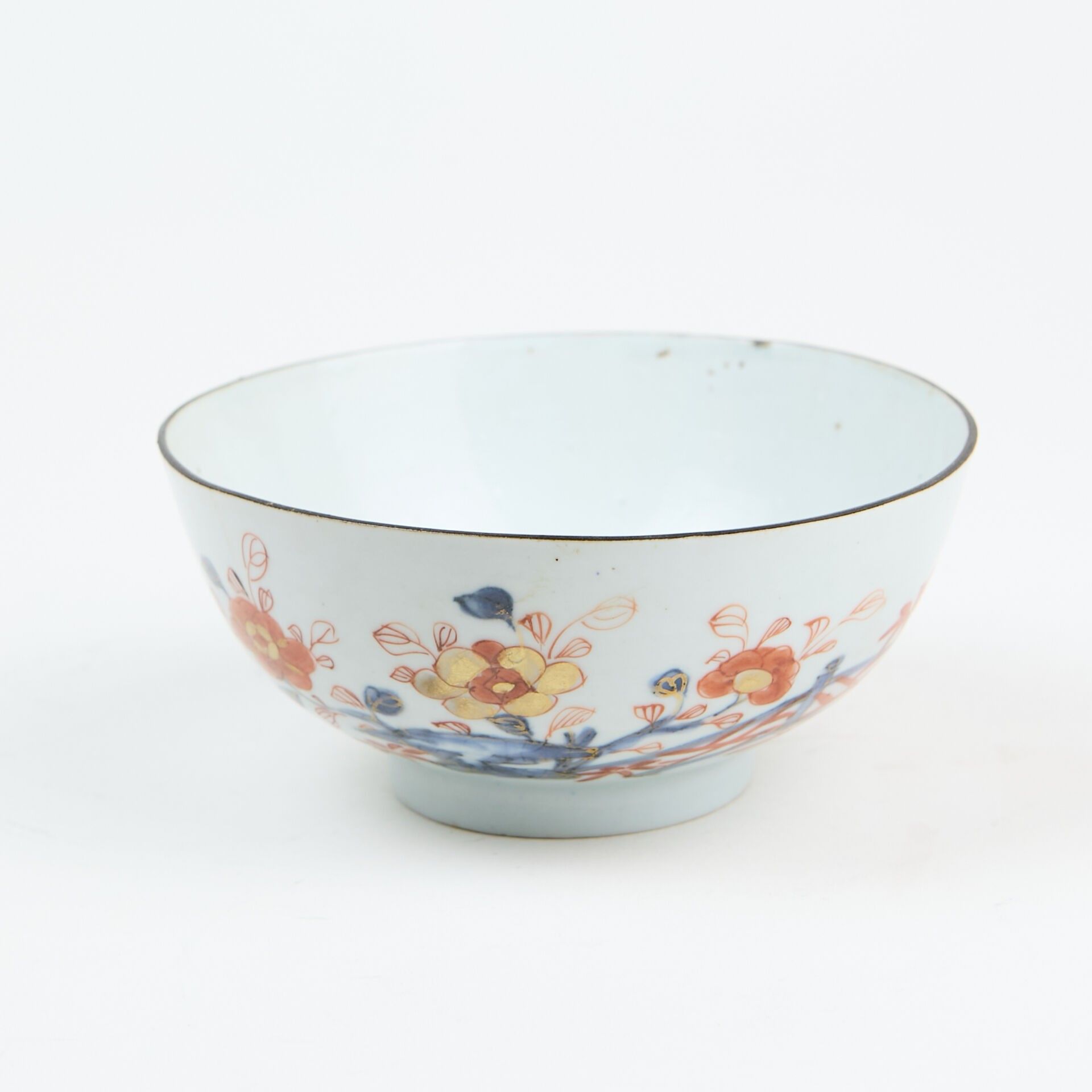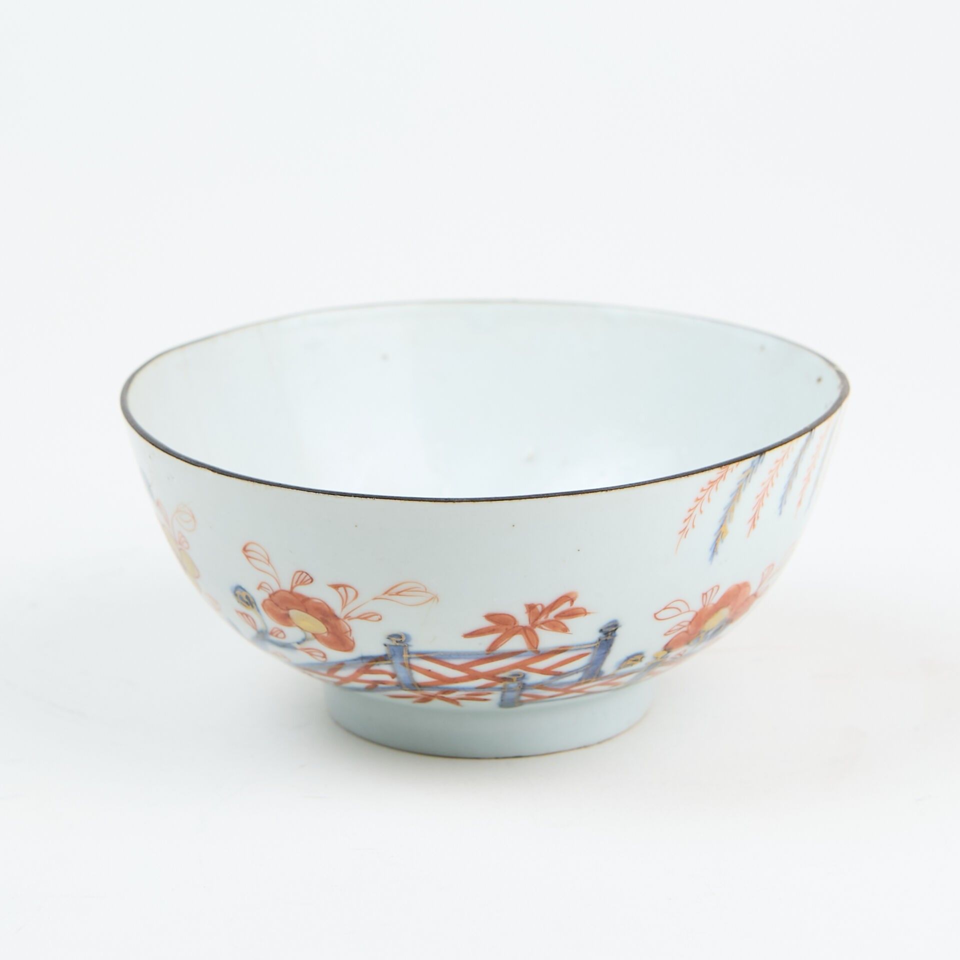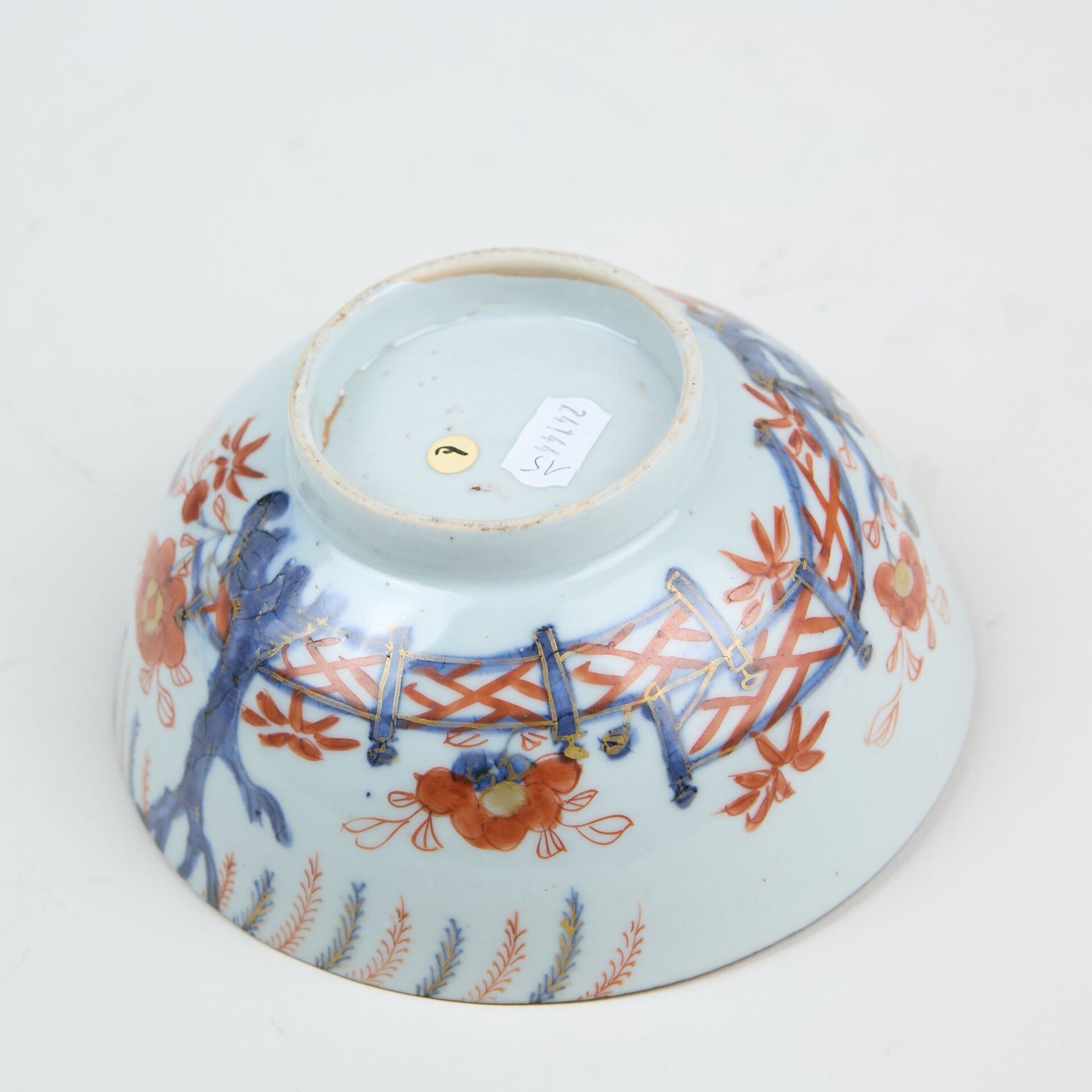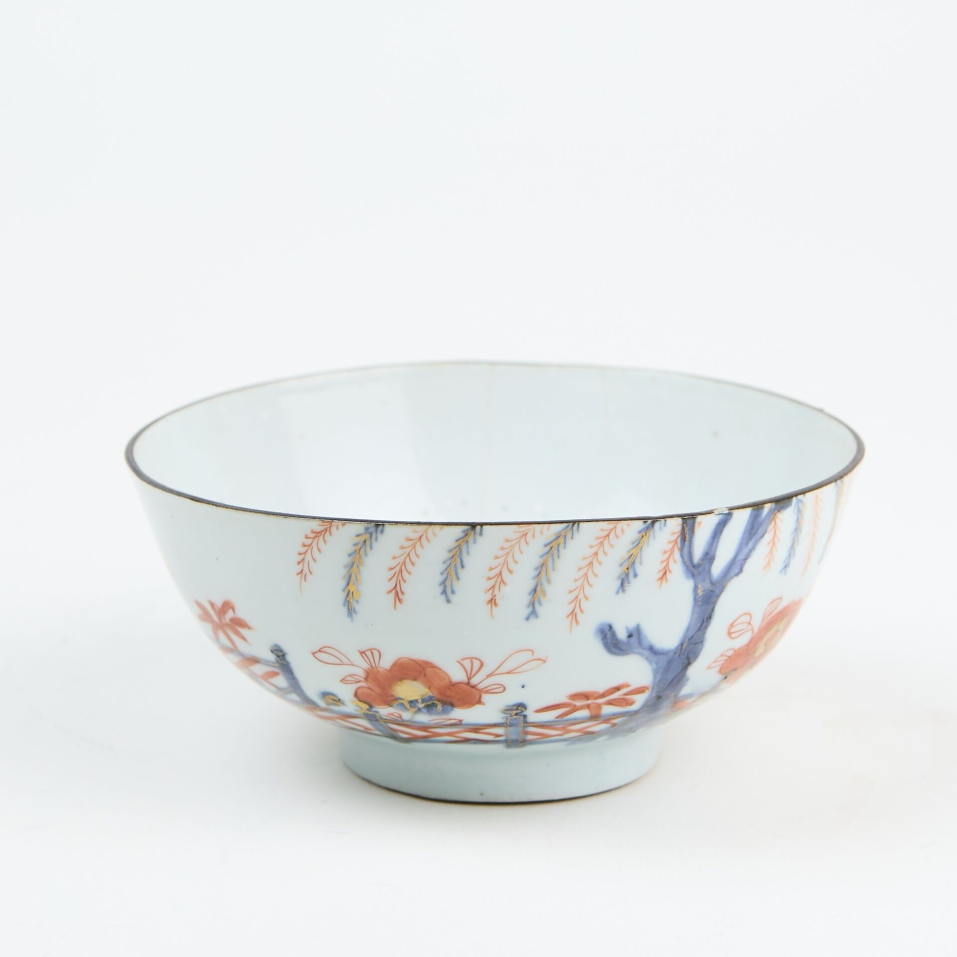 Porcelain bowl on heel with weeping willow and blue imari decoration. Iron wood base