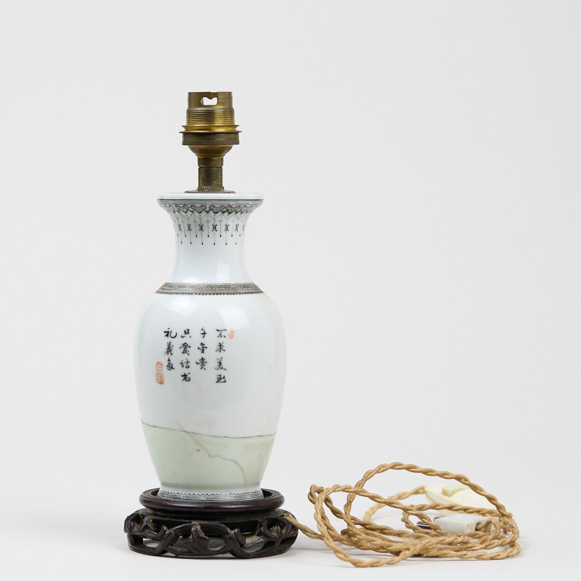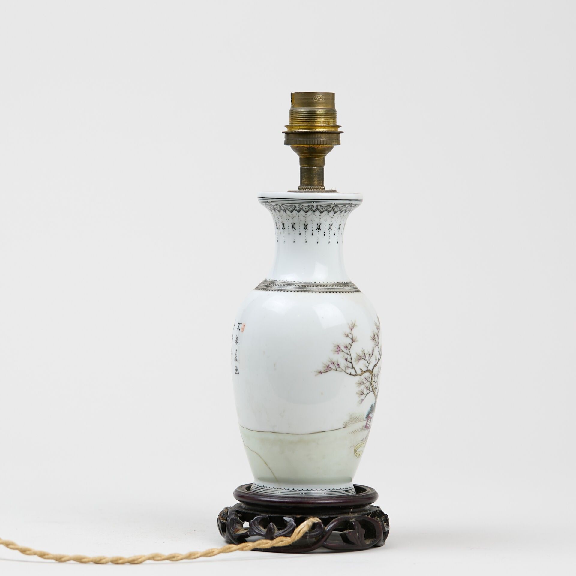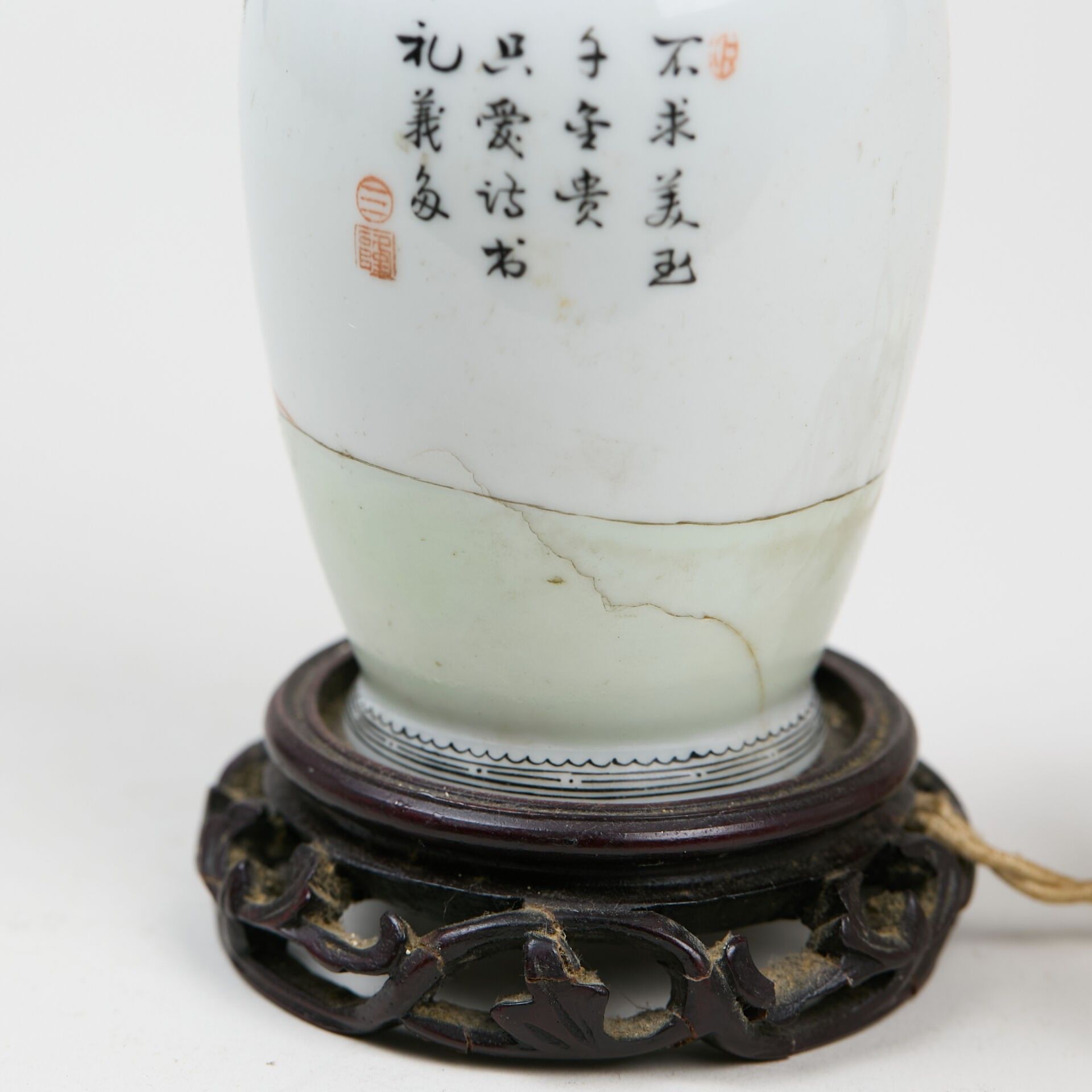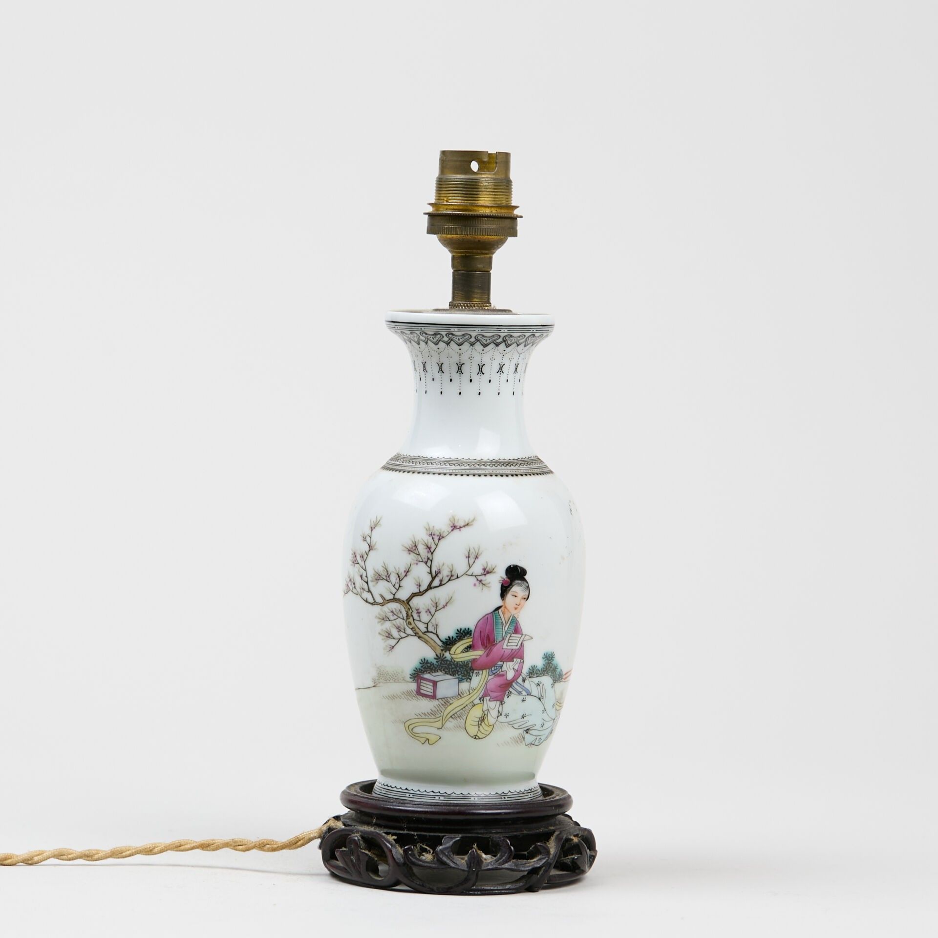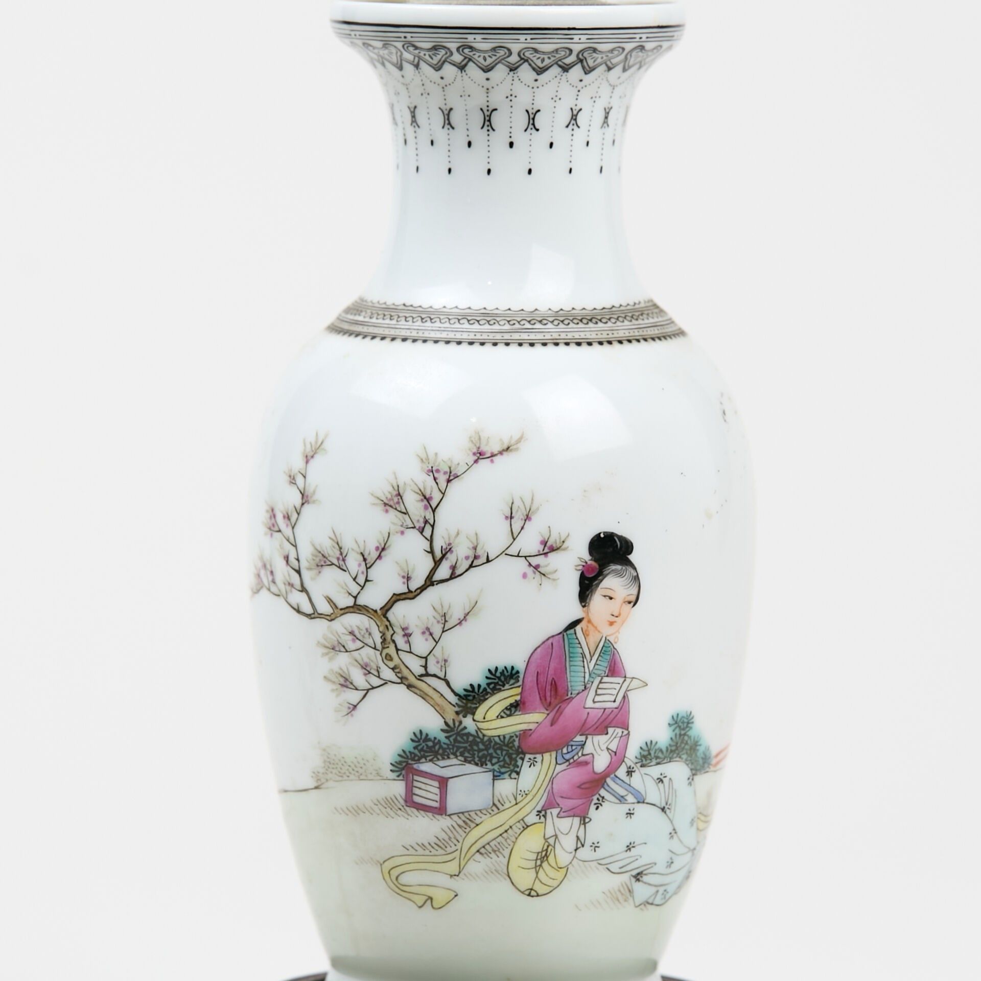Small baluster vase, in porcelain and polychrome enamels, decorated with a woman reading in a garden and calligraphic poems.