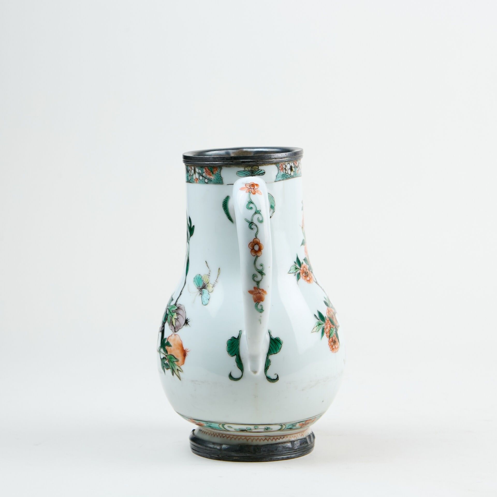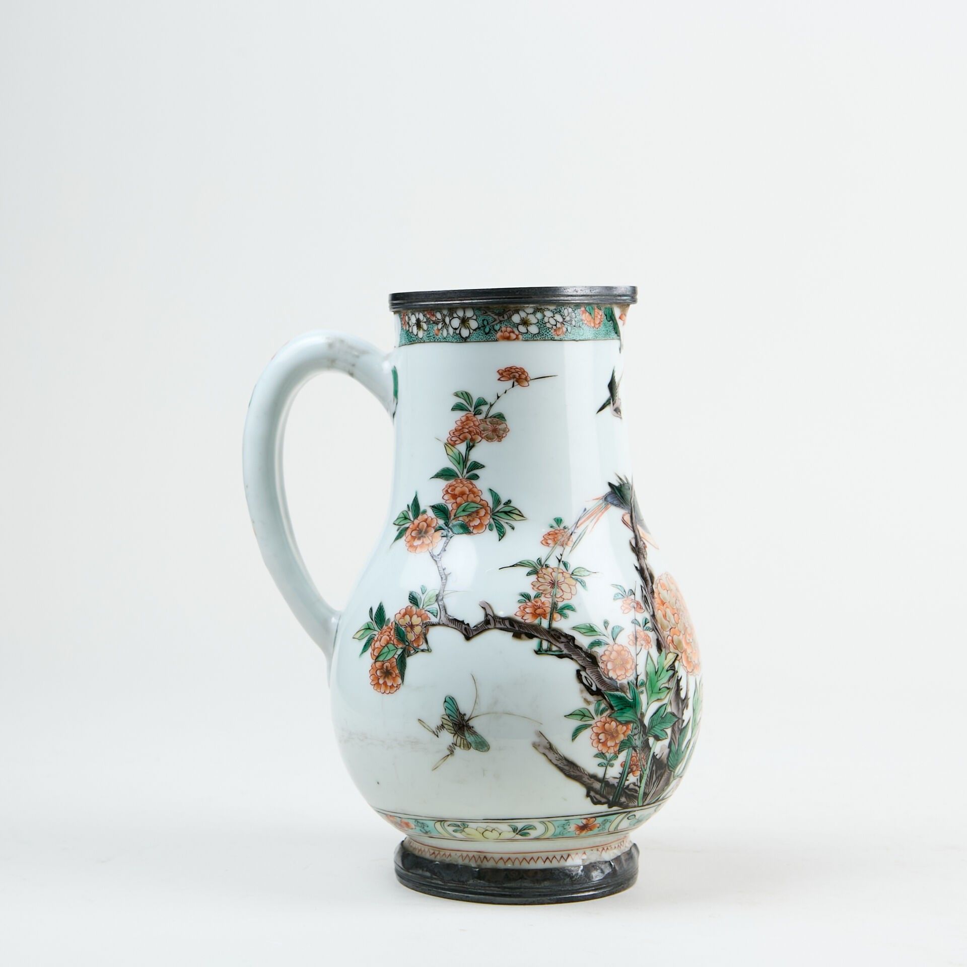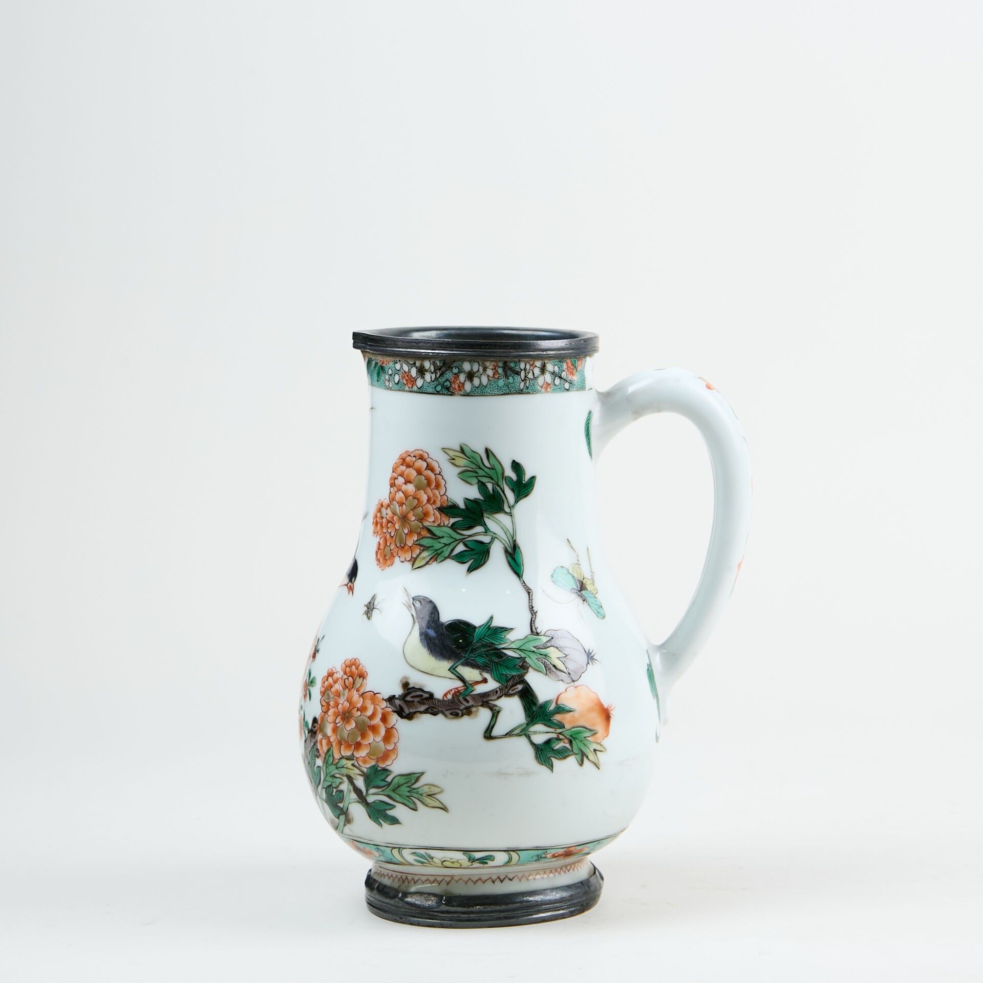 Porcelain baluster jug decorated with green family enamels of birds and flowers.