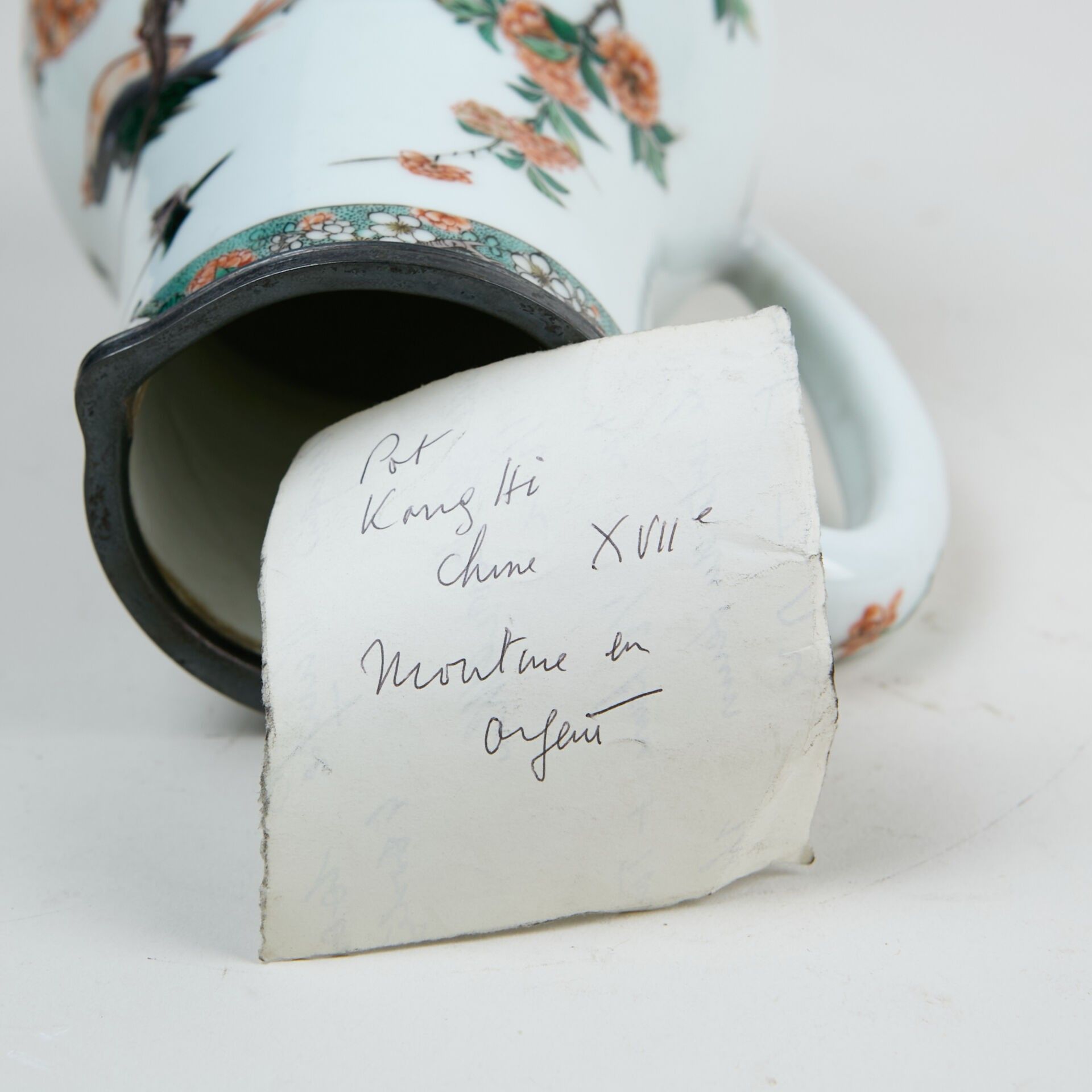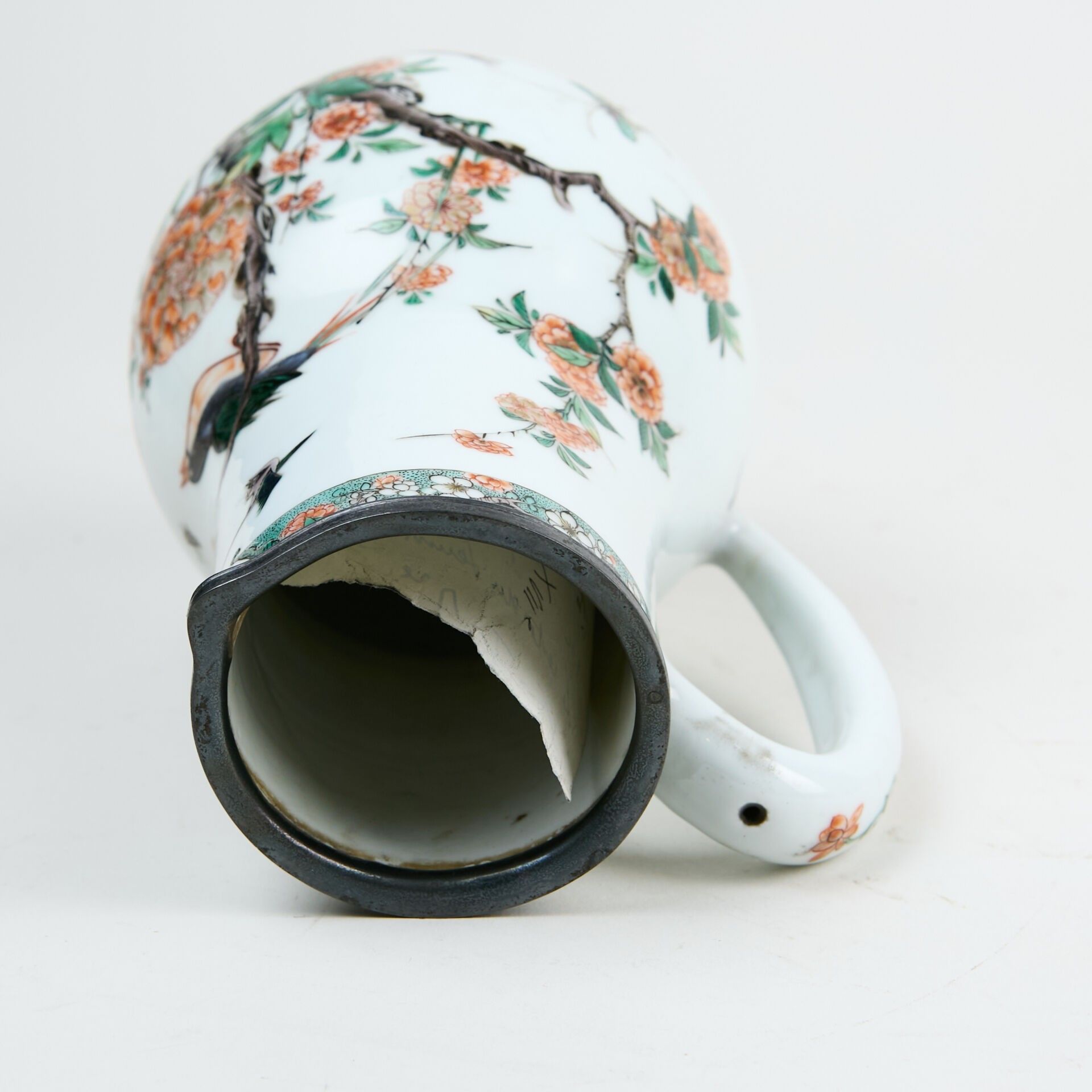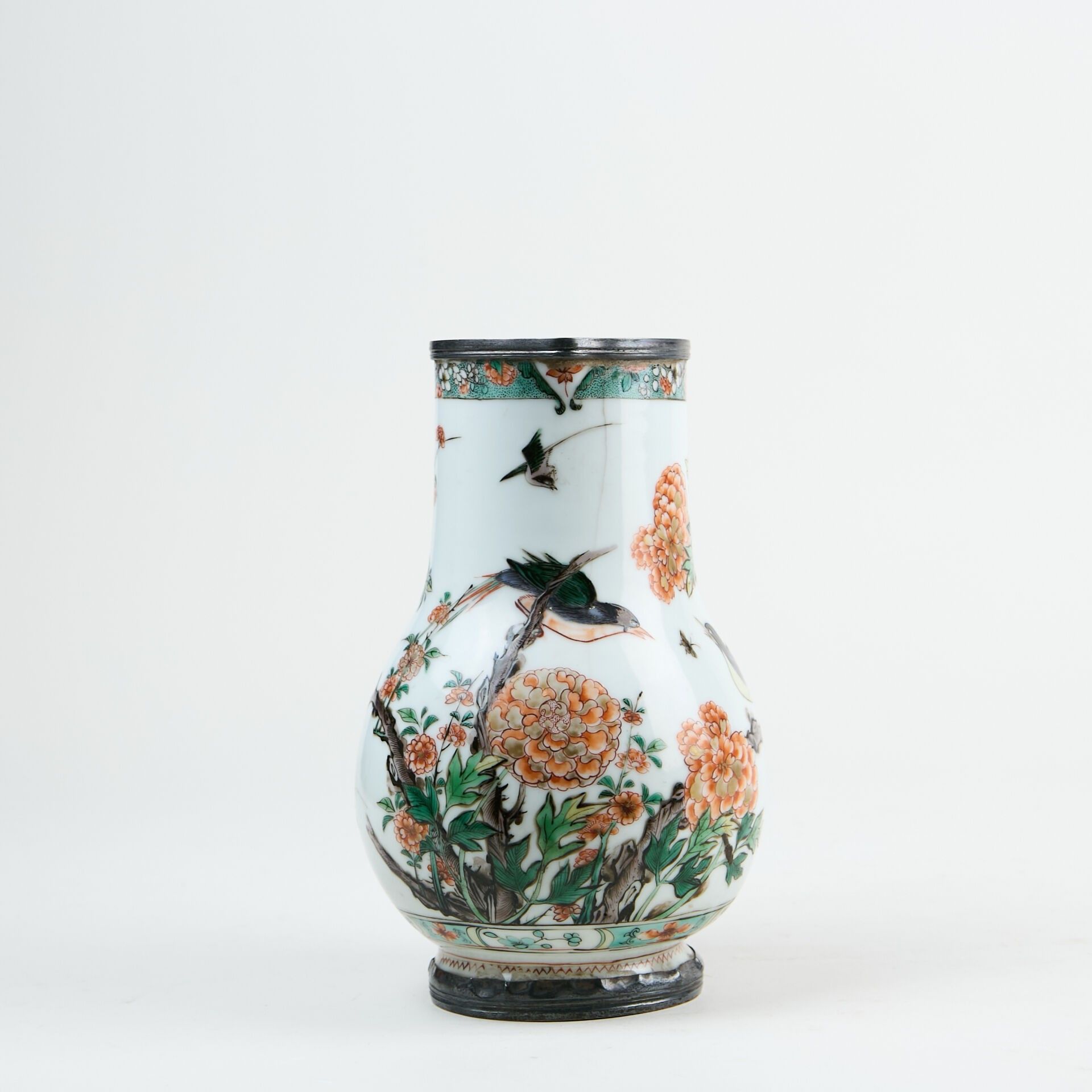 Porcelain baluster jug decorated with green family enamels of birds and flowers.