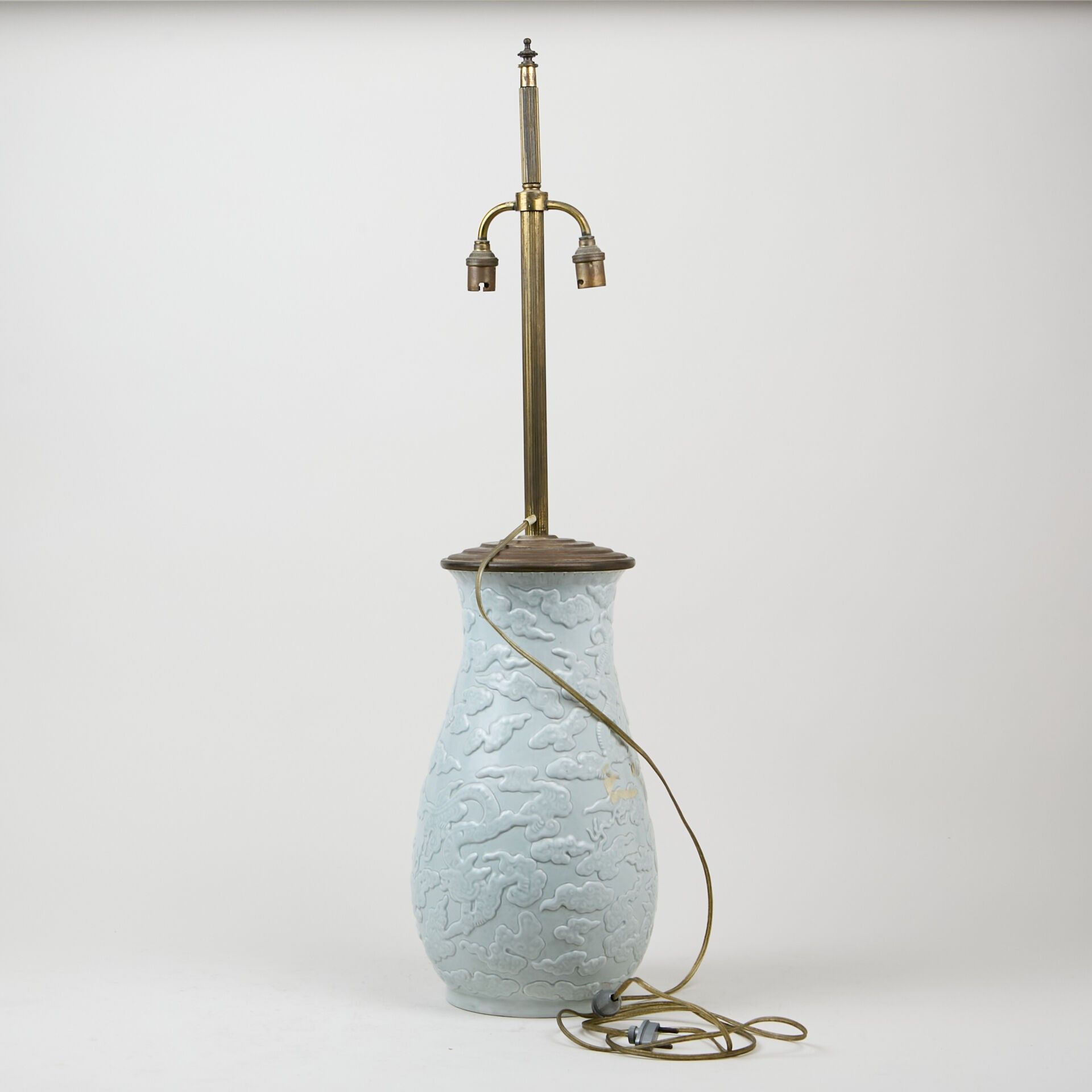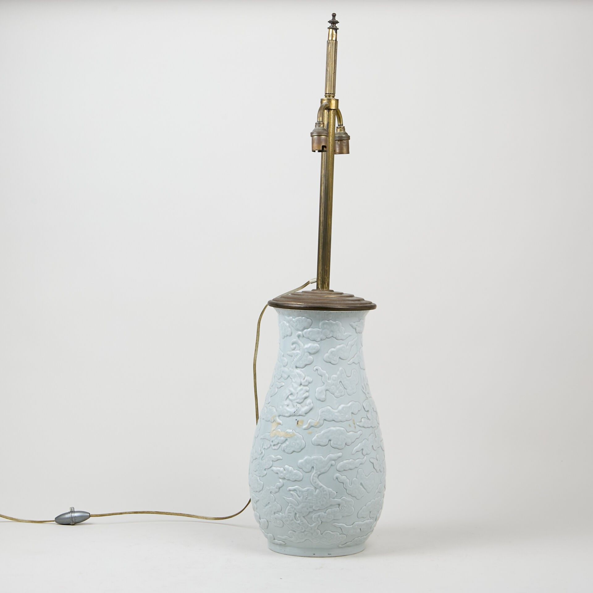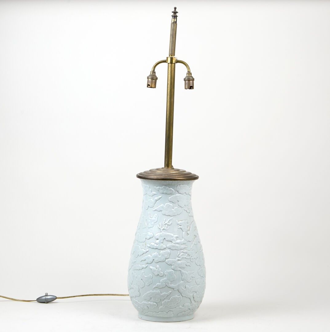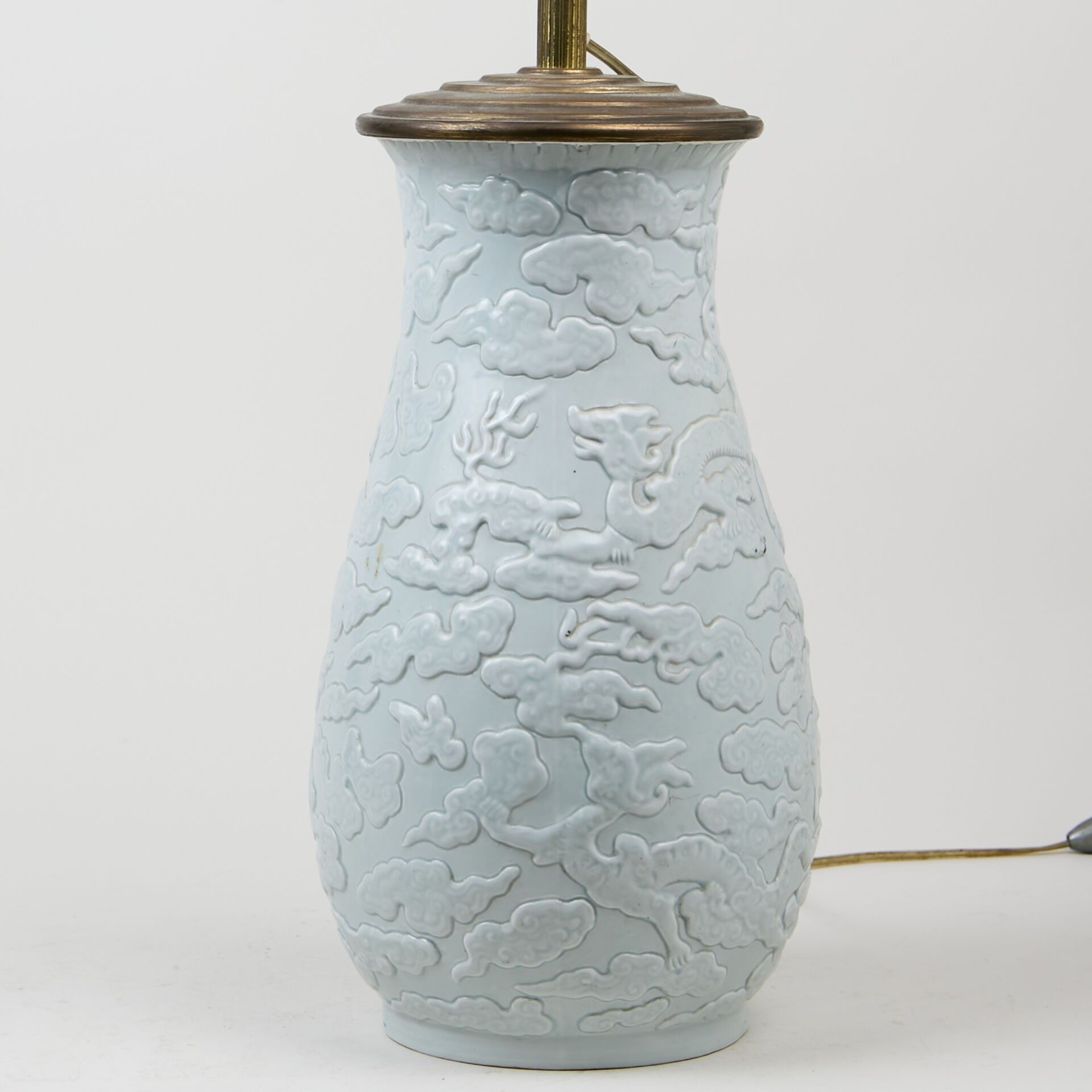 Celadon enamelled porcelain vase with moulded decoration of dragons among stylised clouds.