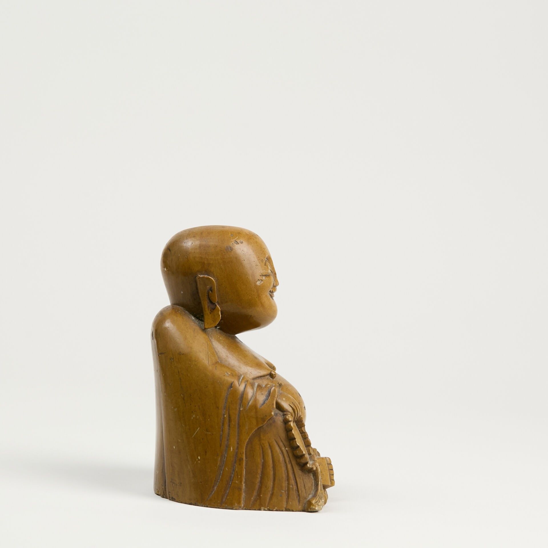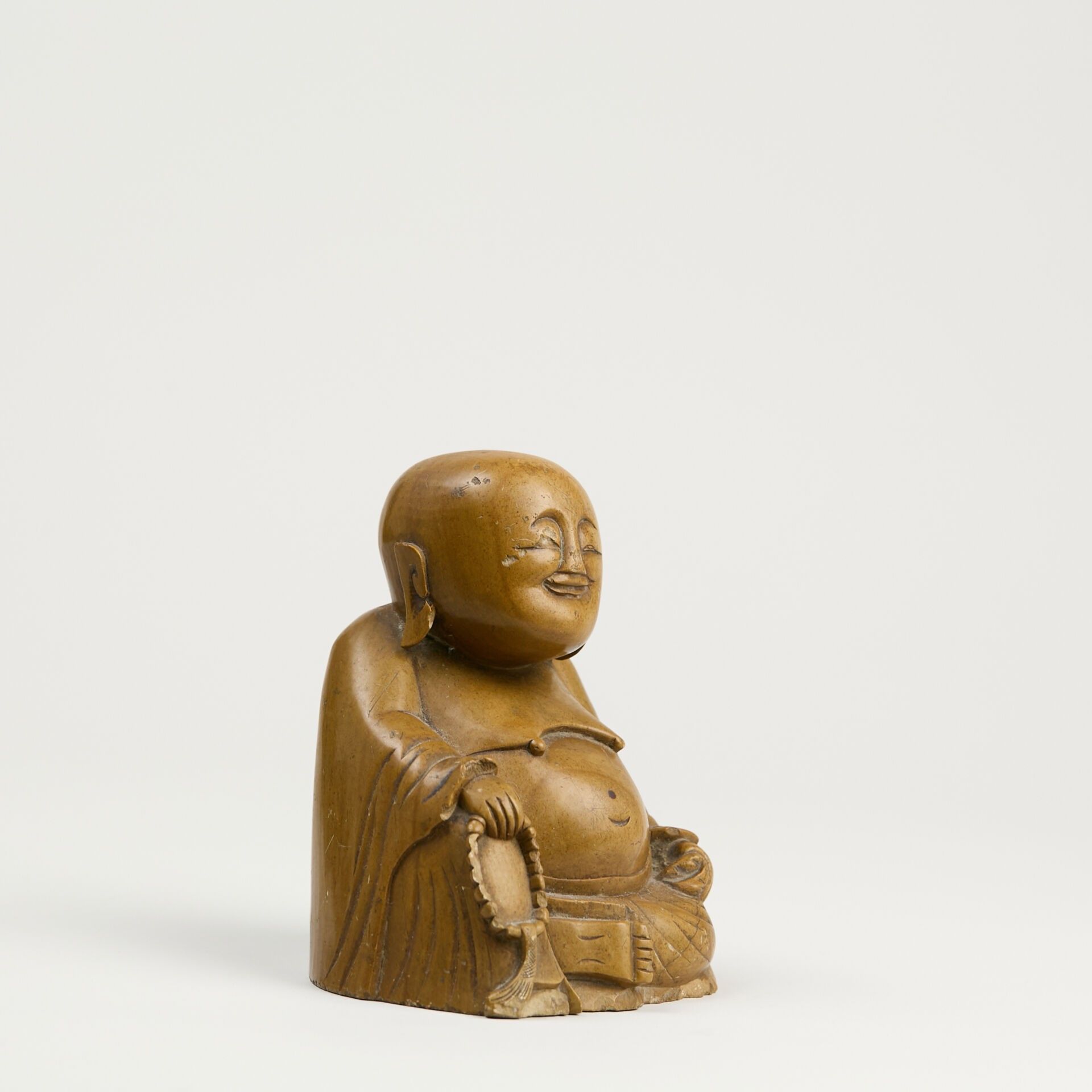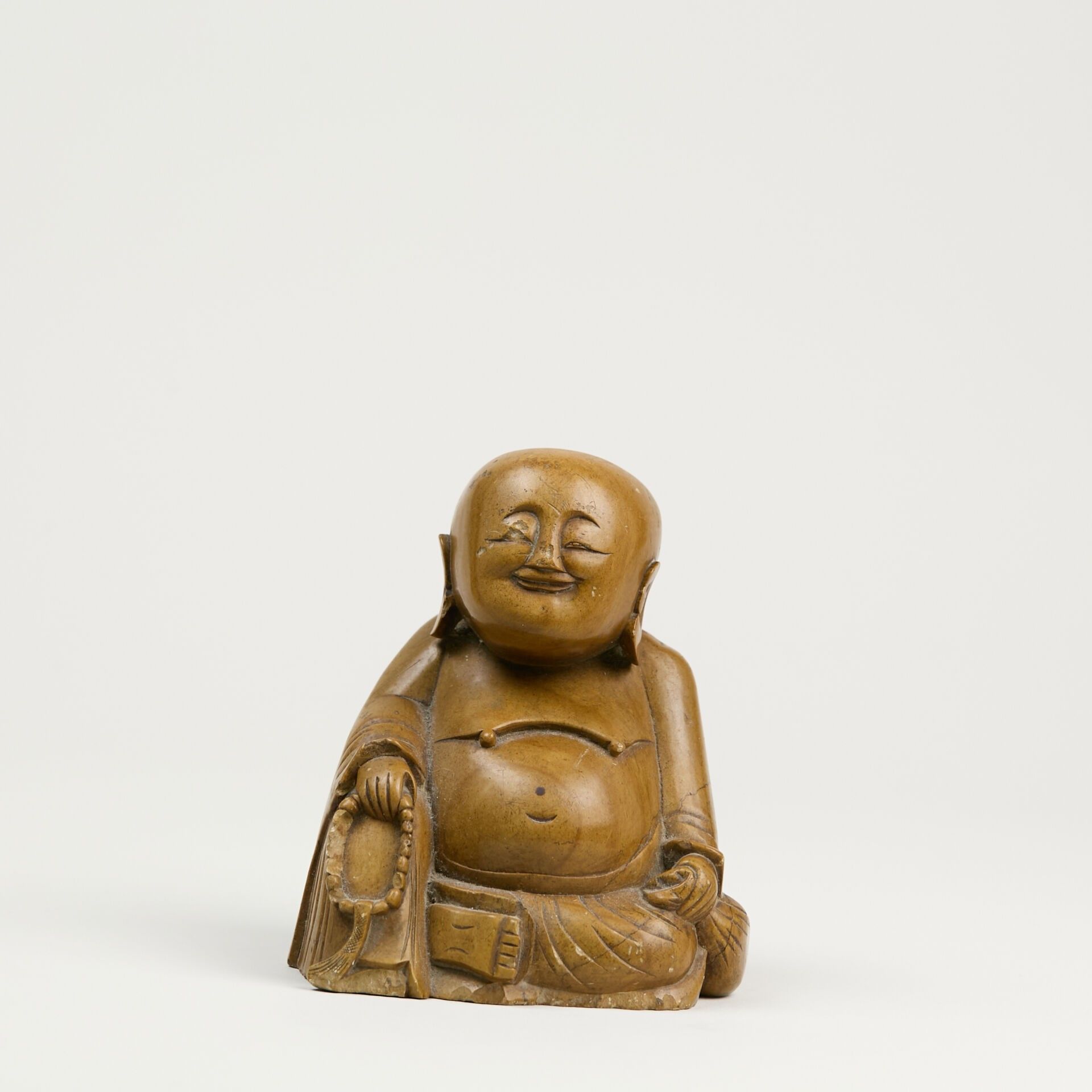 Honey-coloured stone statuette representing the milefo Buddha, holding the rosary and his bag of riches.