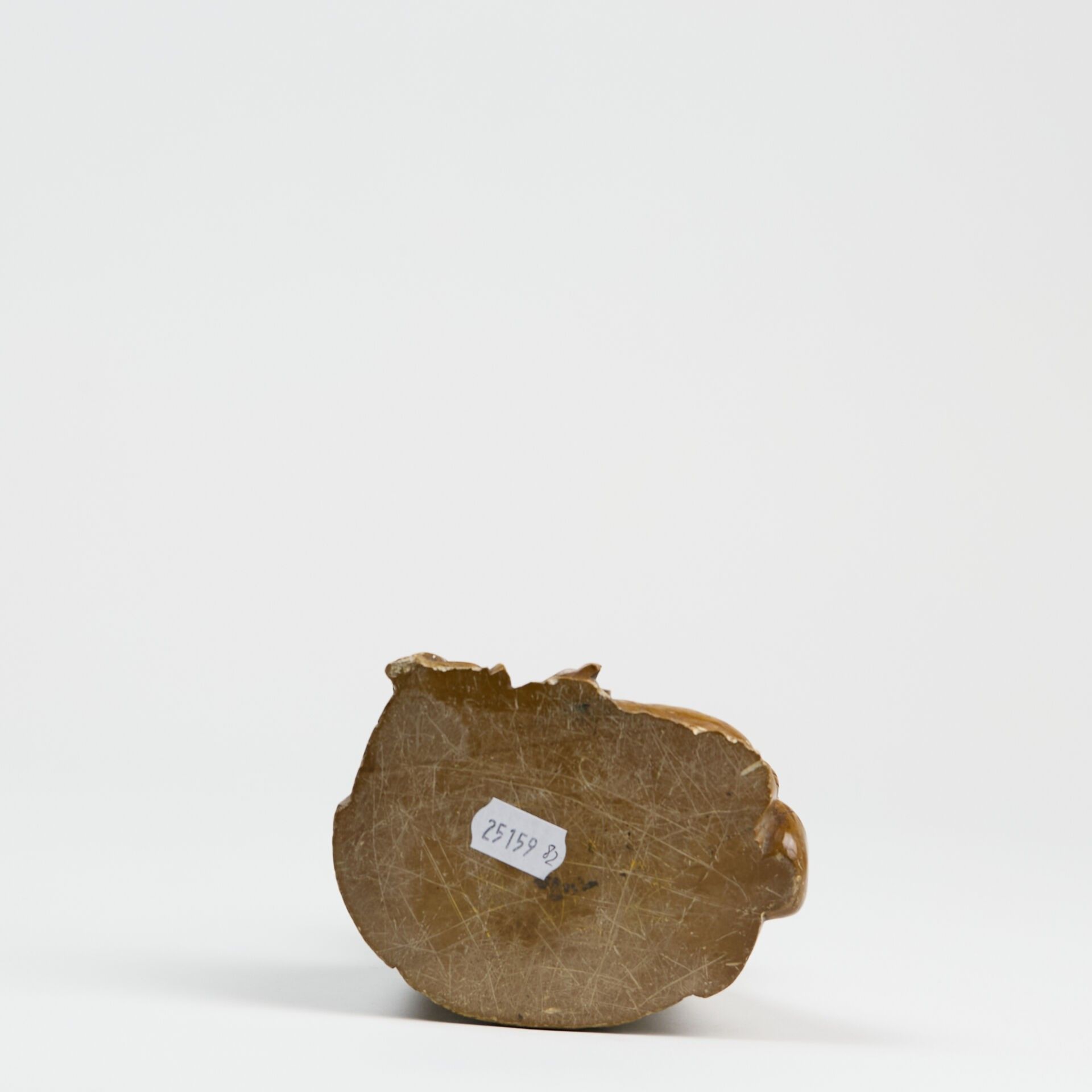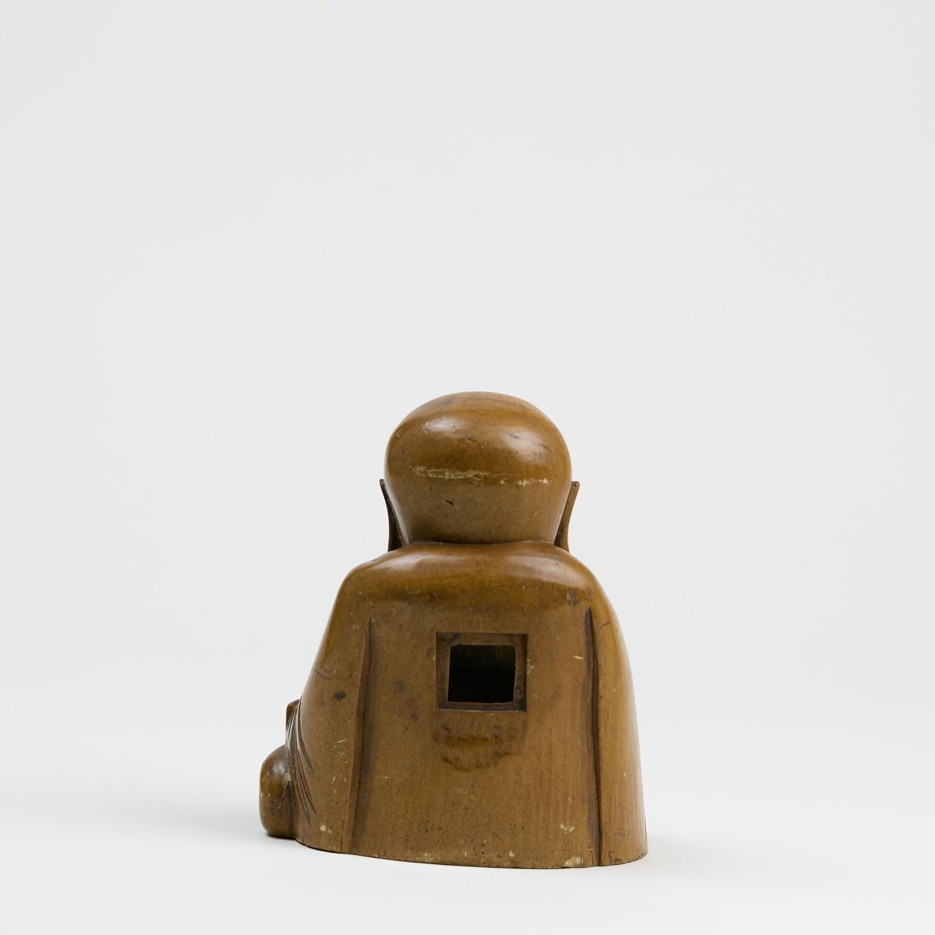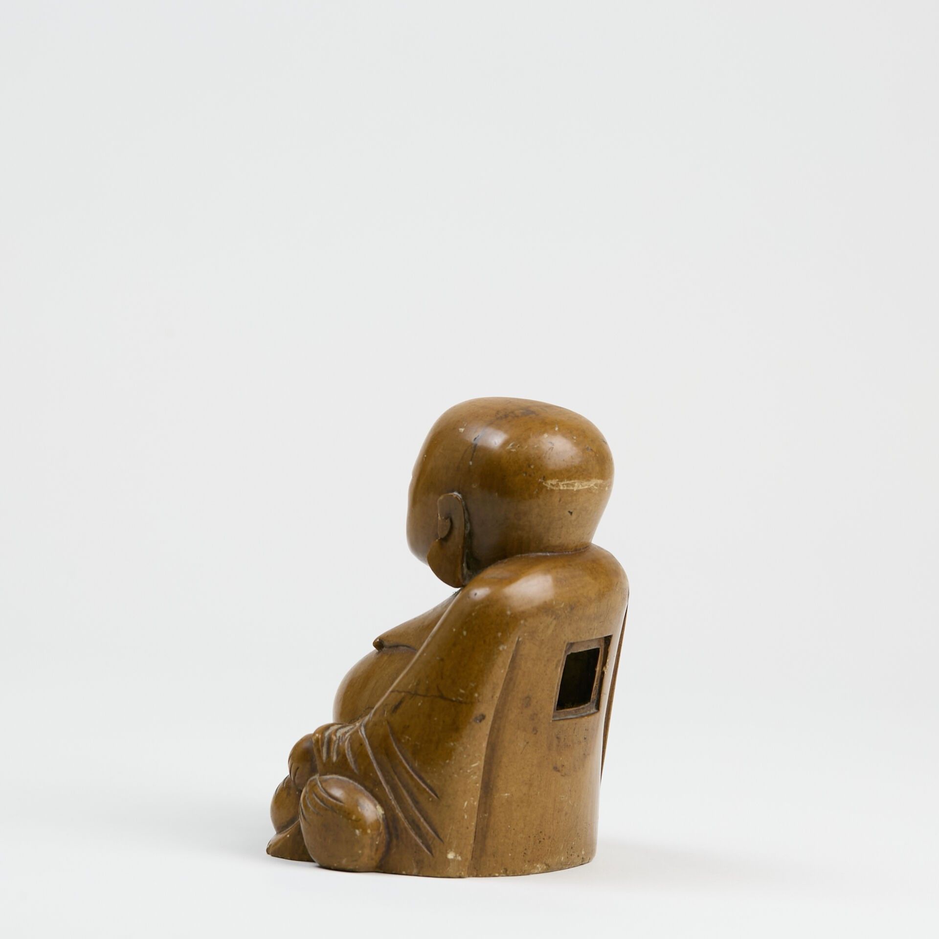 Honey-coloured stone statuette representing the milefo Buddha, holding the rosary and his bag of riches.