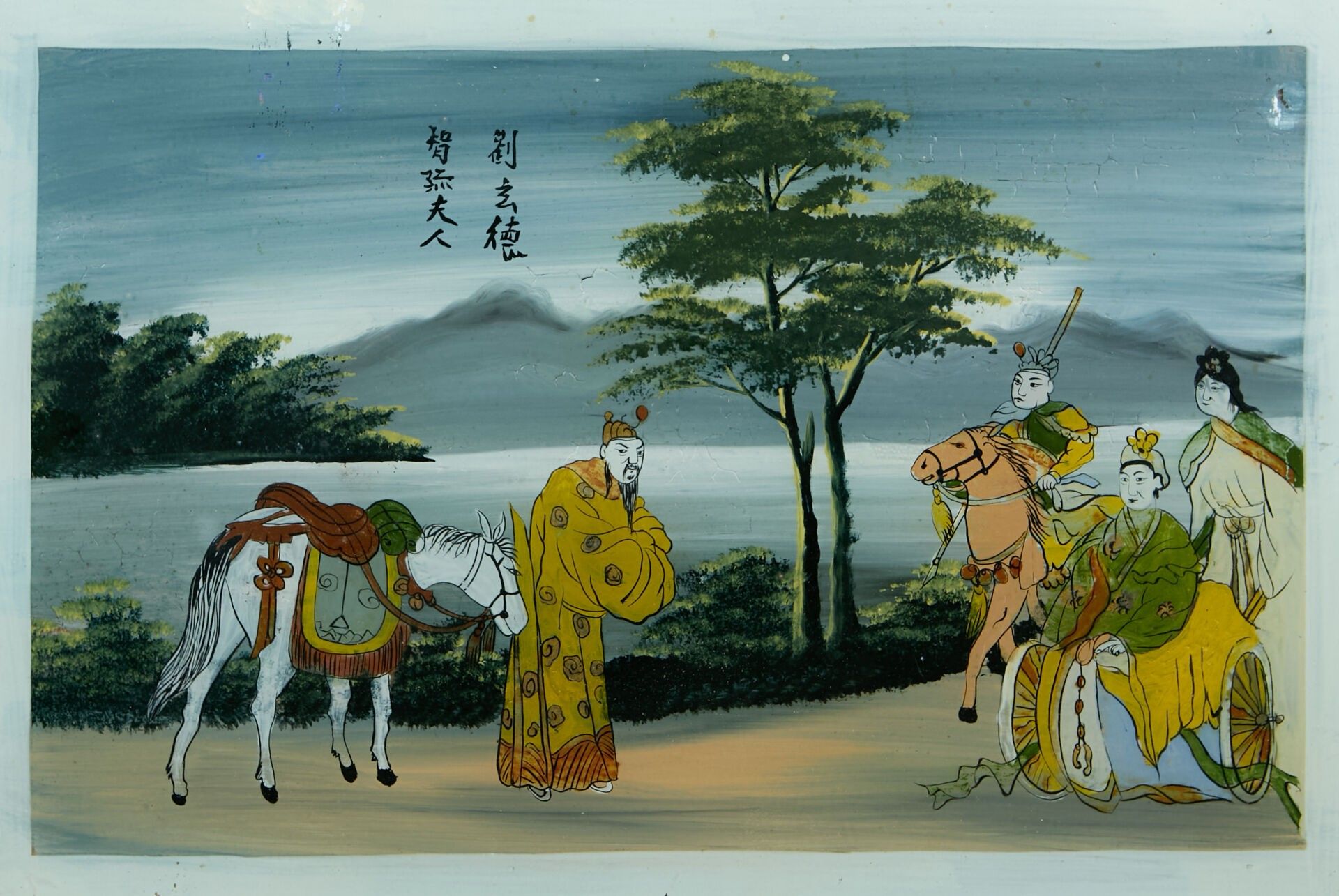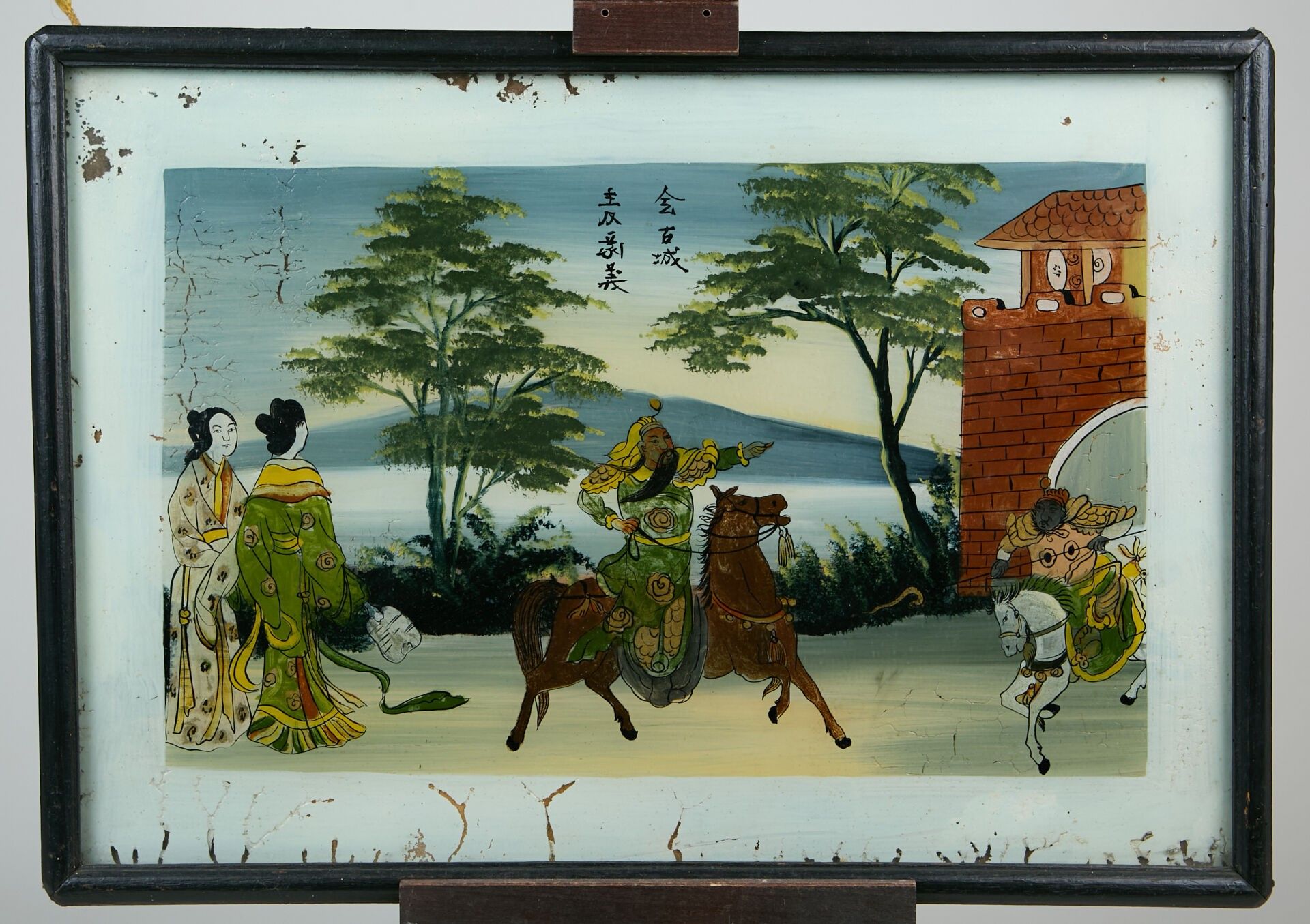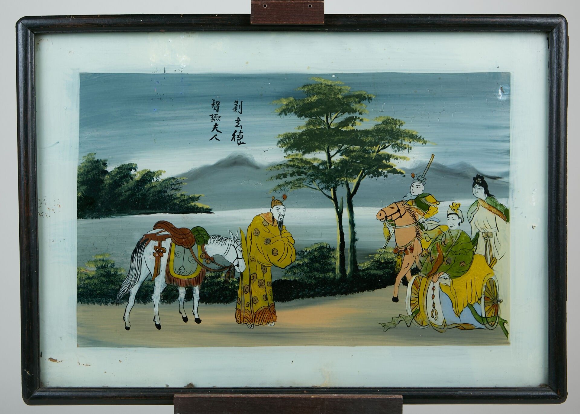 Pair of glass plaques with polychrome decoration of dignitaries surrounded by court ladies and servants.
