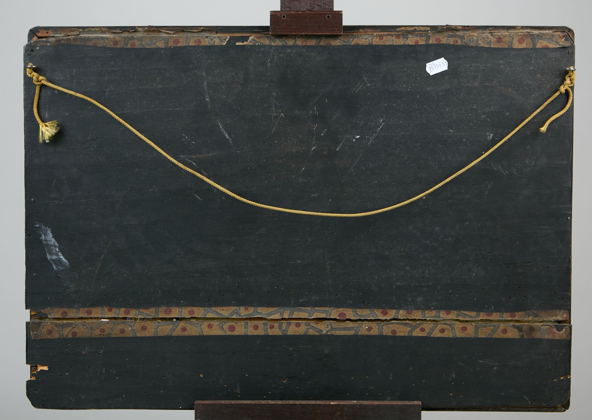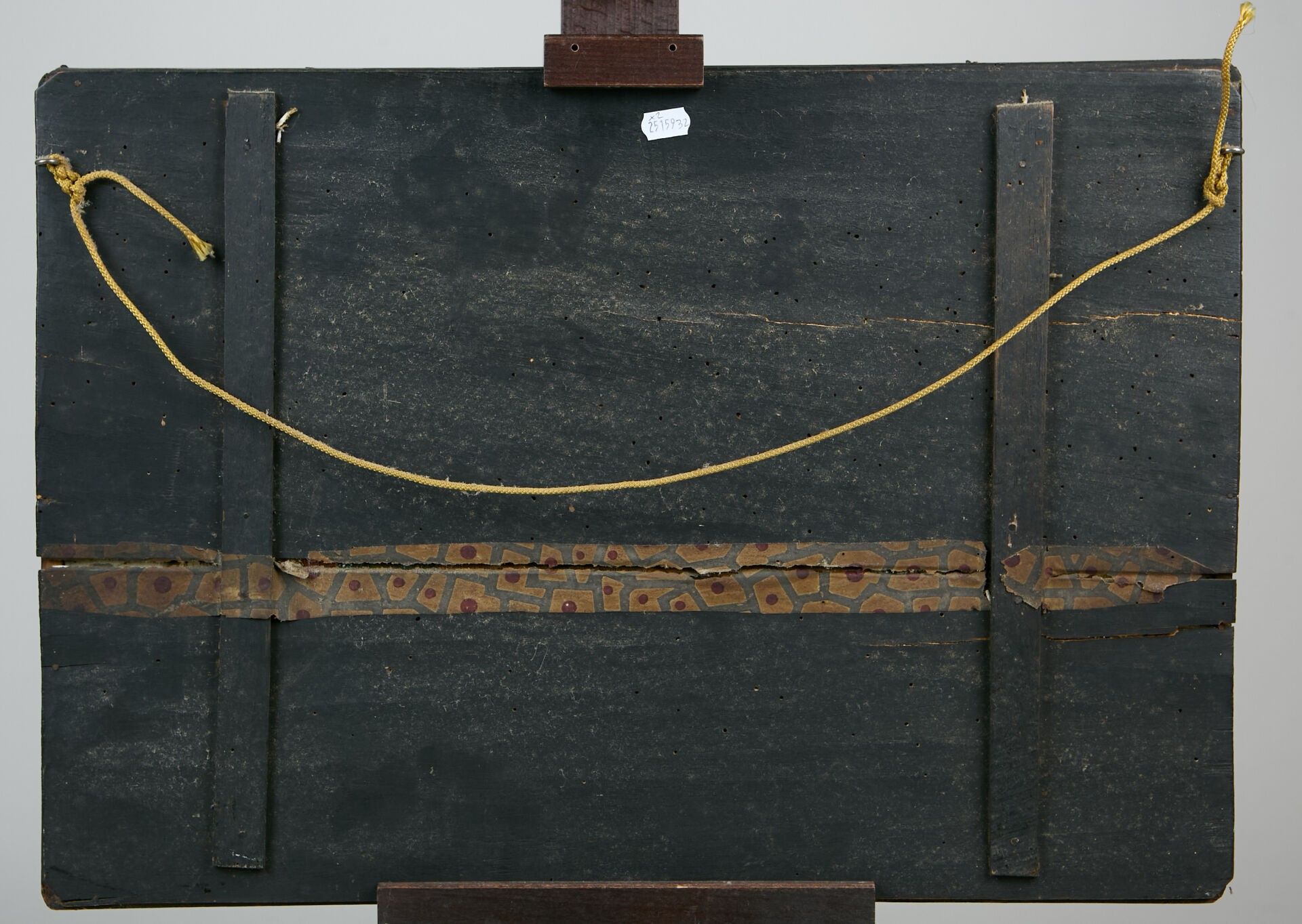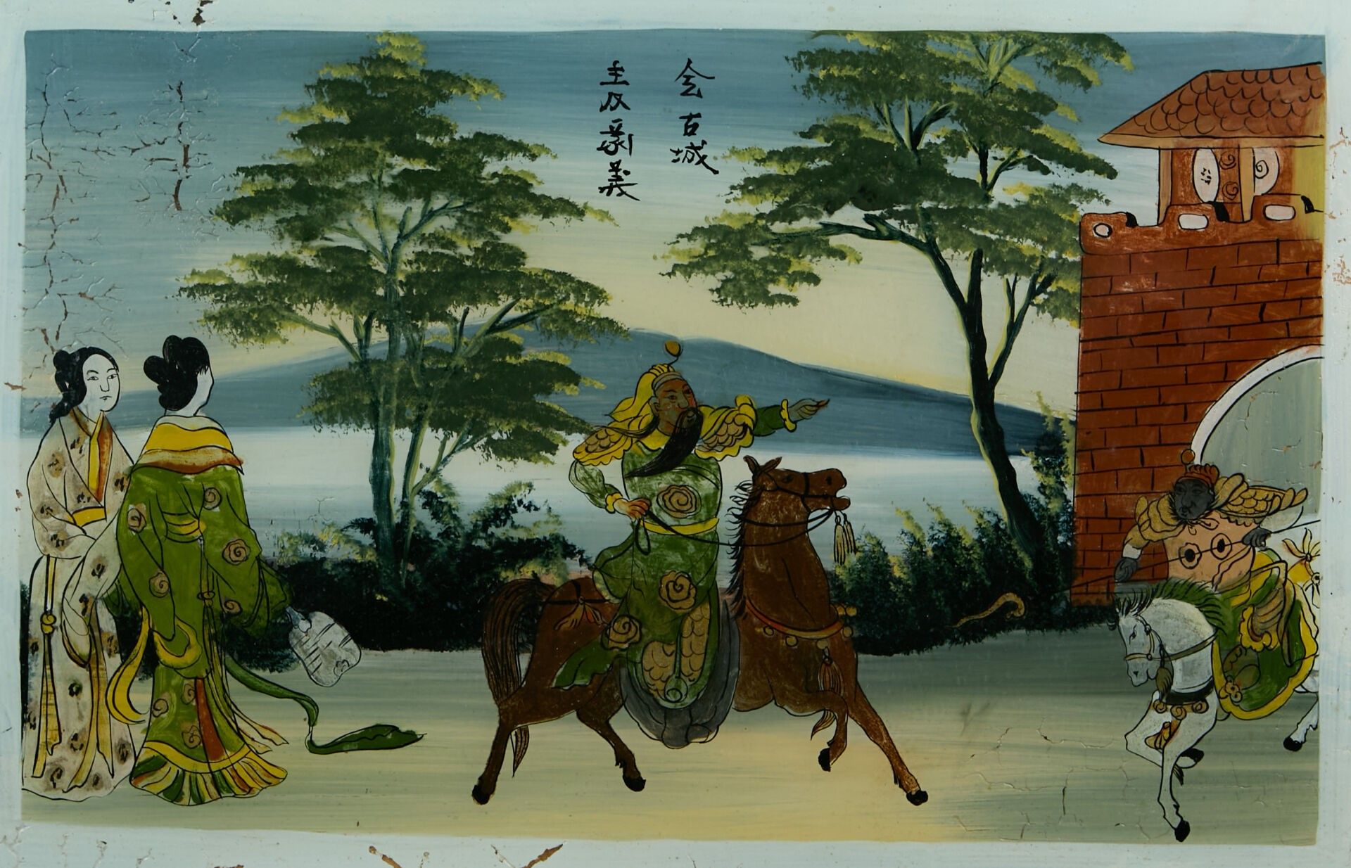 Pair of glass plaques with polychrome decoration of dignitaries surrounded by court ladies and servants.