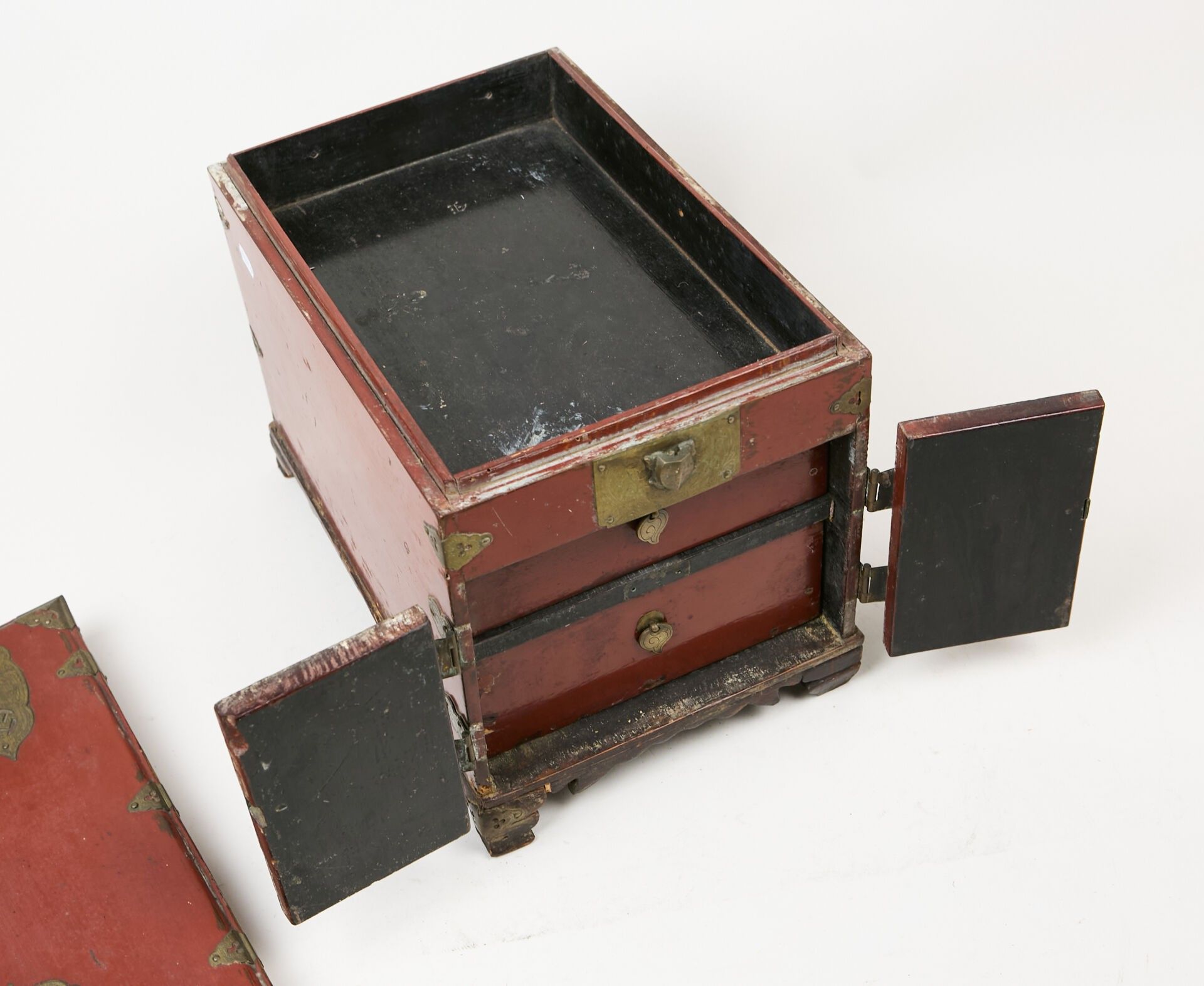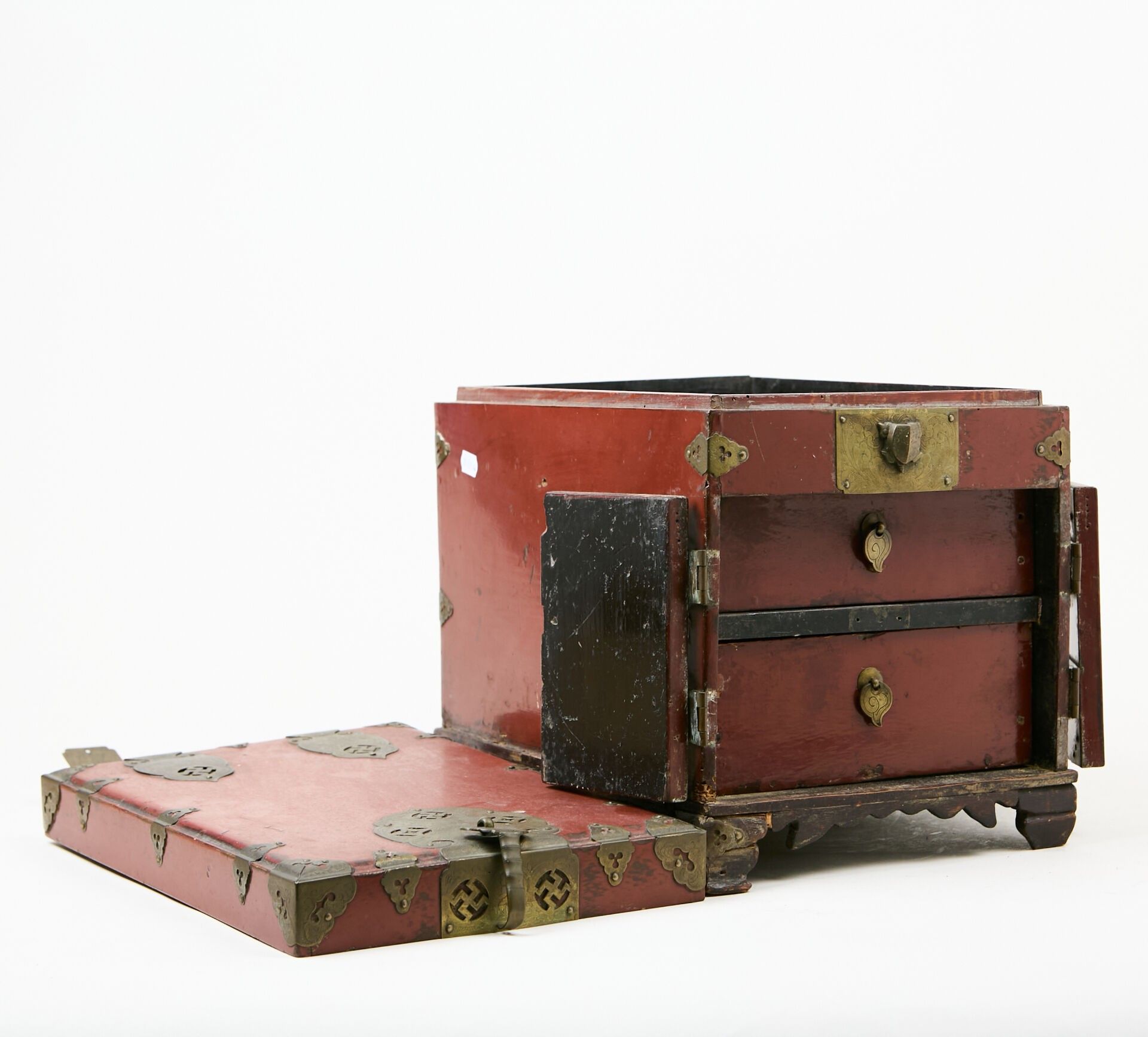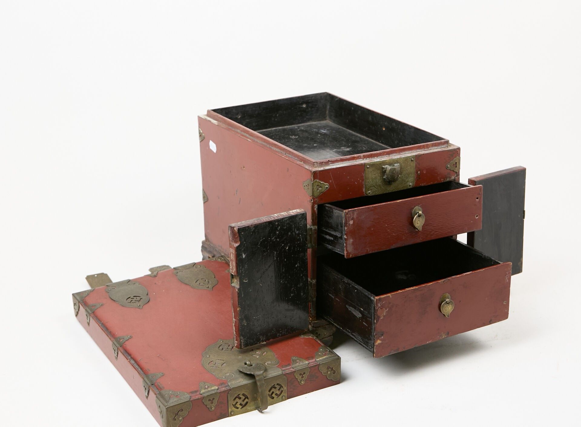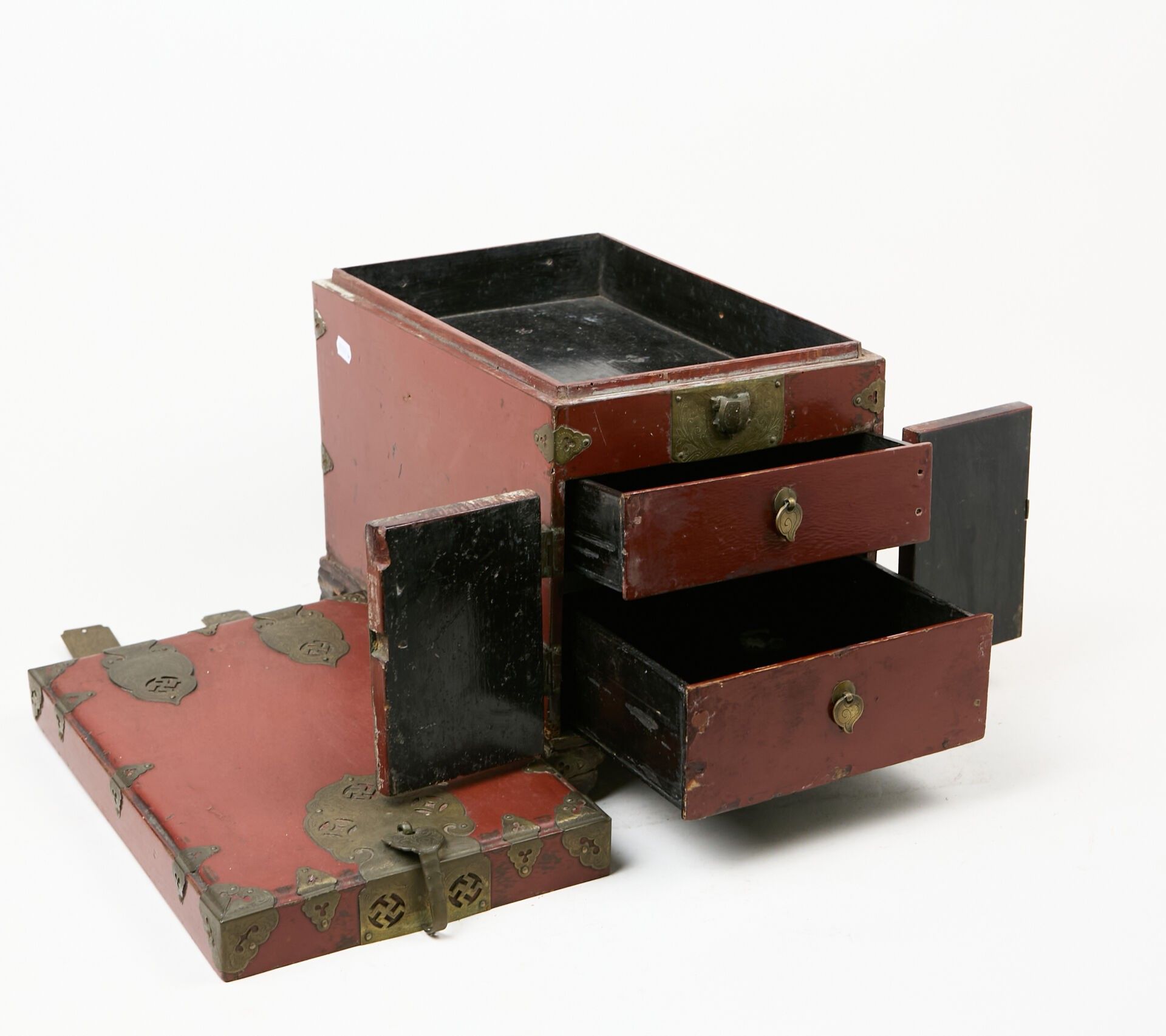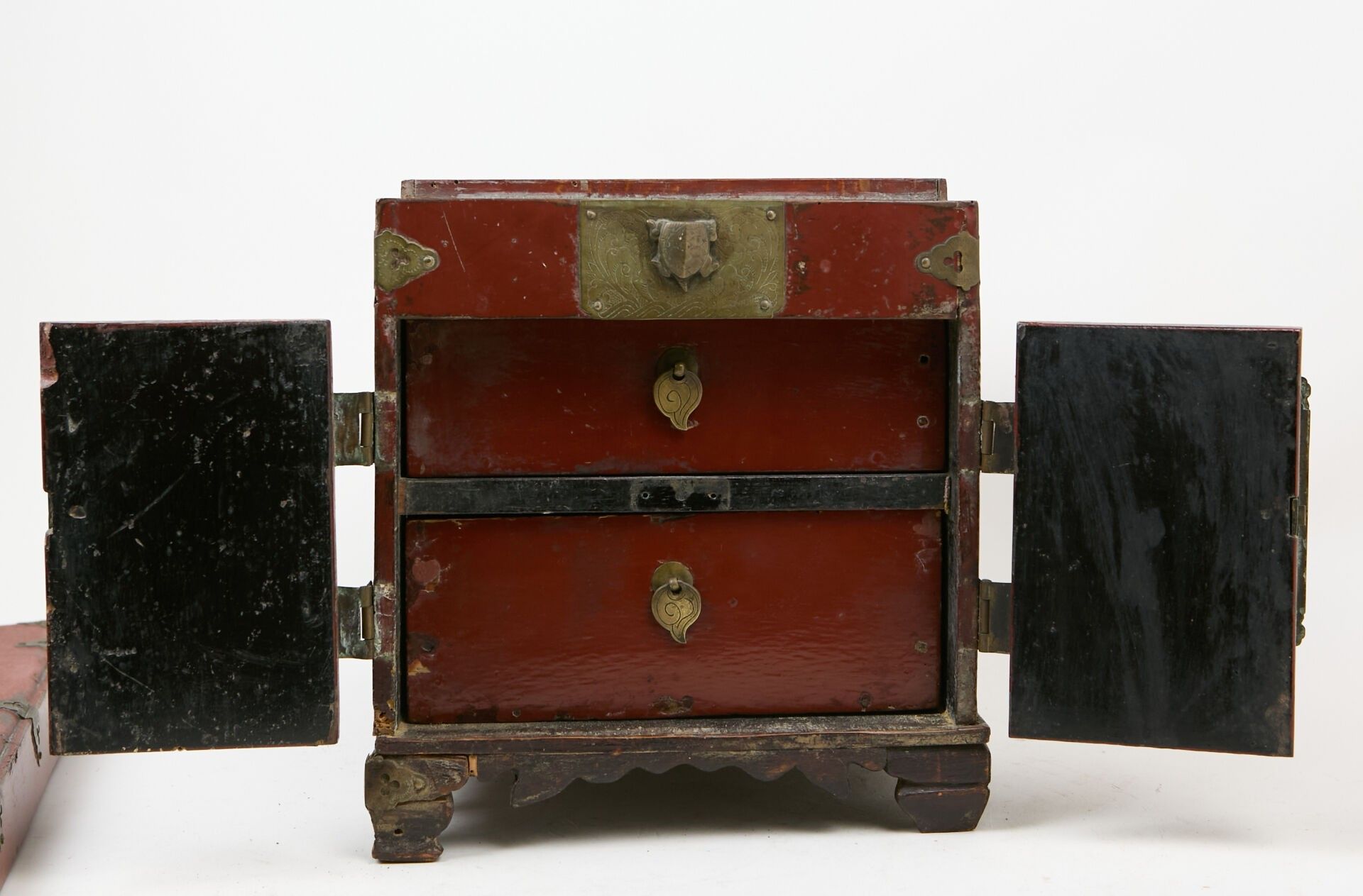Jewellery box with two doors, opening on two drawers in red lacquer.