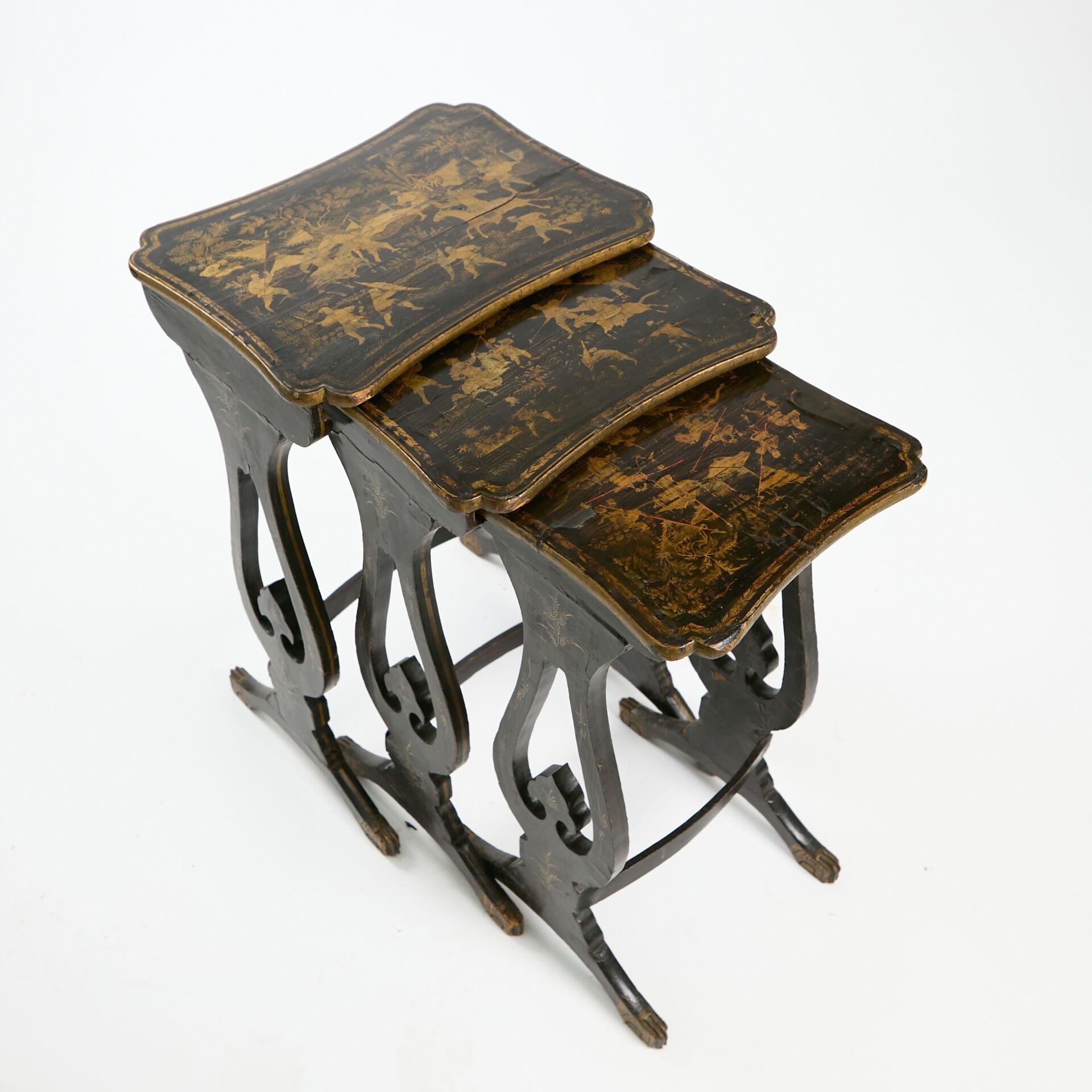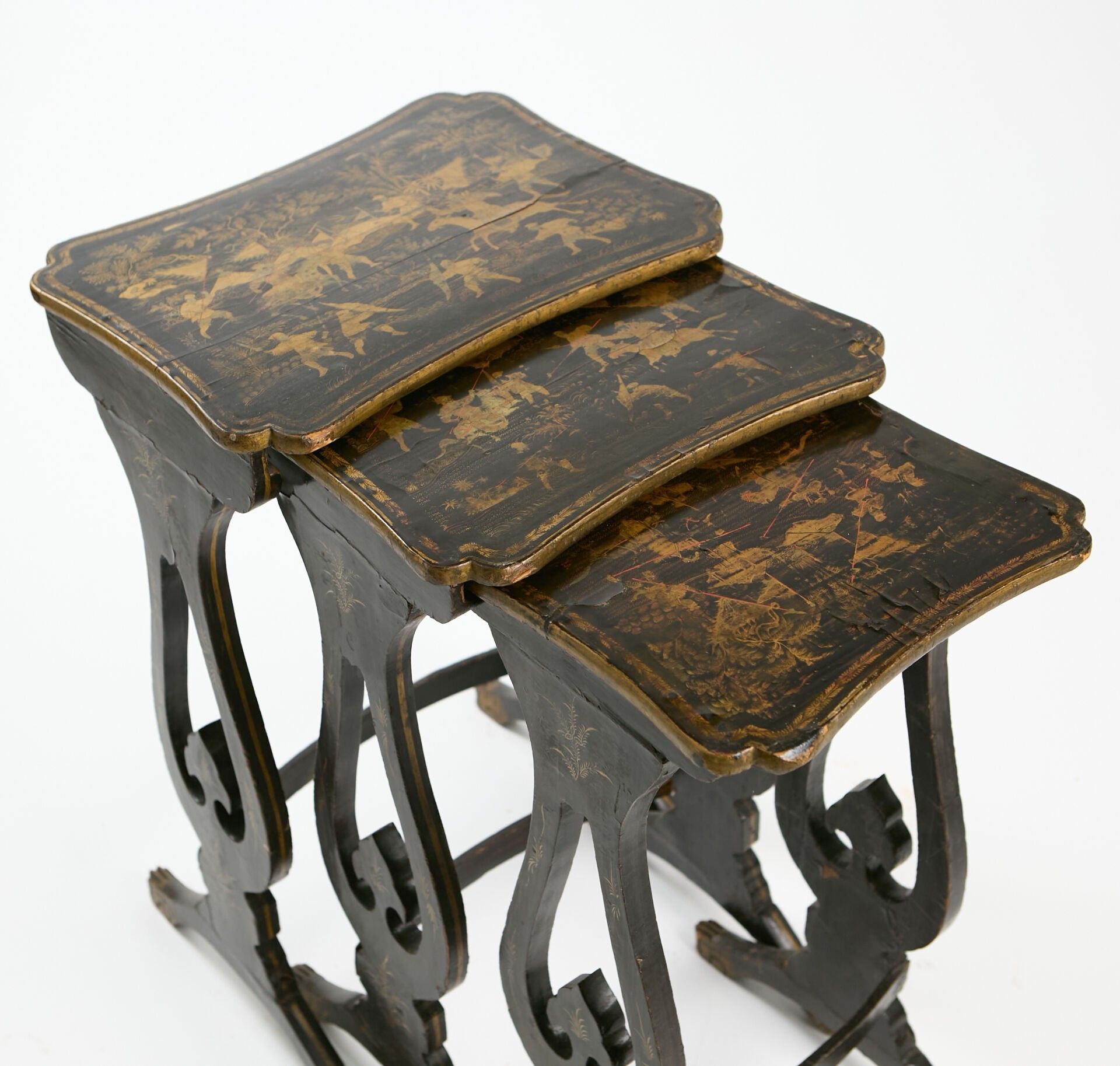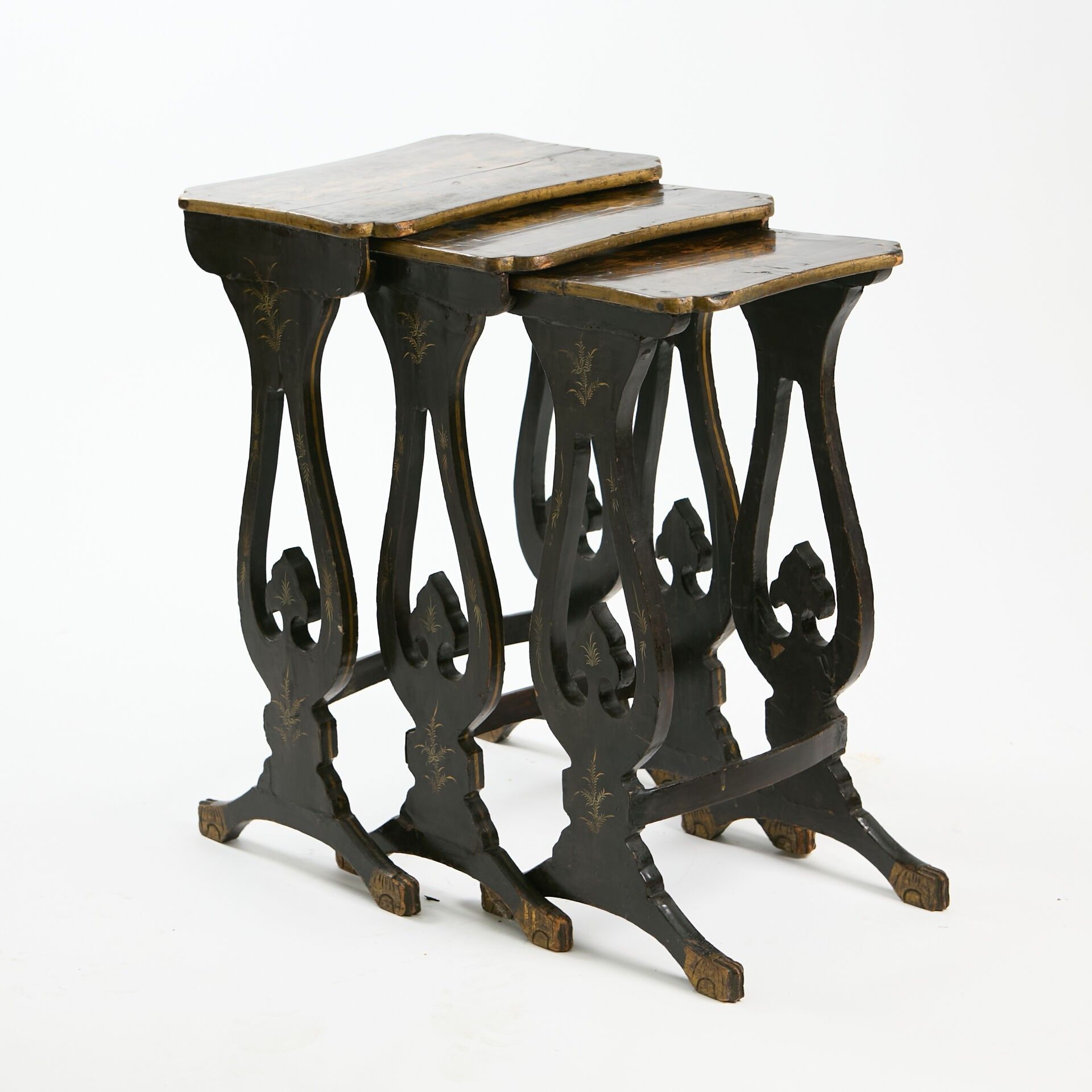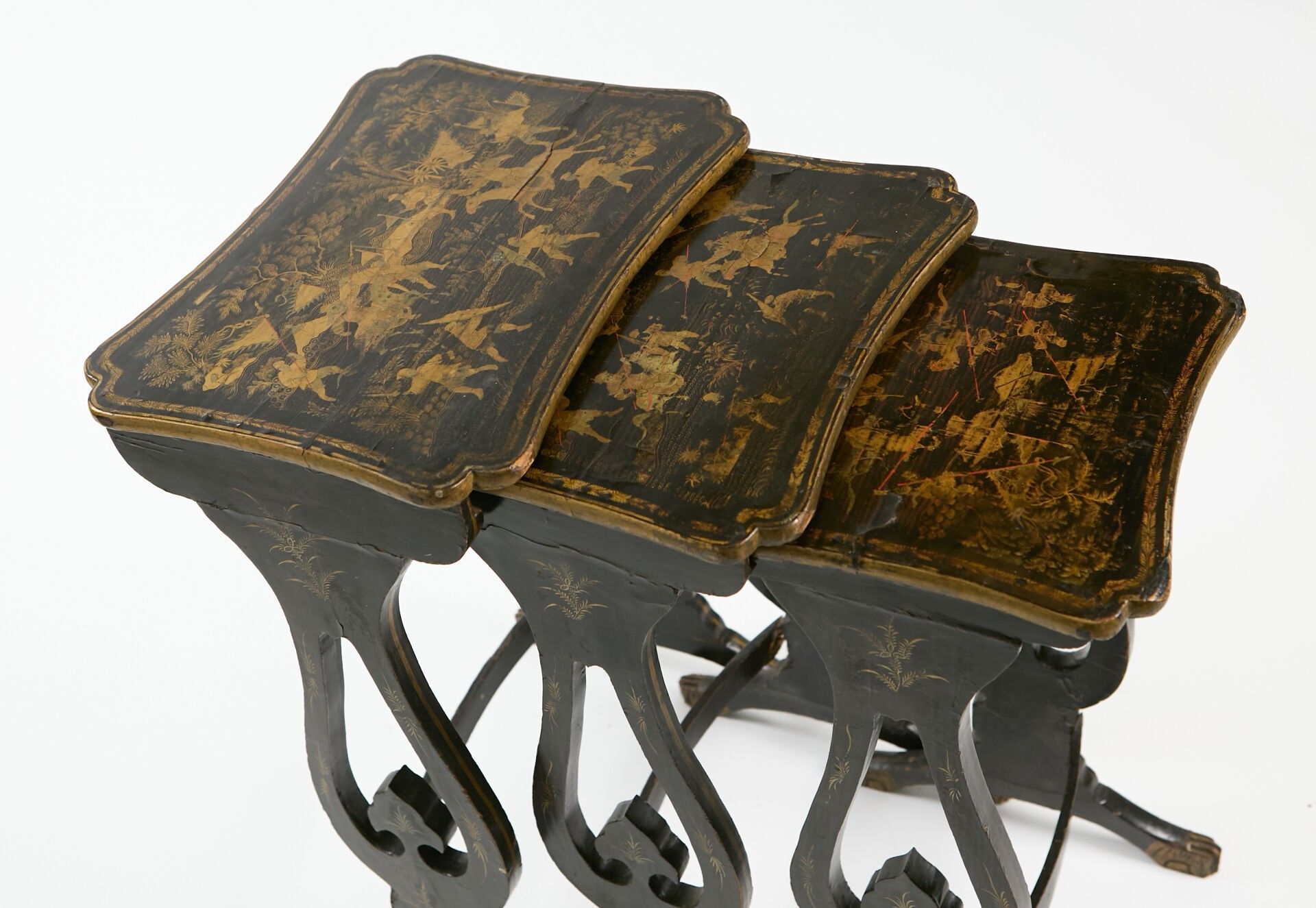 Anglo-Chinese work, circa 1880 Three nesting tables in gold lacquered wood on a black background, decorated with battle scenes. 69 x 43 x 33 cm (largest) Expert : Cabinet ANSAS, PAPILLON, DE LERY - Paris - Expert : ANSAS,PAPILLON,DE LERY