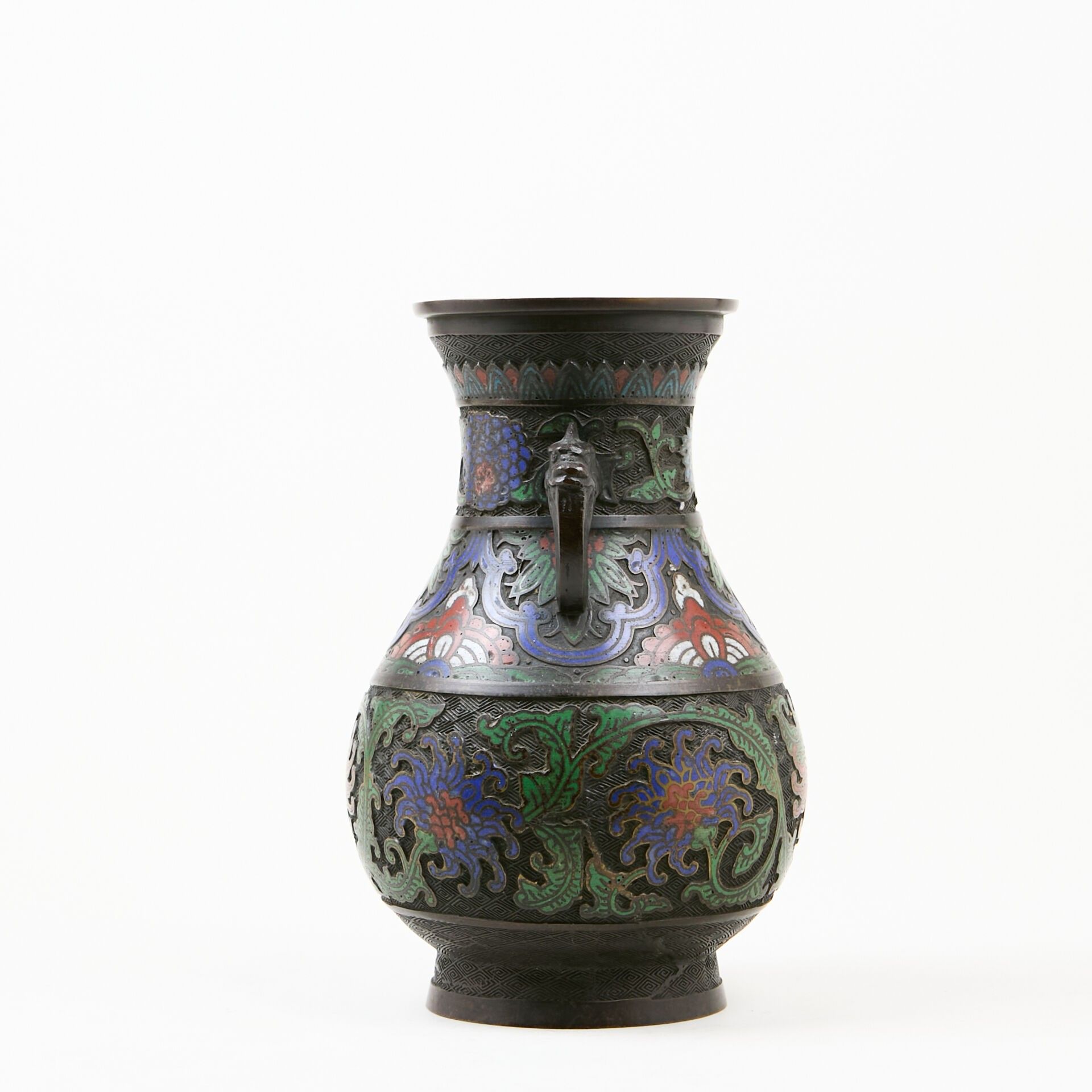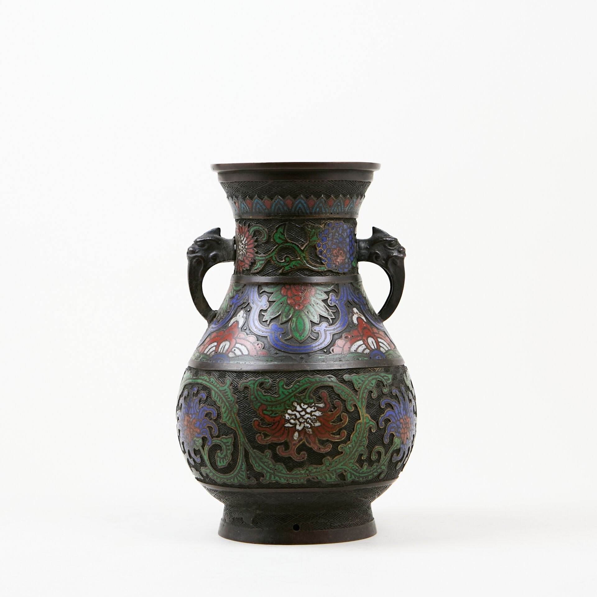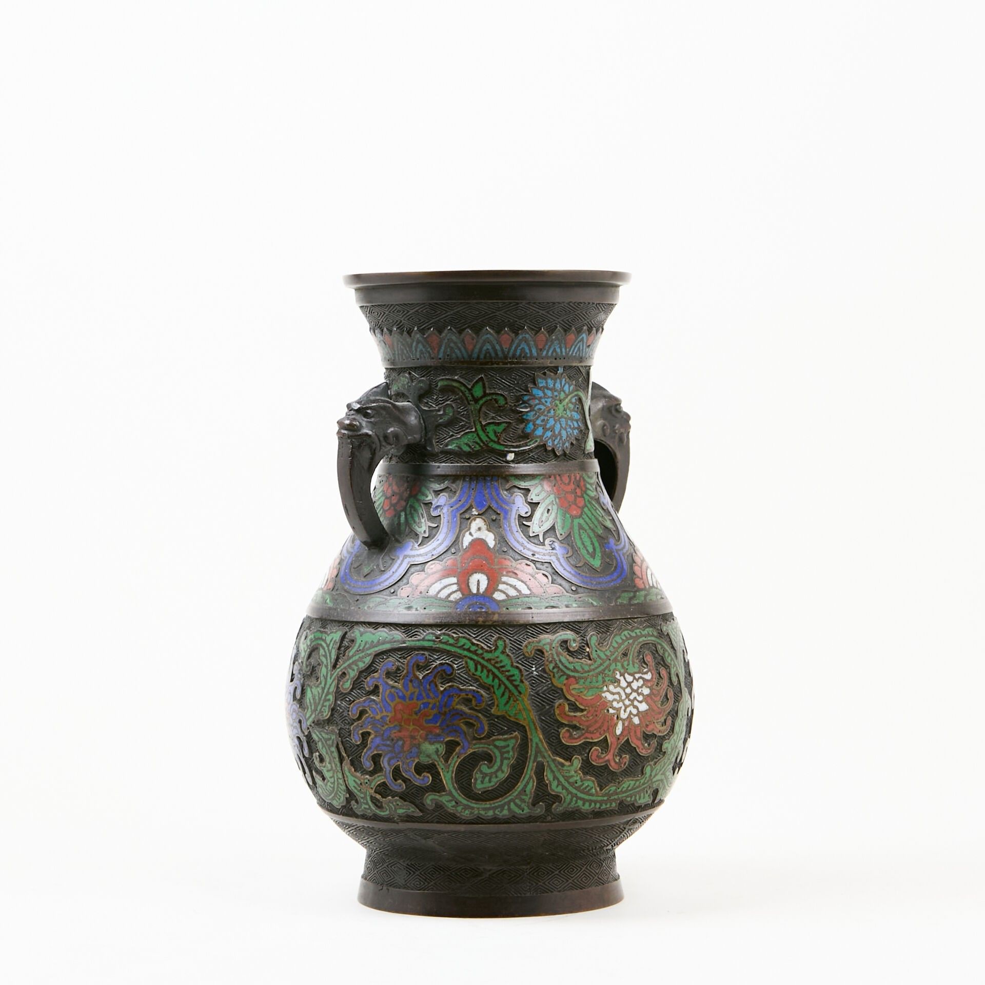 A bronze and champlevé enamel baluster vase with two handles depicting kirin heads and polychrome decoration of lotus flowers.