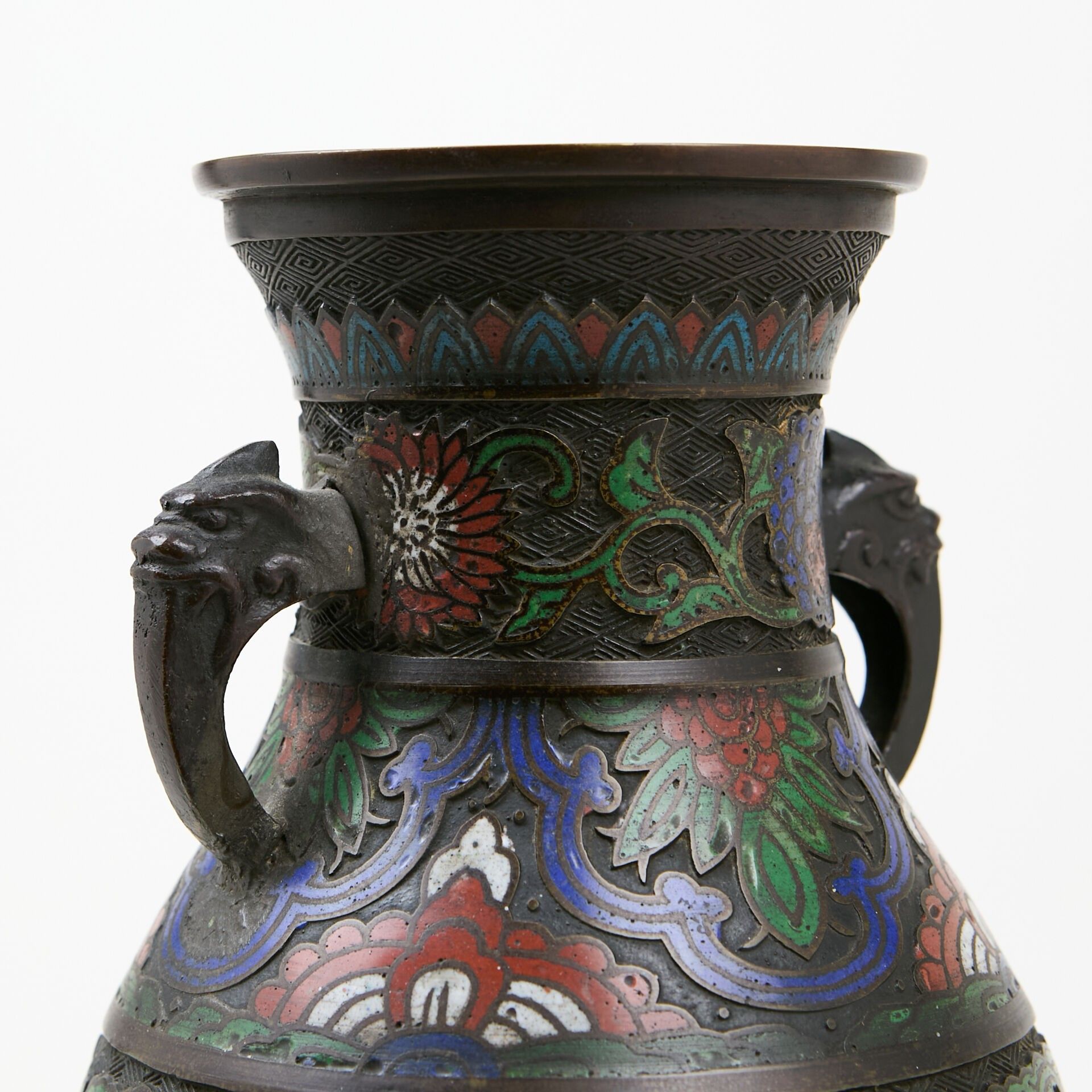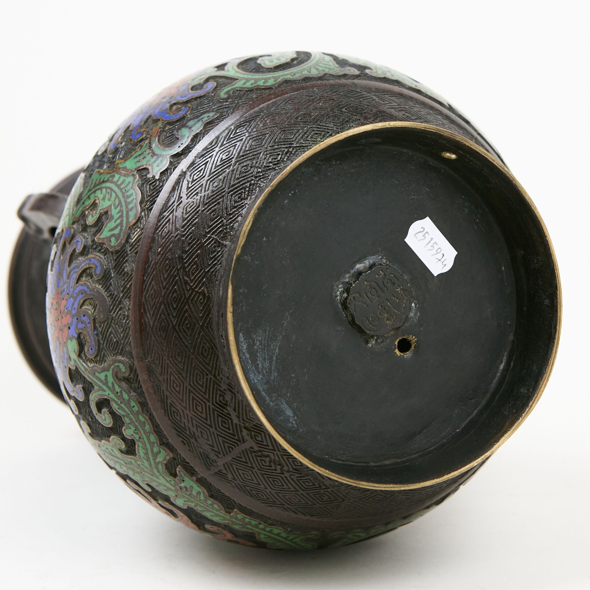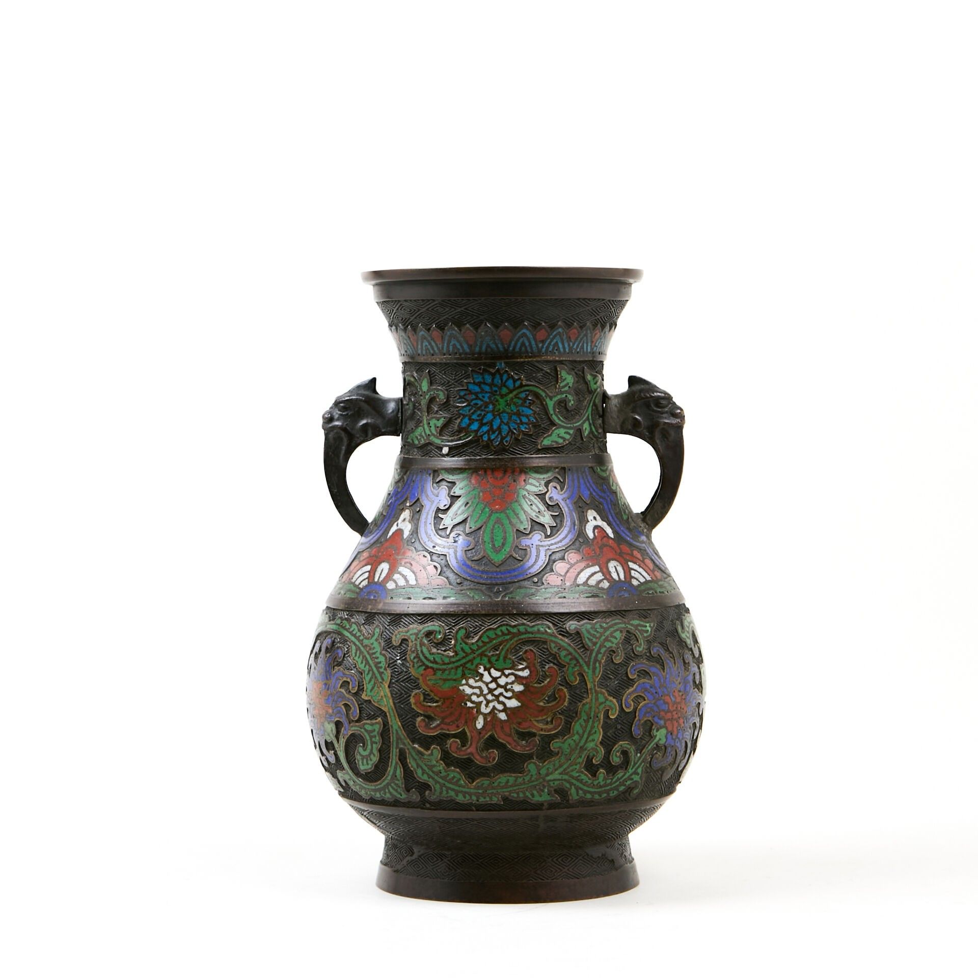 A bronze and champlevé enamel baluster vase with two handles depicting kirin heads and polychrome decoration of lotus flowers.