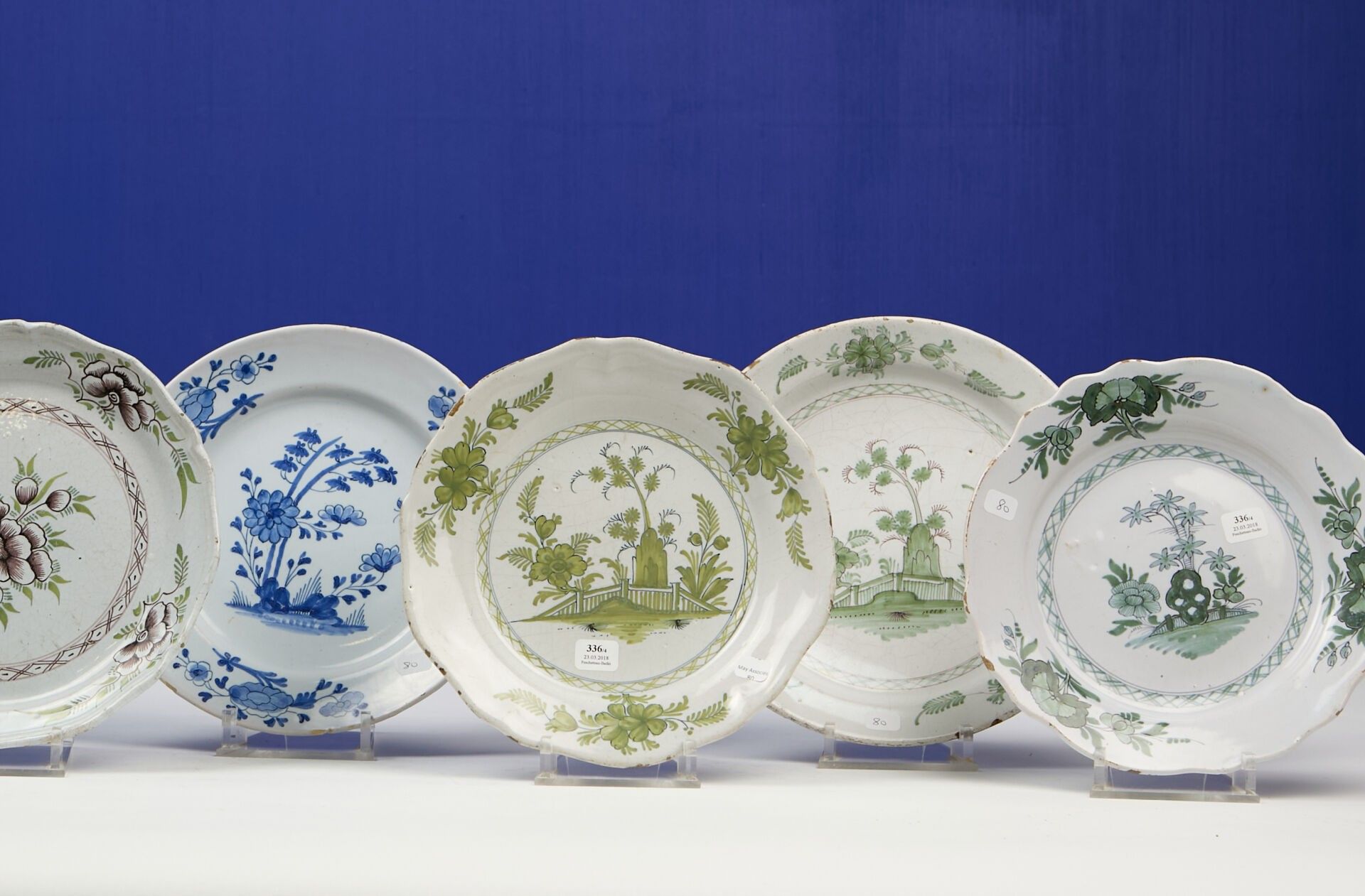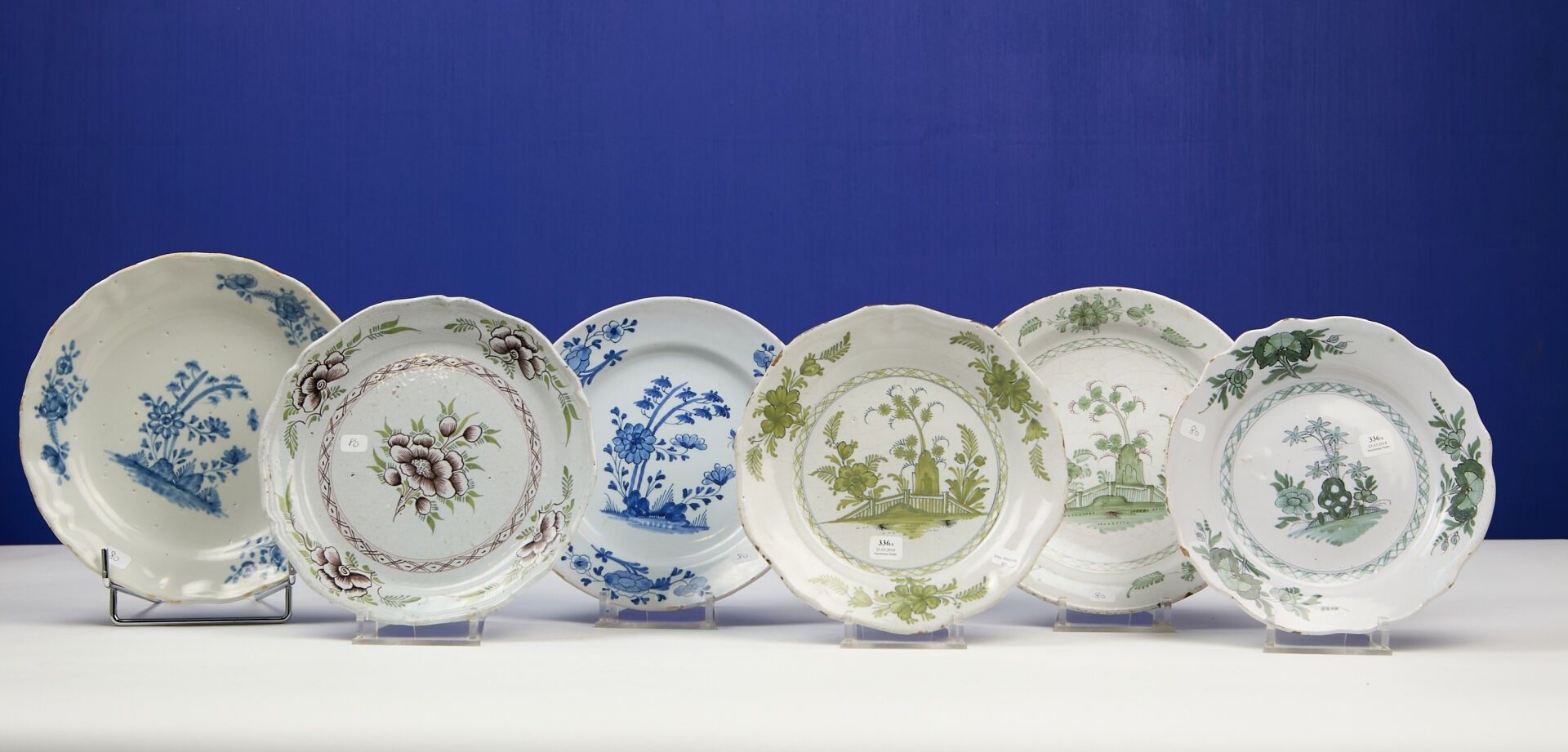 Set of earthenware pieces including 3 plates in green monochrome, two plates in blue monochrome and one plate in green and manganese monochrome decorated with barrier, pierced rock and aloes.