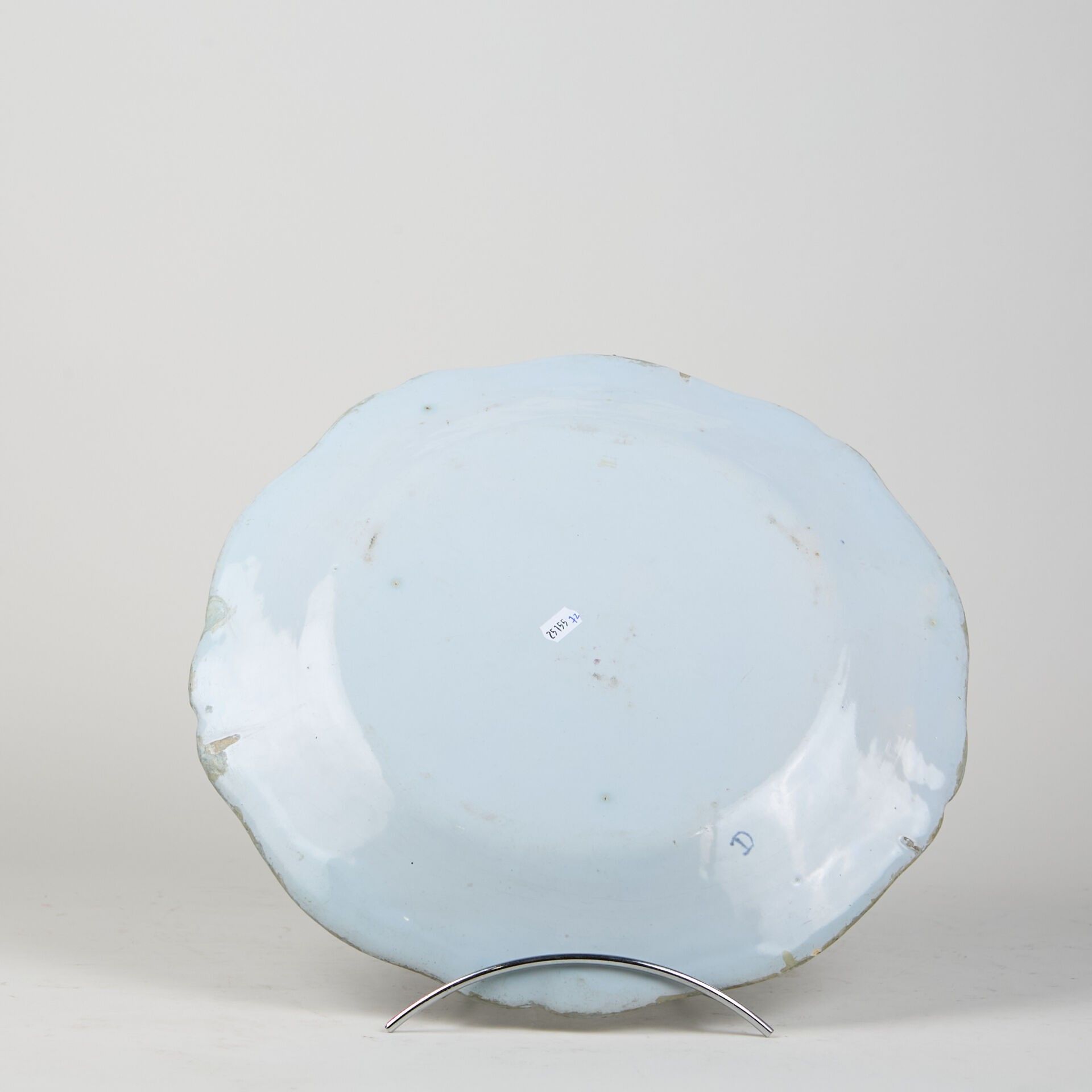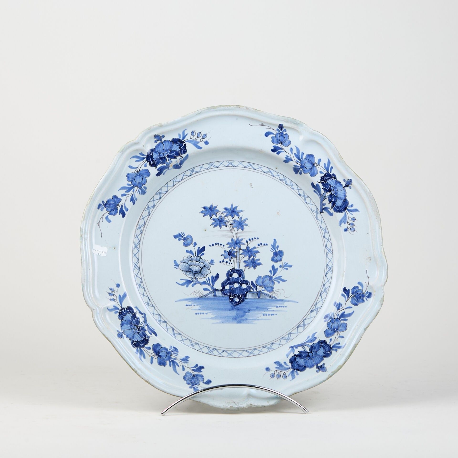 Large round earthenware dish with blue monochrome decoration of pierced rock and aloes