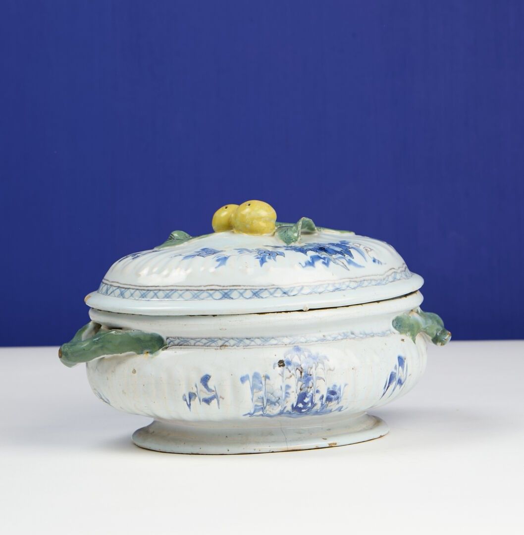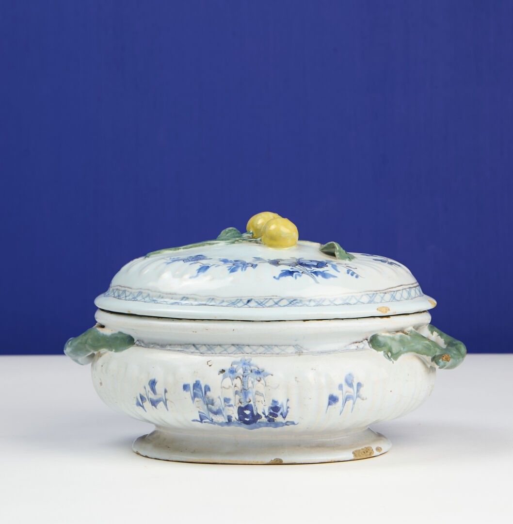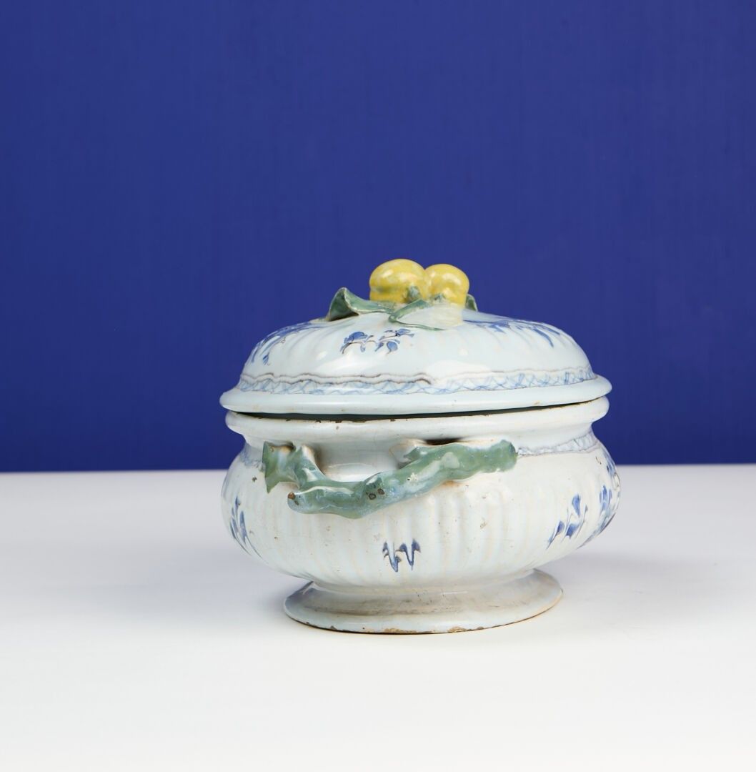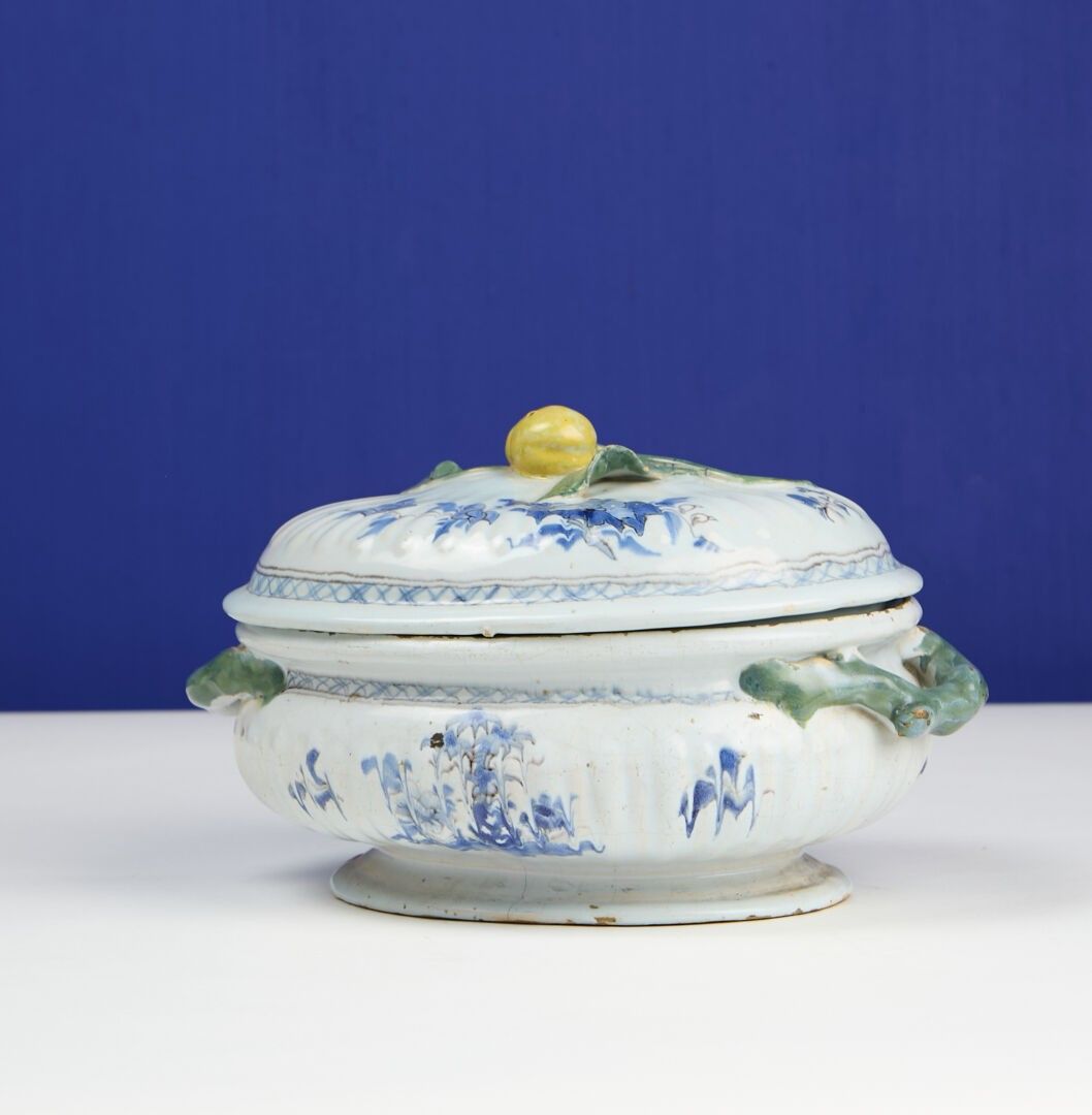 Small earthenware soup tureen with two handles decorated in blue monochrome with aloes. Yellow enamelled fruit-shaped handle.