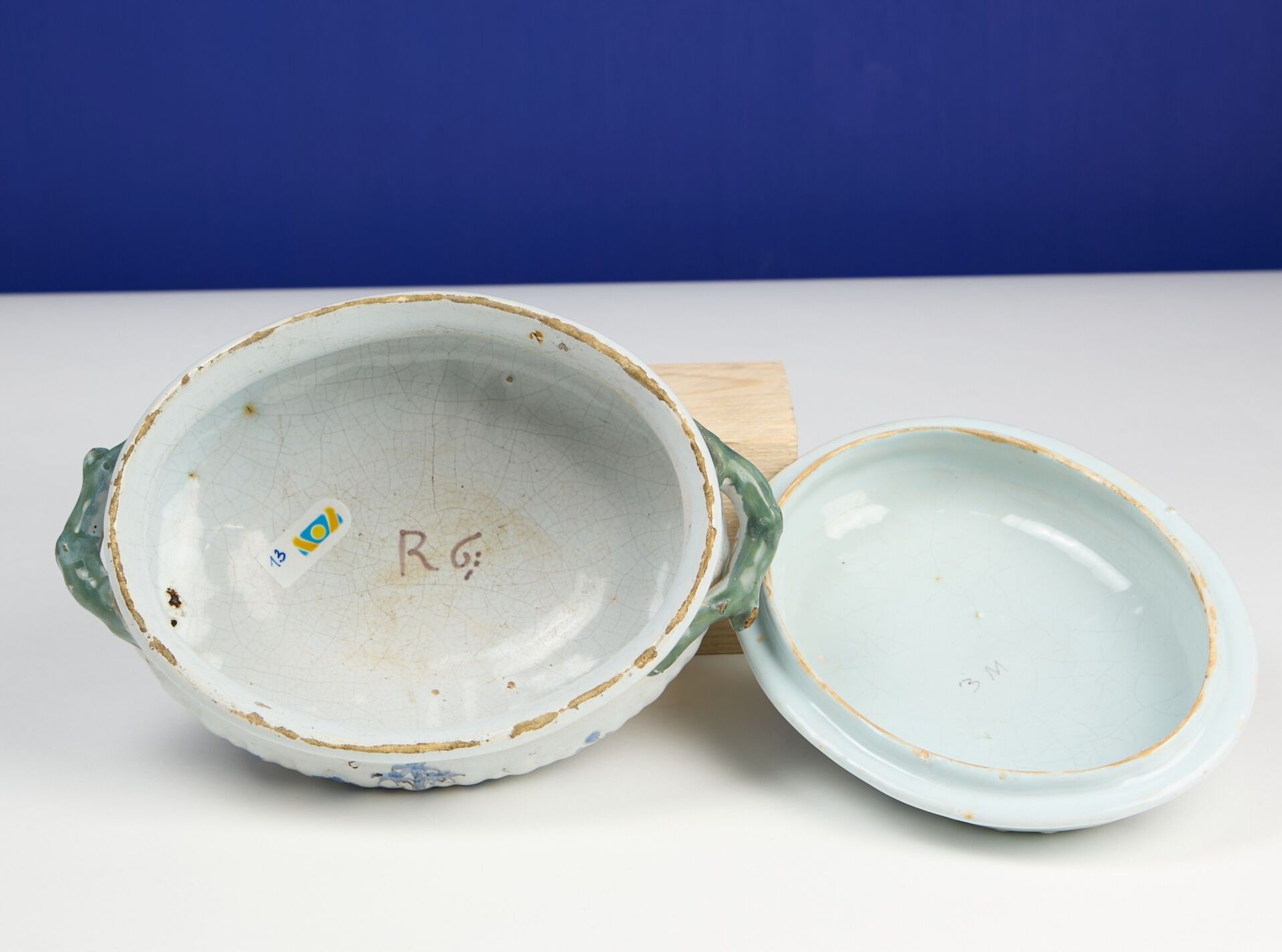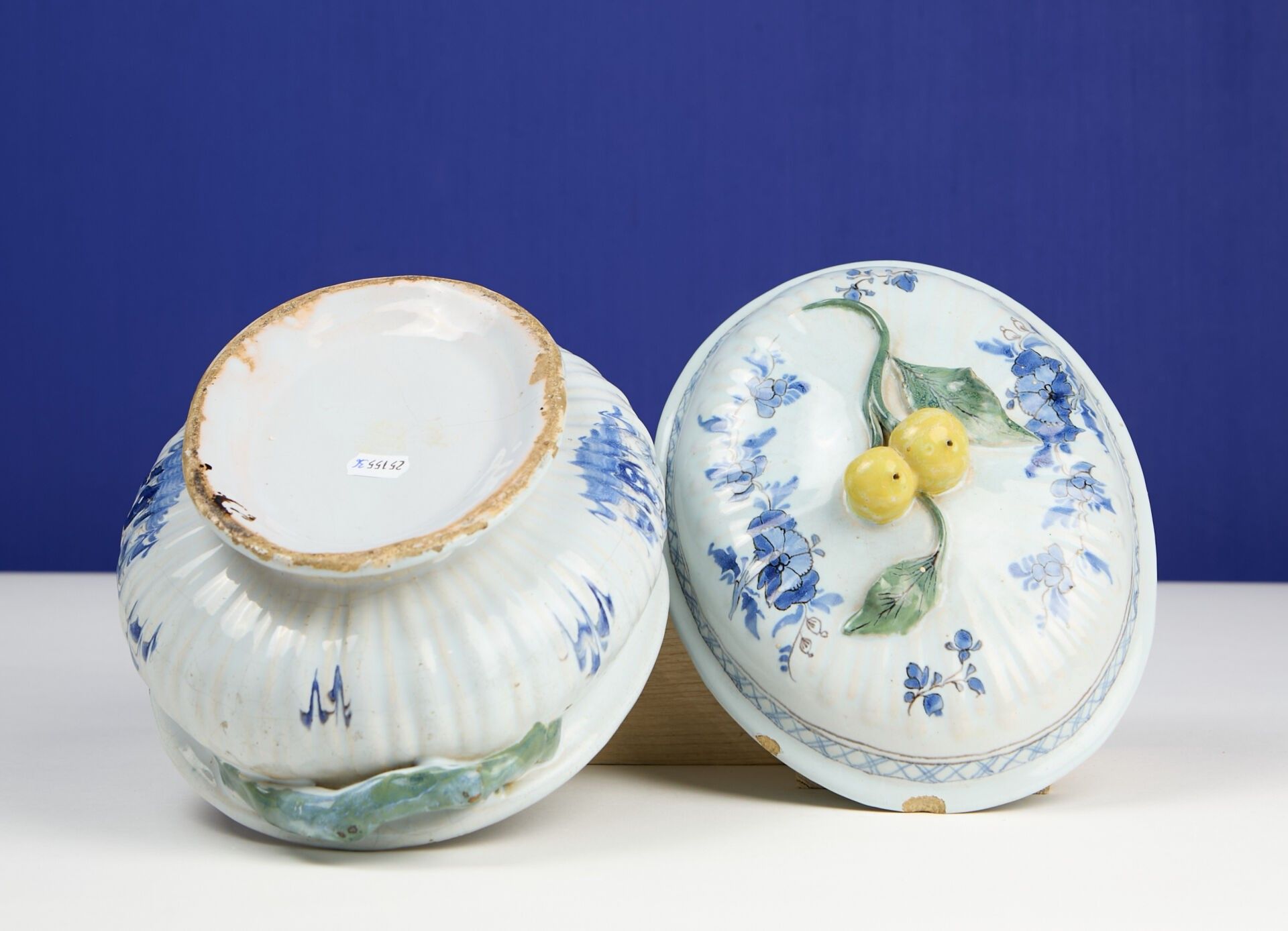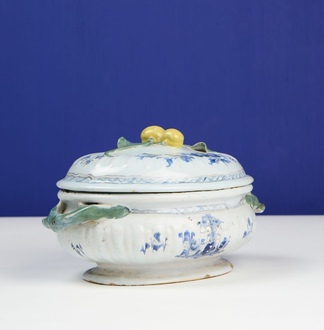 Small earthenware soup tureen with two handles decorated in blue monochrome with aloes. Yellow enamelled fruit-shaped handle.