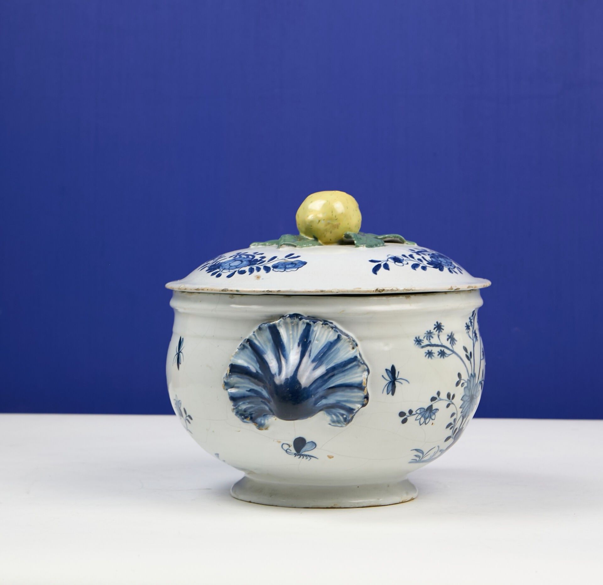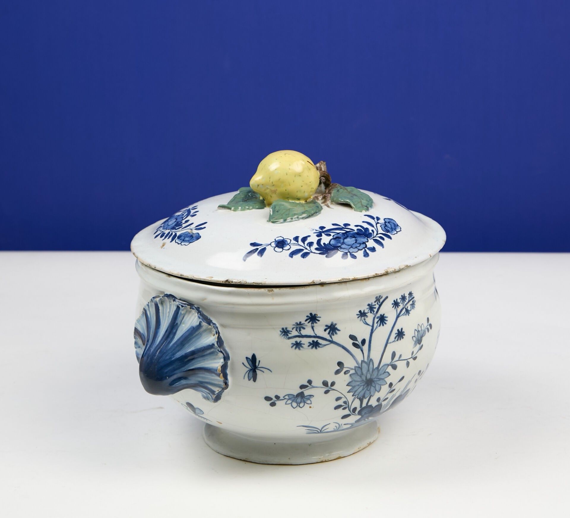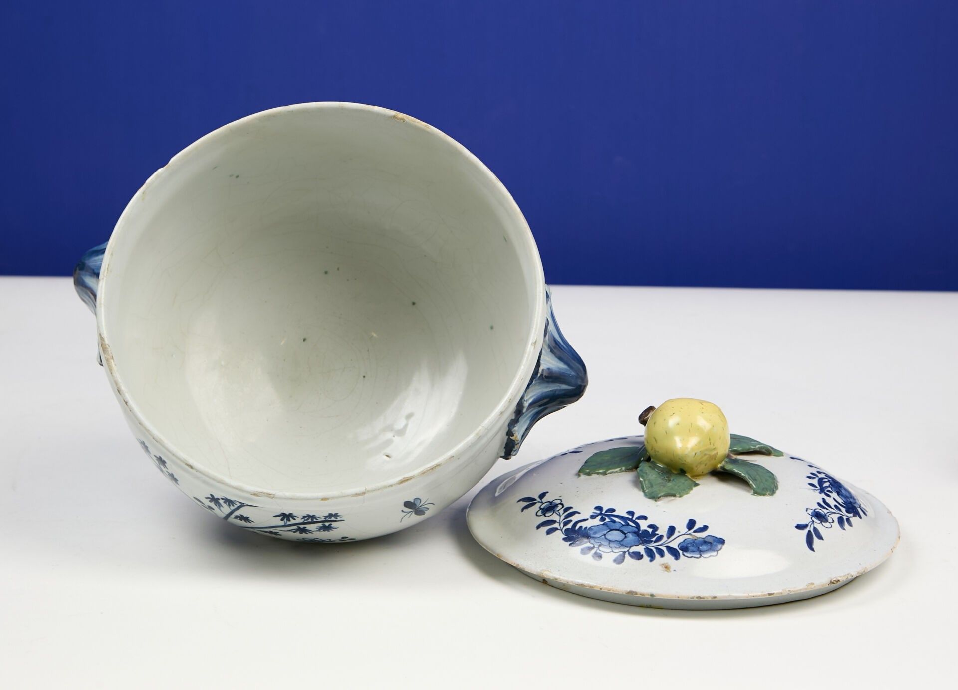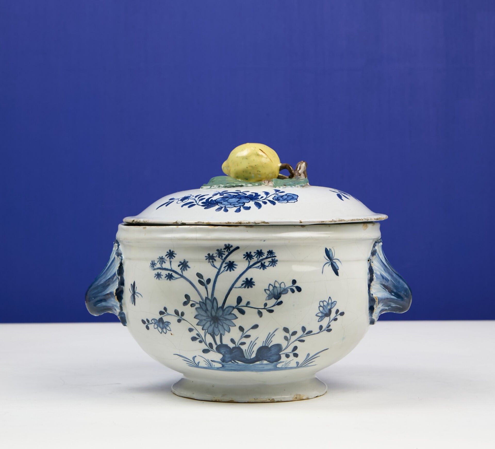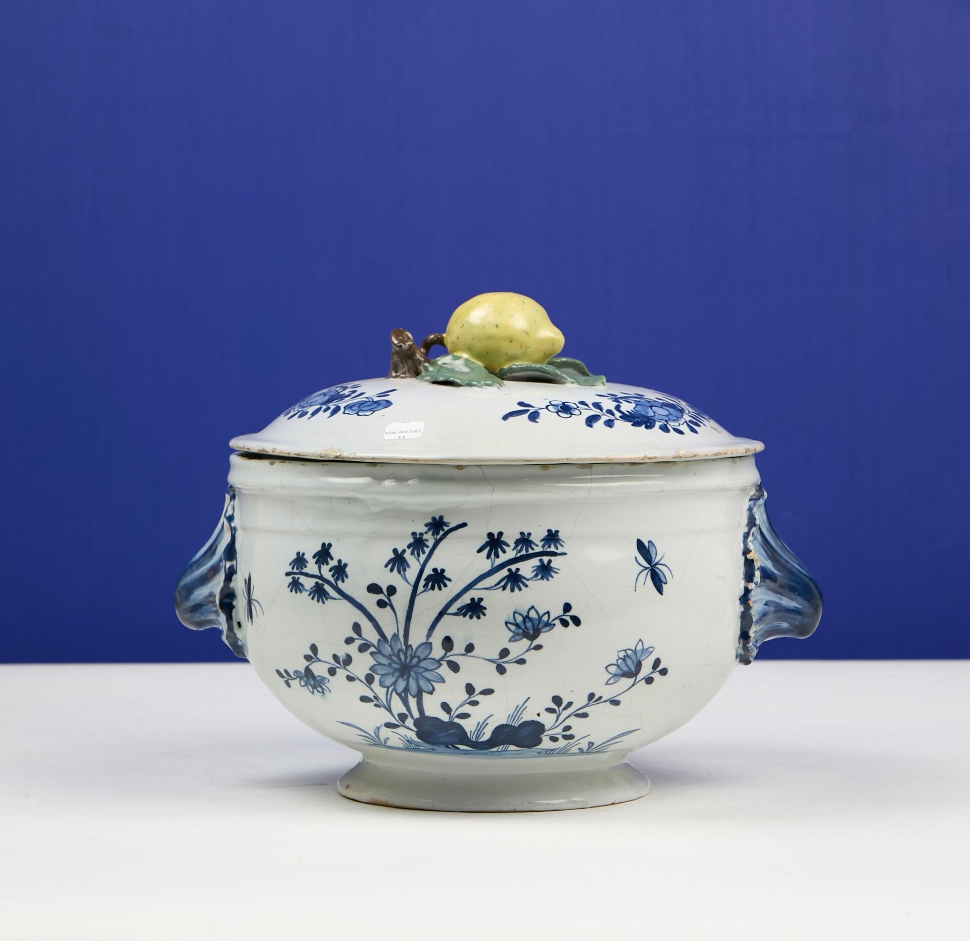 Large round tureen with two handles decorated in blue monochrome with aloes