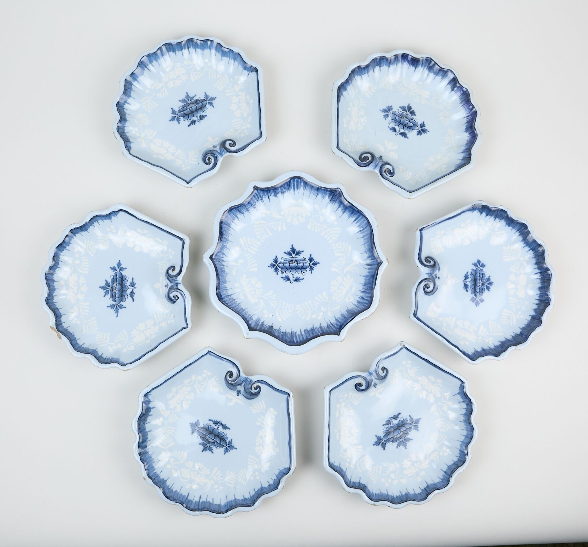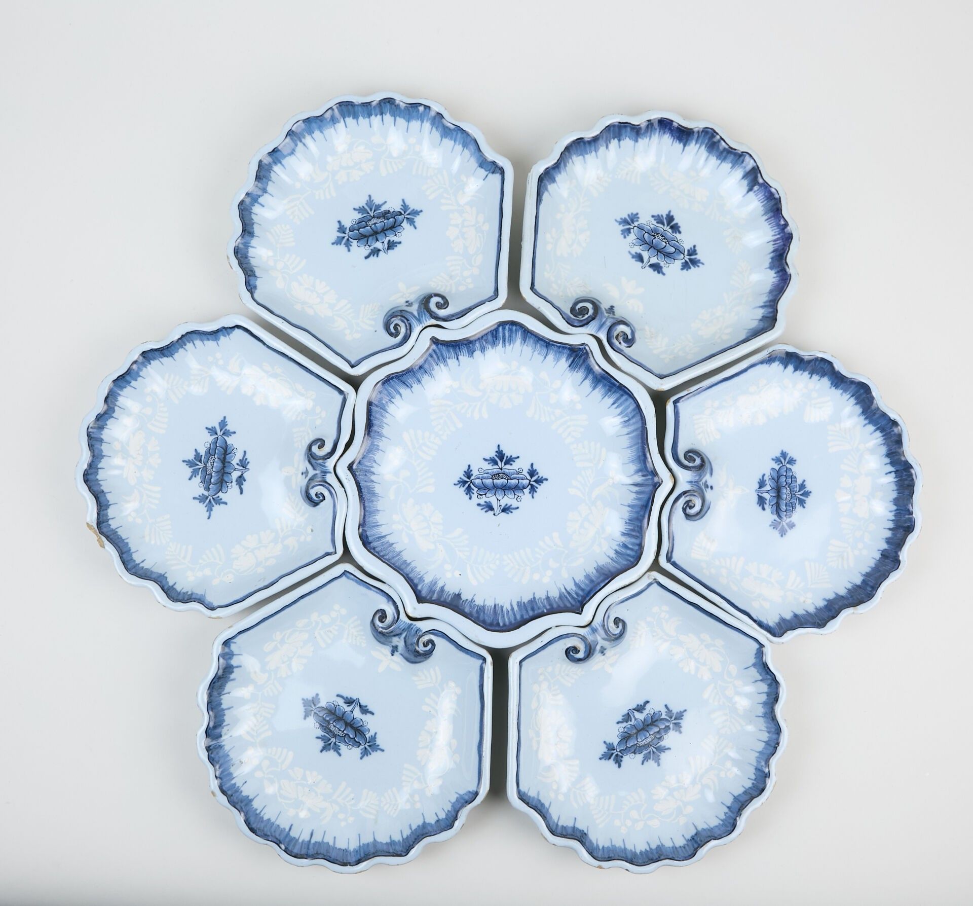 An earthenware begging service with blue monochrome decoration of flowers and combed foliage.