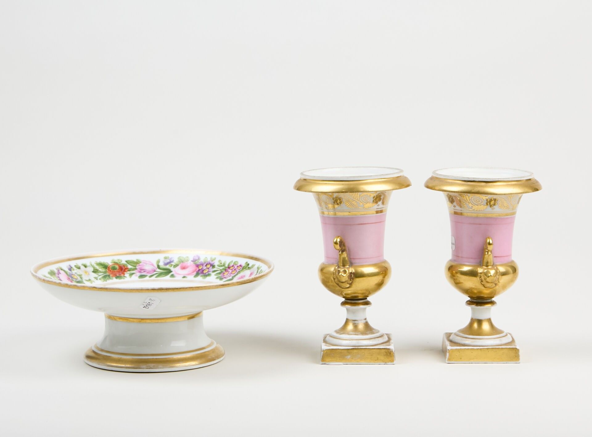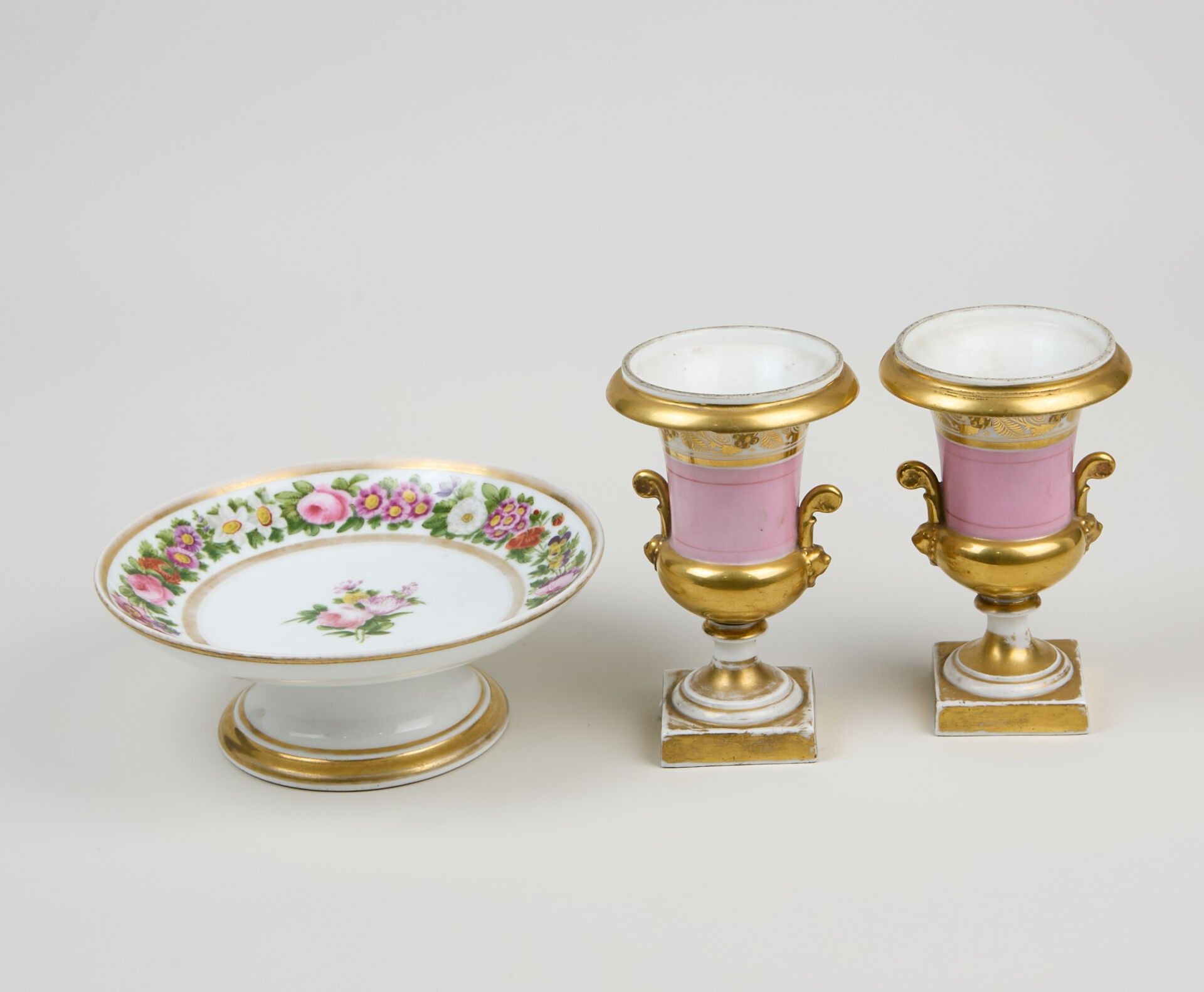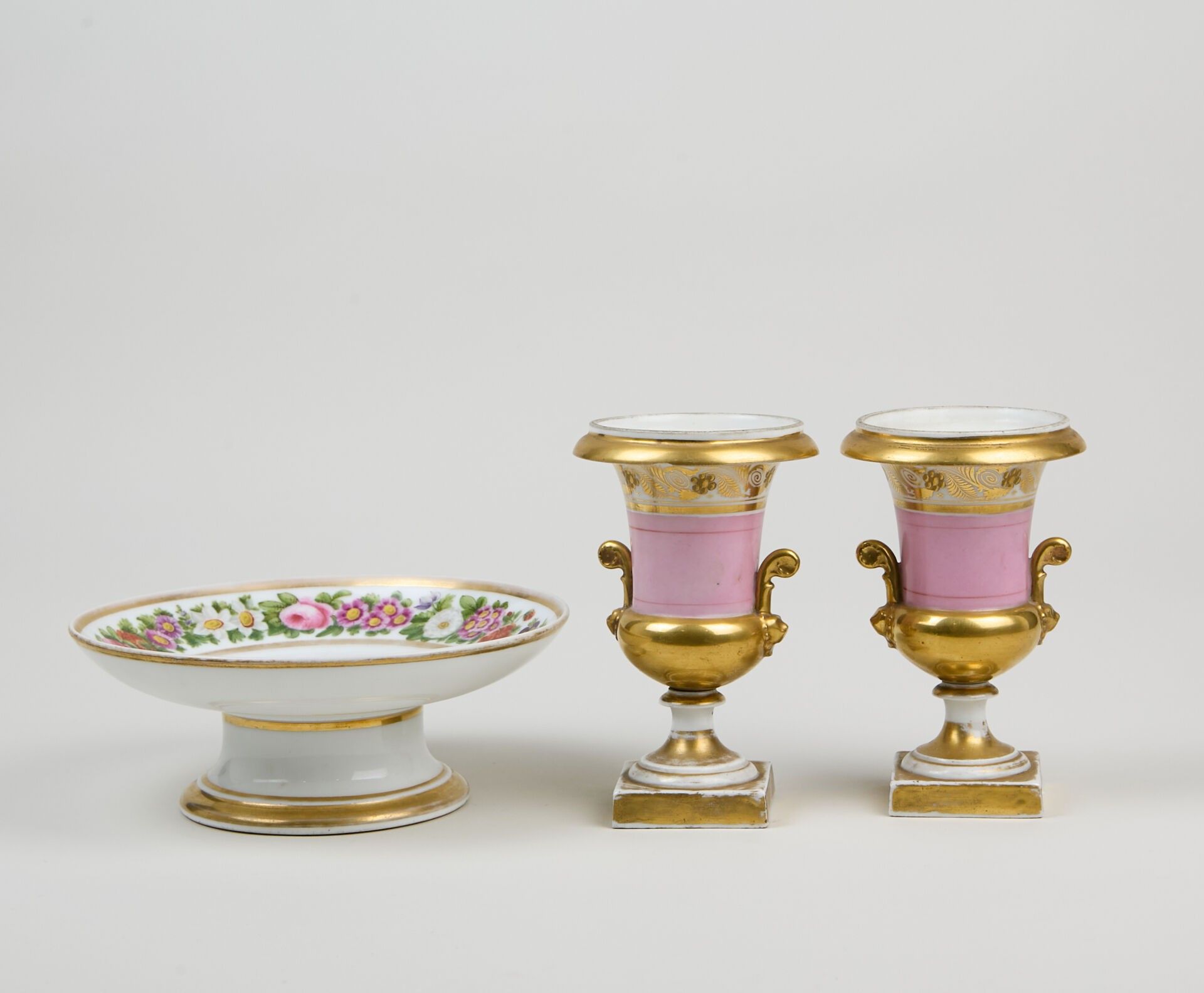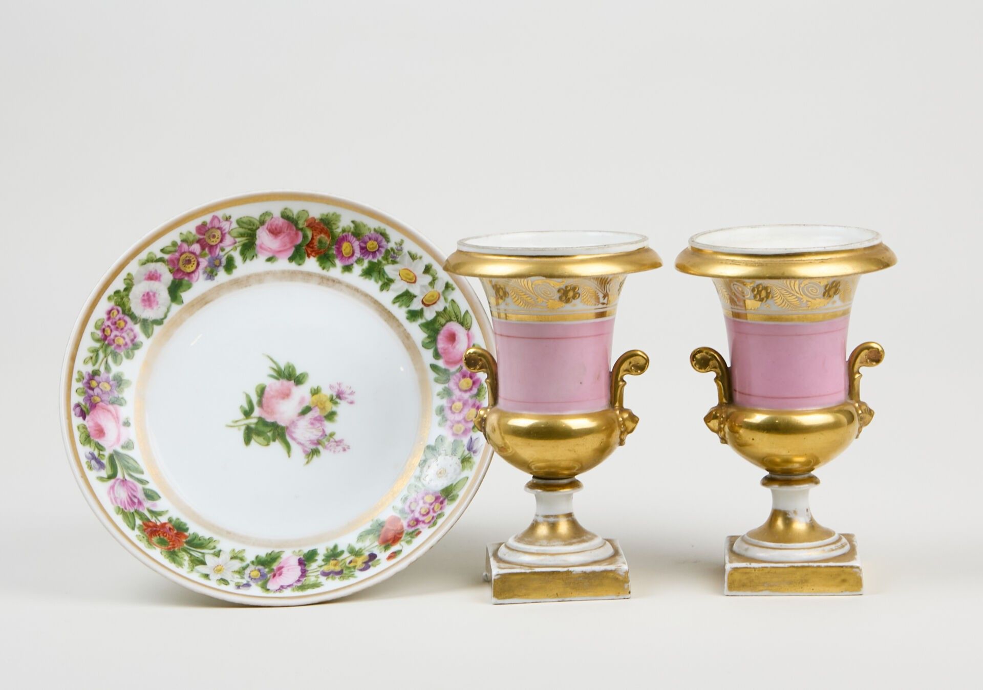 Pair of small Medici vases in pink and gold porcelain.