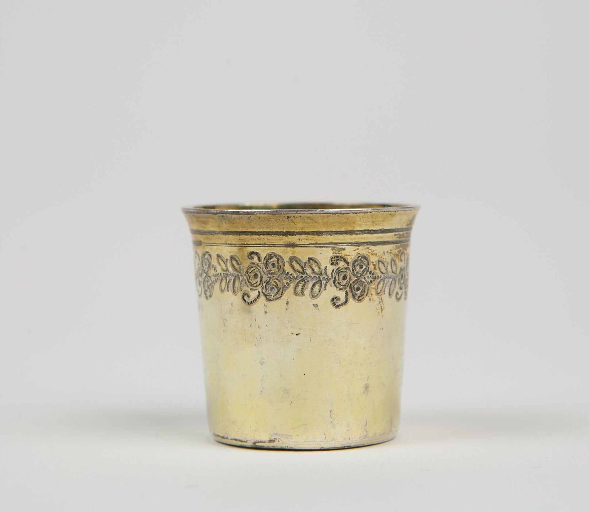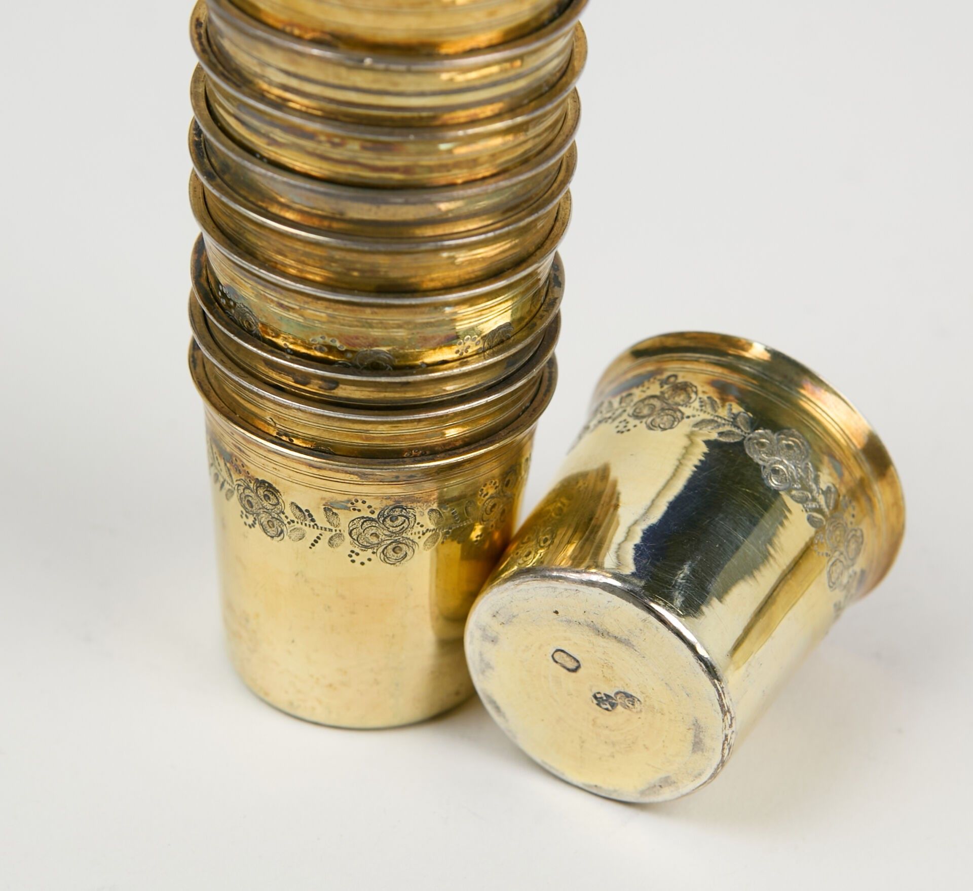 12 vermeil goblets with engraved garlands of flowers.