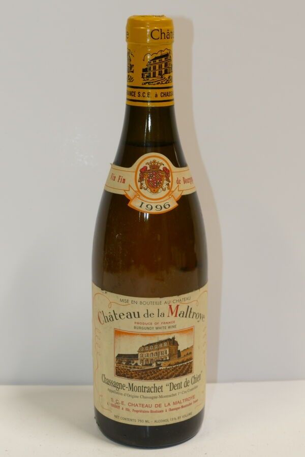 1 Btle Chassagne Montrachet 1er Cru Dent de Chien 1996 Château de la Maltroye level 2.5 cm under the cork label slightly dirty and very slightly damaged Expert : Emilie Gorreteau
