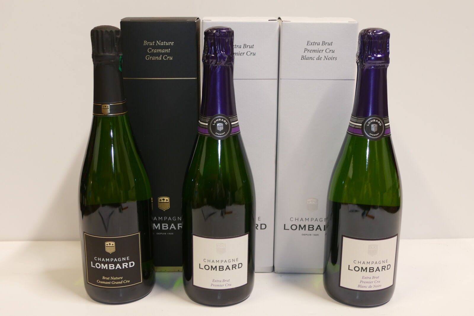 A non-vintage Lombard Champagne set of 3 Btles: 1 Btle Brut Nature Cramant Grand Cru, 1 Btle Extra Brut 1er Cru and 1 Btle Extra Brut 1er Cru Blanc de Noirs in unit cases IC 10/10 PM Vat included and recoverable for taxable persons Expert: Emilie Gorreteau