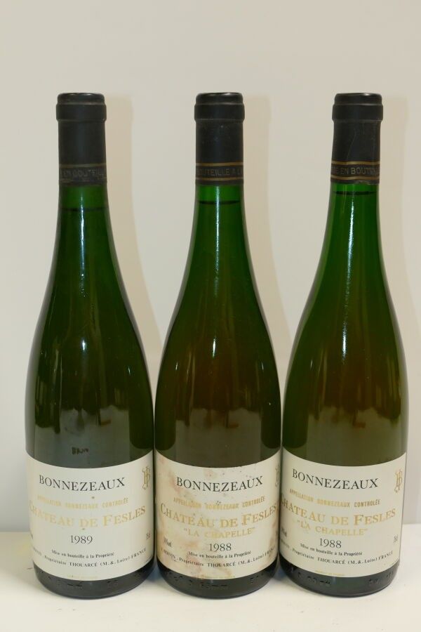 3 Btles Bonnezeaux Château de Fesles : 1 Btle from 1989 and 2 Btles Cuvée La Chapelle from 1988 with slightly dirty labels IC 10/10 PM Expert : Emilie Gorreteau