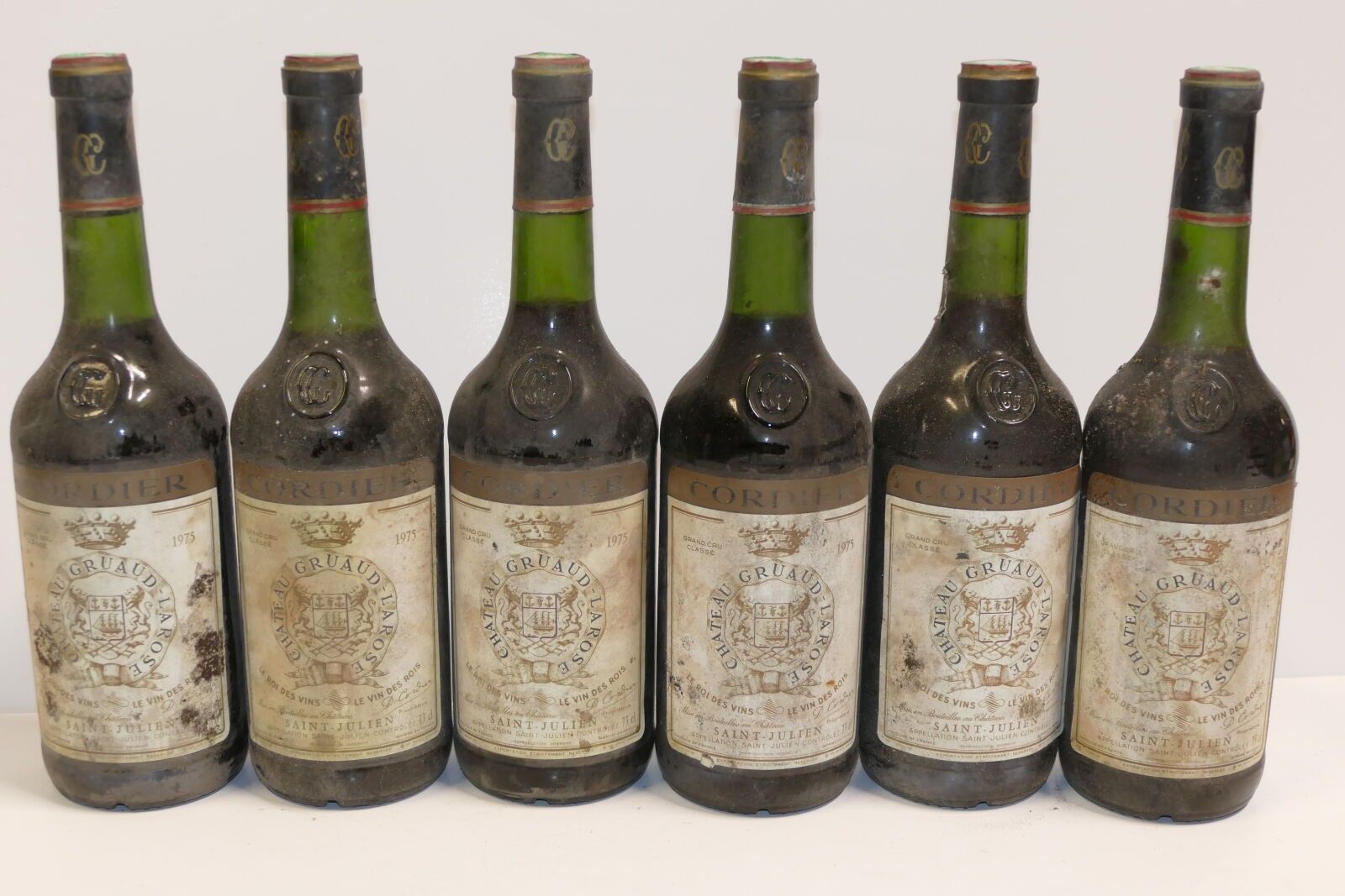6 Btles Château Gruaud Larose 1975 2nd GCC Saint Julien low levels dirty and slightly damaged labels Expert : Emilie Gorreteau