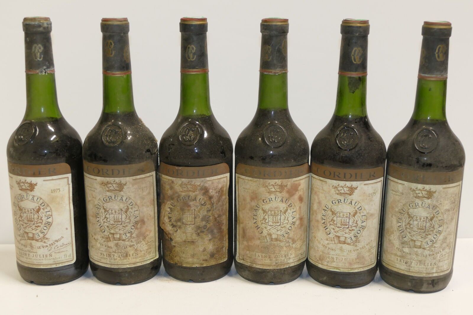 6 Btles Château Gruaud Larose 1975 2nd GCC Saint Julien low levels dirty and damaged labels Expert : Emilie Gorreteau