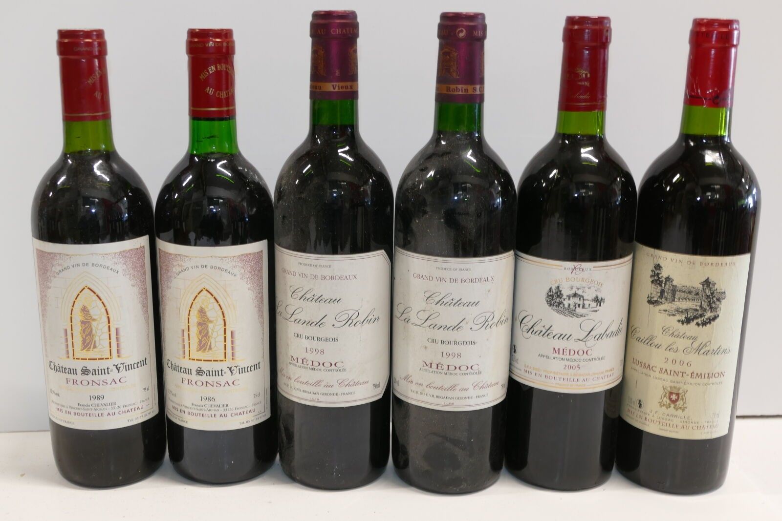 A Batch of 6 Btles: 2 Btles Château Saint Vincent 1989 Fronsac, 2 Btles Château La Lande Robin 1998 Cru Bourgeois Médoc slightly dirty labels, 1 Btle Château Labadie 2005 Médoc, and 1 Btle Château Caillou Les Martins 2006 Lussac Saint Emilion Expert: Emilie Gorreteau