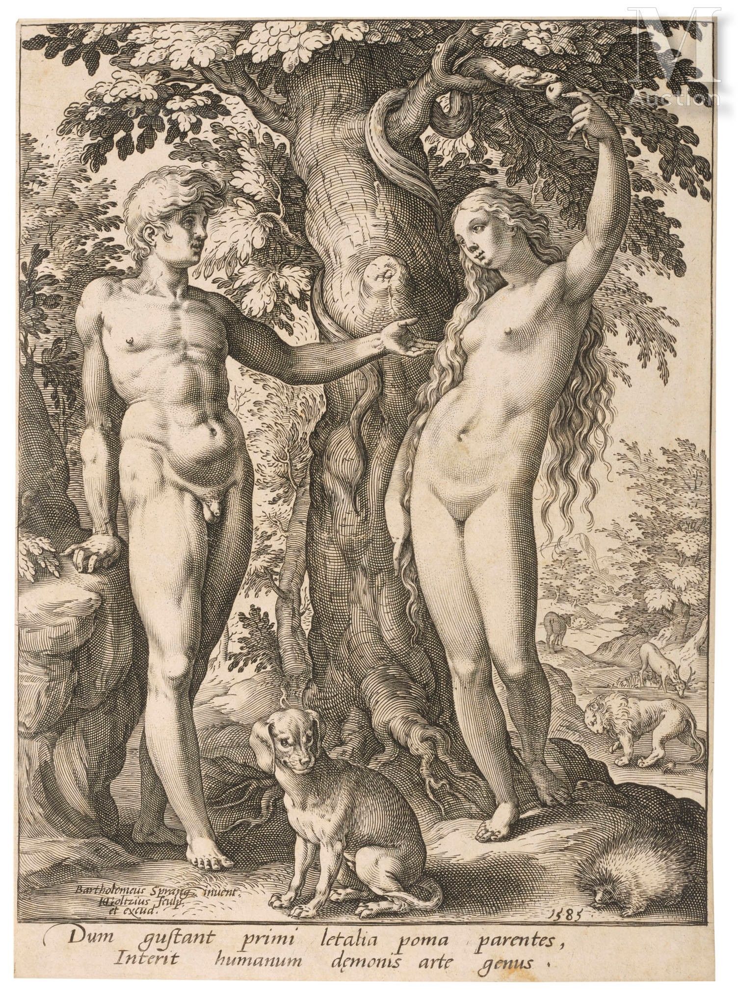 Goltzius Hendrick (1558-1617) Adam and Eve after B. Spranger Burin, very fine proof without margins with the ink mark of P. Mariette 1689 on the reverse, horizontal fold in the middle, white band around the edges on the reverse. (Strauss 217) 21,1 x 15,2cm slight thinning, very slight loss