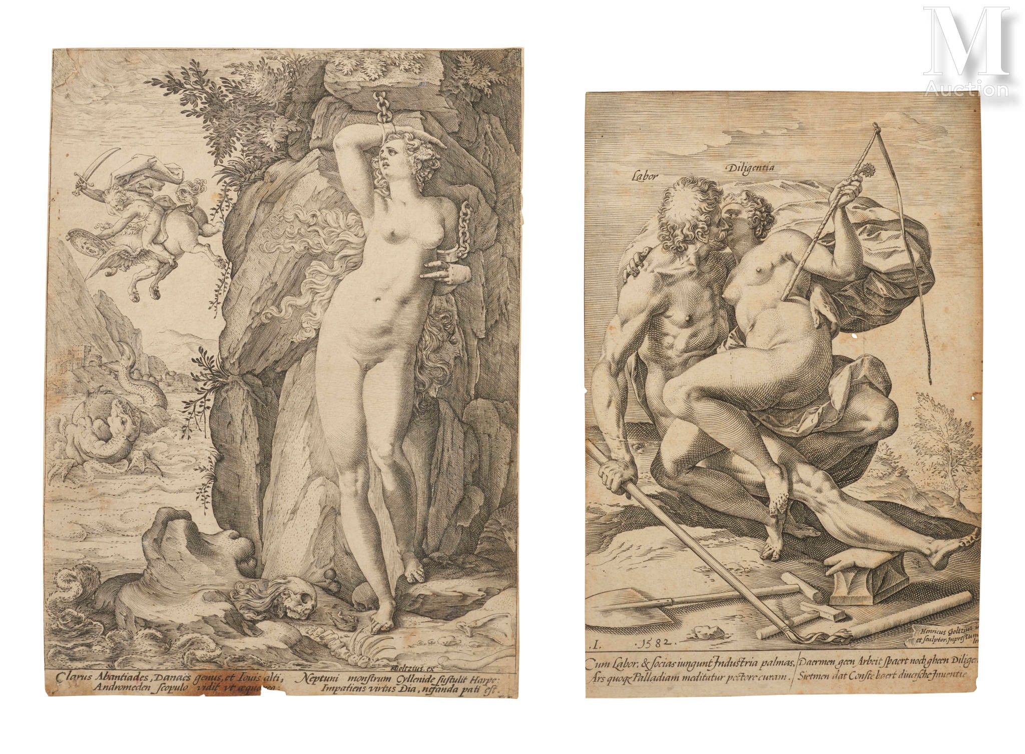Goltzius Hendrick (1558-1617) Labor et diligentia chisel. fine proof, slightly trimmed, yellowed, with minor tears, stains, upper corners glued (Strauss 150) 19.7 x 13 cm slightly trimmed and slightly late proof, Attached: - Goltizus workshop, Perseus rescuing Andromeda. Burin a little late, cut, folds, stains, brown stain at the bottom reinforced on the reverse, small lacks, upper edge glued (New Hollstein 586) 21 x 15.3 cm Brown stain and small lack Set of 2 plates