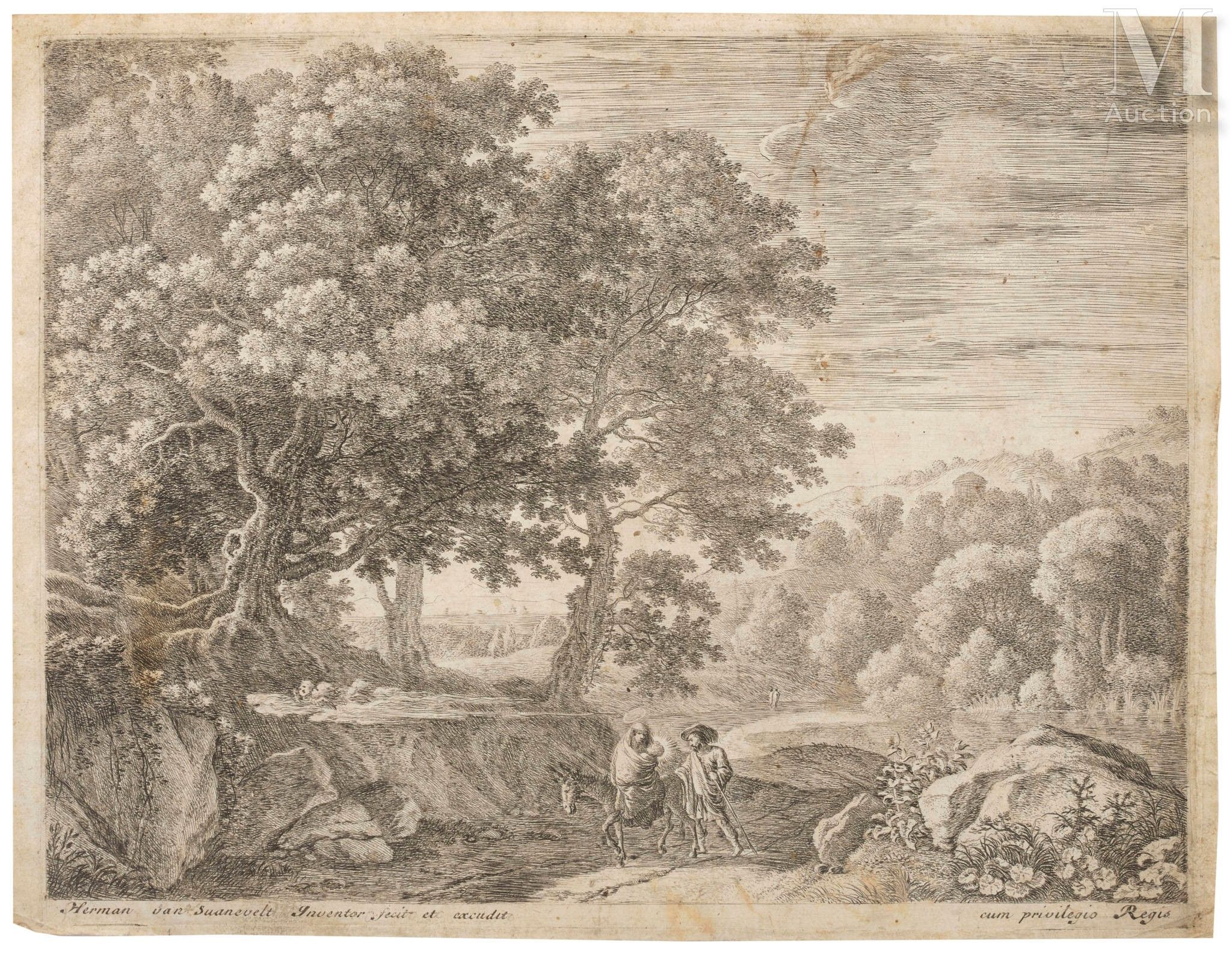 Attached: H. Van Swanevelt - the small wooden bridge - the flight into Egypt - Rest during the flight (badly missing) - animated landscape (cut corners, in the style of Van Sawnevelt). Burins in late print, small stains and folds. Approx. 19 x 27 cm