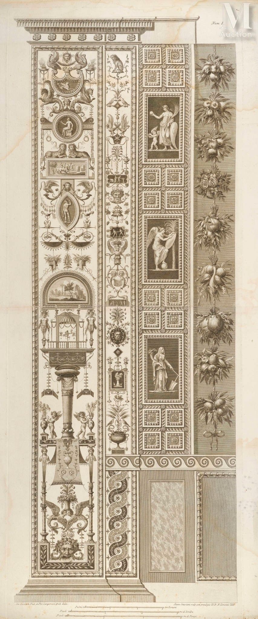 Seven pilasters numbered I to VII engraved according to the drawings of G. Savorelli and P. Camporesi after the decorations of Raphael's Lodges in the Vatican Palace