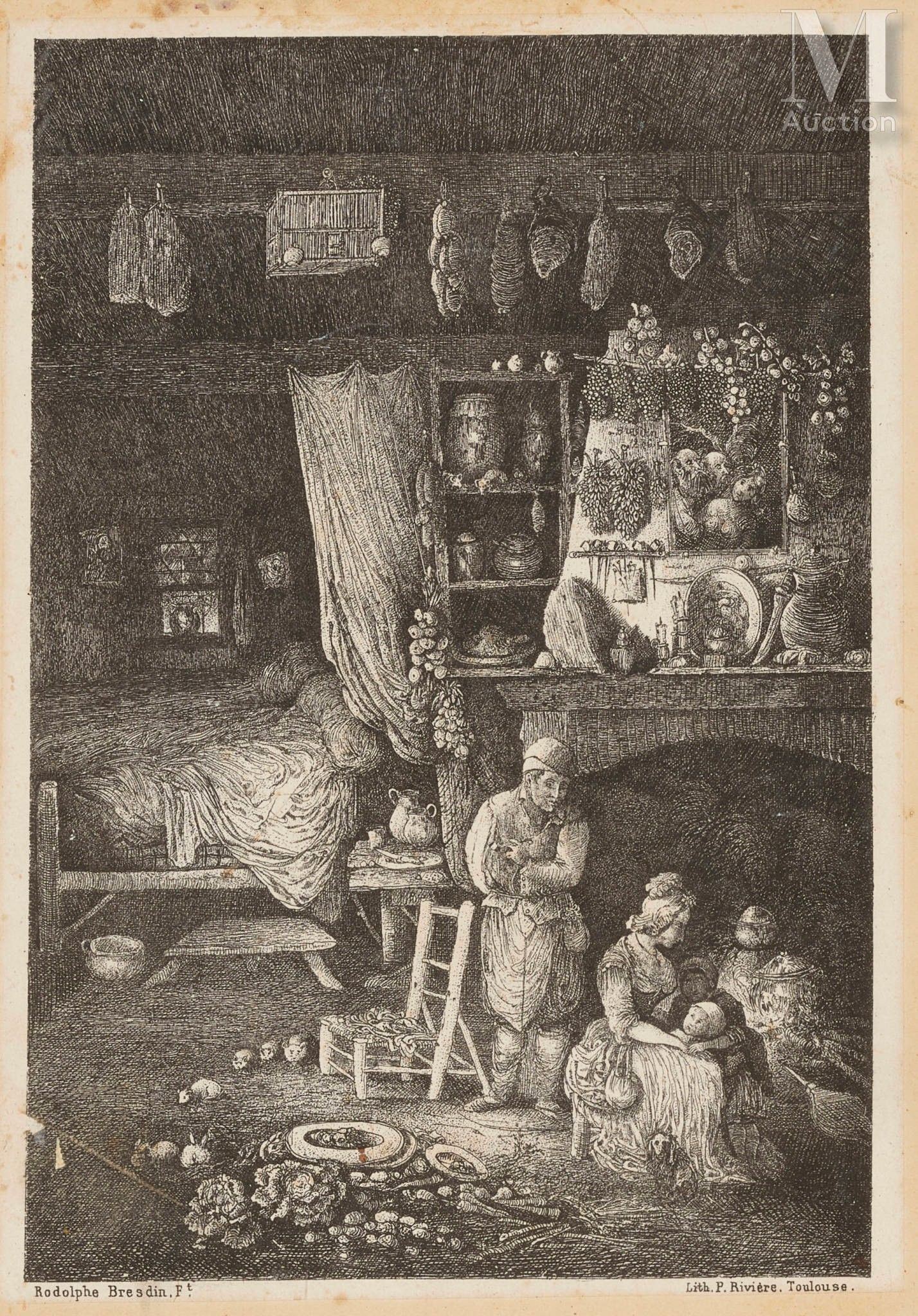 Stone transfer of the etching. Proof on chine applied to vellum, pasted on card, with the name of the printer P. Riviere, Toulouse. Heavy staining, breakage, missing right margin, minor edgewear (D. Van Gelder 86, II).
