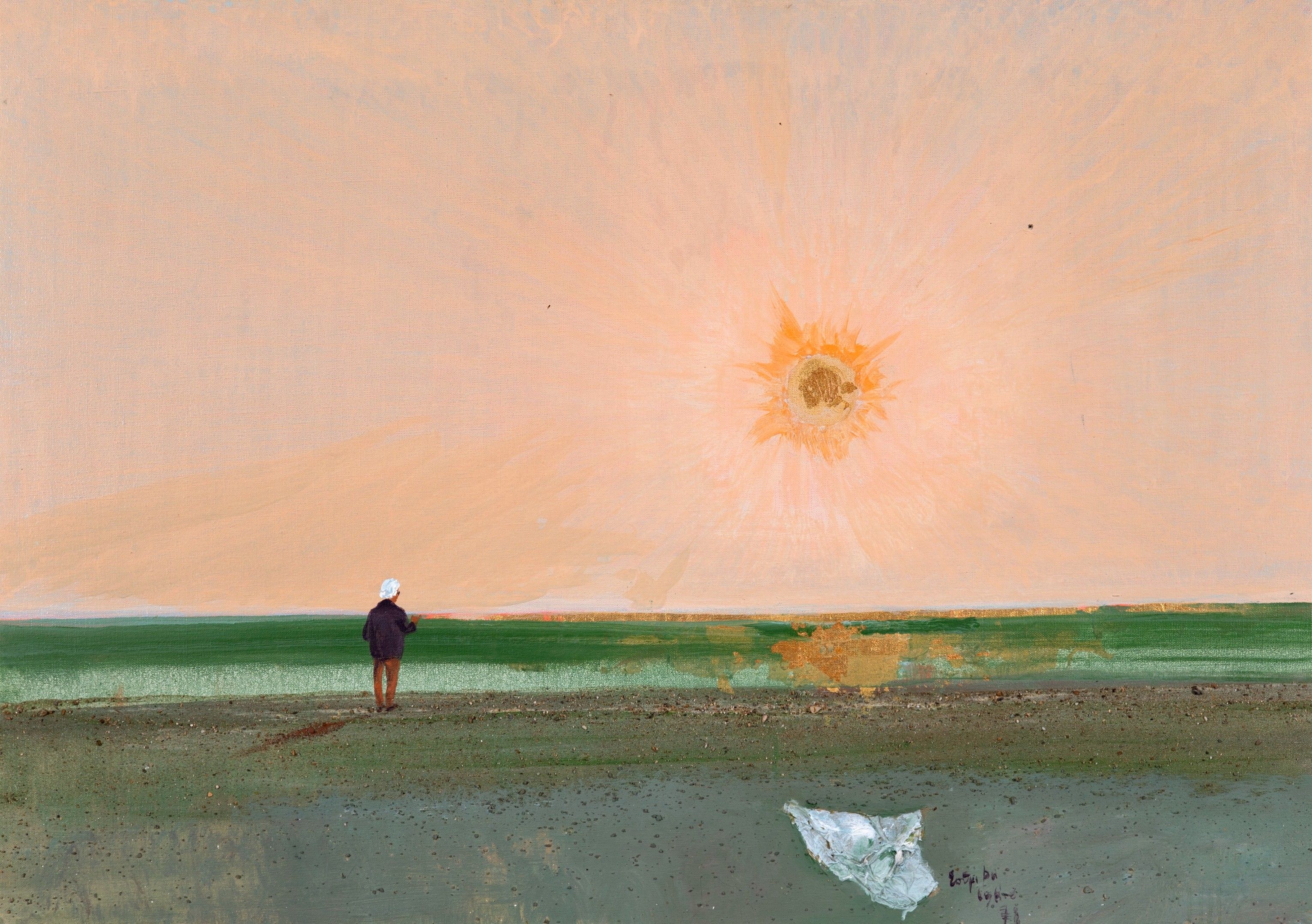 Acrylic, gold leaf, and sand on canvas
