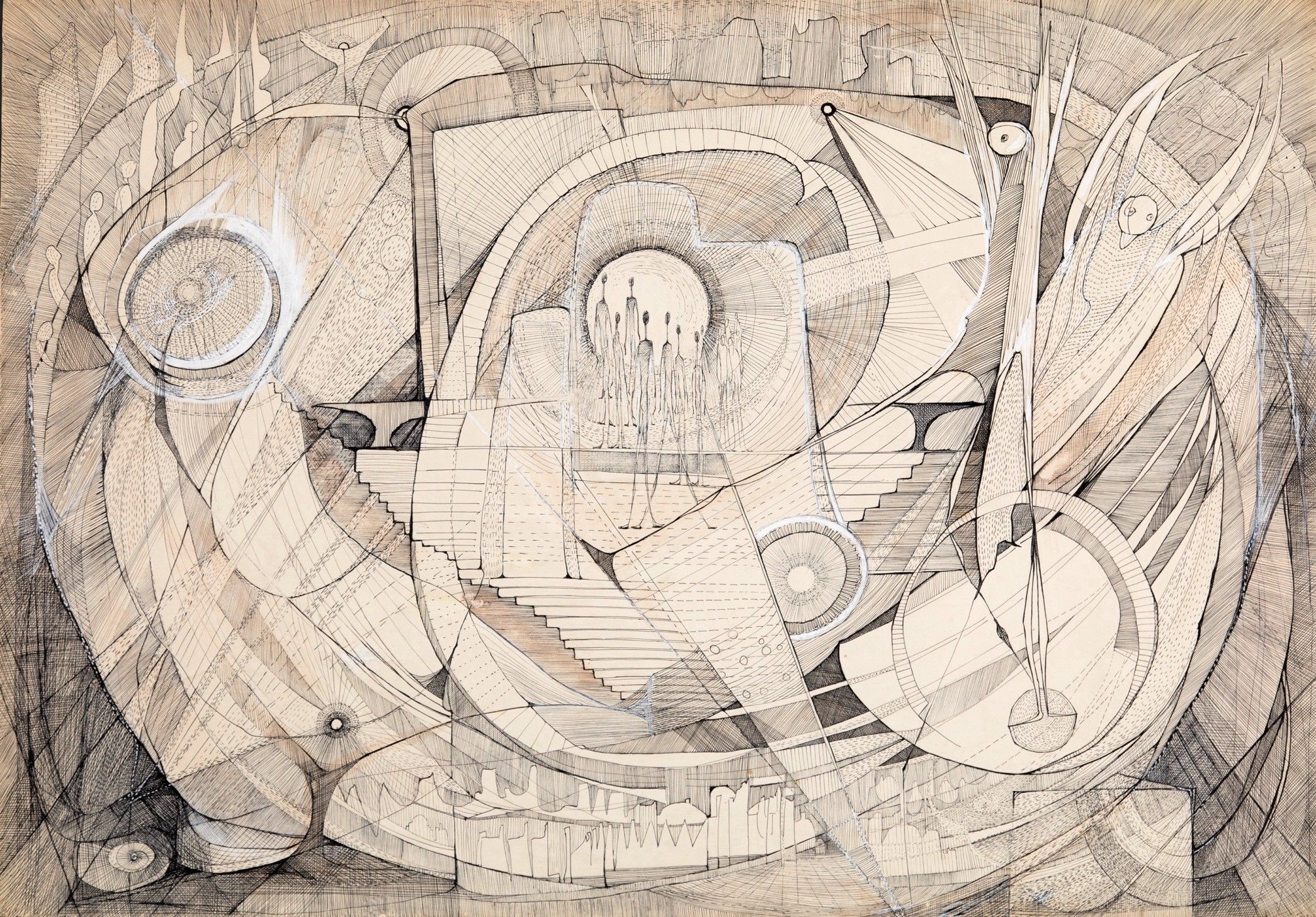 103. ELENI PITARI PANGALOU (1905-1995) Untitled ink and gouache on paper 69 x 99 cm (27.17 x 38.98 in.) Painted c. 1970s Ink and gouache on paper Provenance Estate of the artist Exhibitions Athens, National Museum of Contemporary Art, 13 June 2024 - 12 January 2025. In the 1960s and 1970s, Pitari-Pangalou created a body of uniquely original black-and-white drawings that navigate the realms of fantasy, clairvoyance and metaphysical concerns, linking the fundamental premises of symbolism with the spirit of abstraction. Echoing the ethereal 19th c. visions of William Blake, the artist meticulously covers every inch of the pictorial surface almost to the point of horror vacui, creating a central theme and then enclosing it in a cluster of forms that seem to multiply ad infinitum. These intuitive, enigmatic, highly insightful drawings, which recall Leonora Carrington's dream-like autobiographical work, underscore the often overlooked yet crucial contribution of women artists to the surrealist movement.1 A student of Parthenis at the Athens School of Fine Arts, Pitari-Pangalou showed her work in Athens and Rome, and in 1963 she co-represented Greece at the 7th Sao Paolo Art Biennial and the 5th Alexandria Biennale for Mediterranean Countries. 1 : See https://www.pitari-pangalou-art.com/
