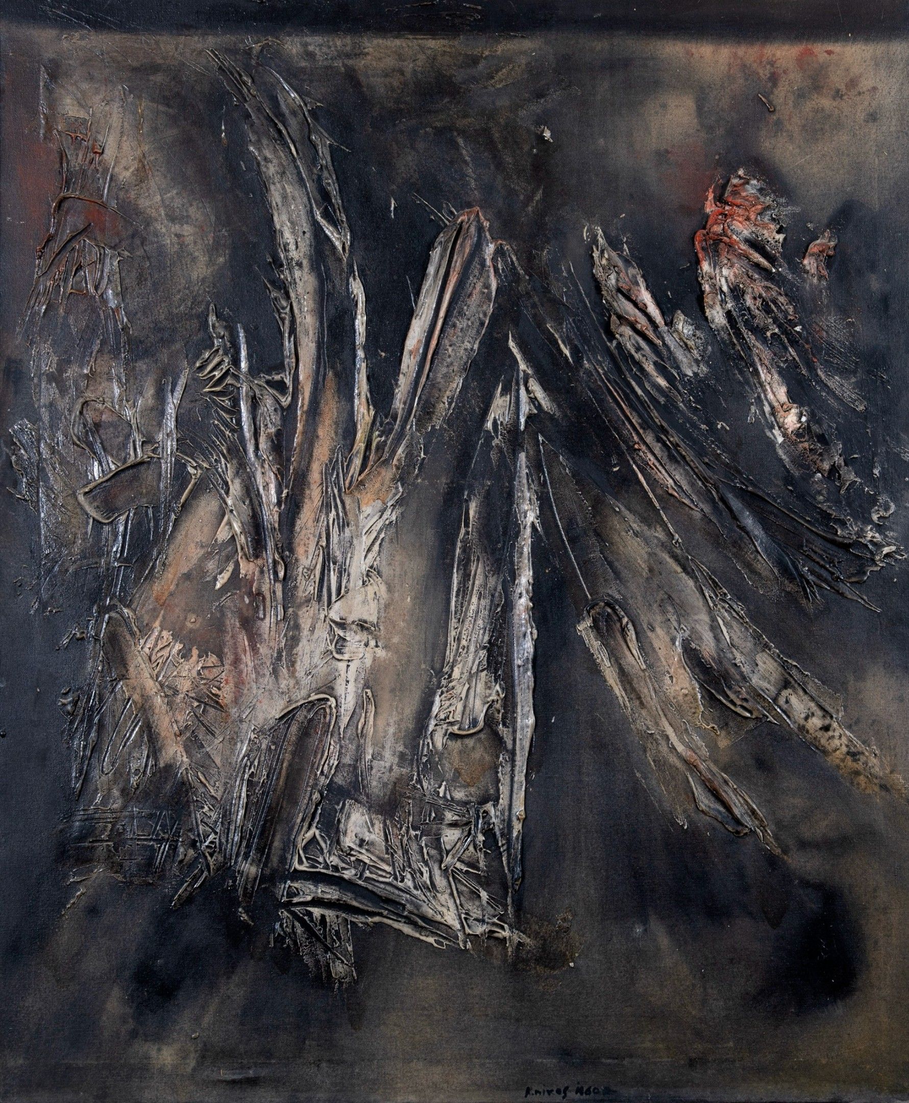 118. 118AR NIKOS KESSANLIS (1930-2004) Terra Incontro signed and dated "K. NIKOS 1960" lower centre; signed, titled and dated "Kessanlis Nikos / Febraio 1960/ terra-incontro" on reverse oil and mixed technique on canvas 129 x 99,5 cm (50 13/16 x 39in.) Painted in 1960. signed and dated "K. NIKOS 1960" lower right; signed, titled and dated "Kessanlis Nikos / Febraio 1960/ terra-incontro" on the reverse oil and mixed media on canvas Literature Nikos Kessanlis - Grecia Biennale di Venezia 1988, Greek Ministry of Culture - Direction of Fine Arts, Athens 1988 (illustrated). P. Restany, Nikos, Kastaniotis editions, Athens 1988, p. 54 (illustrated).