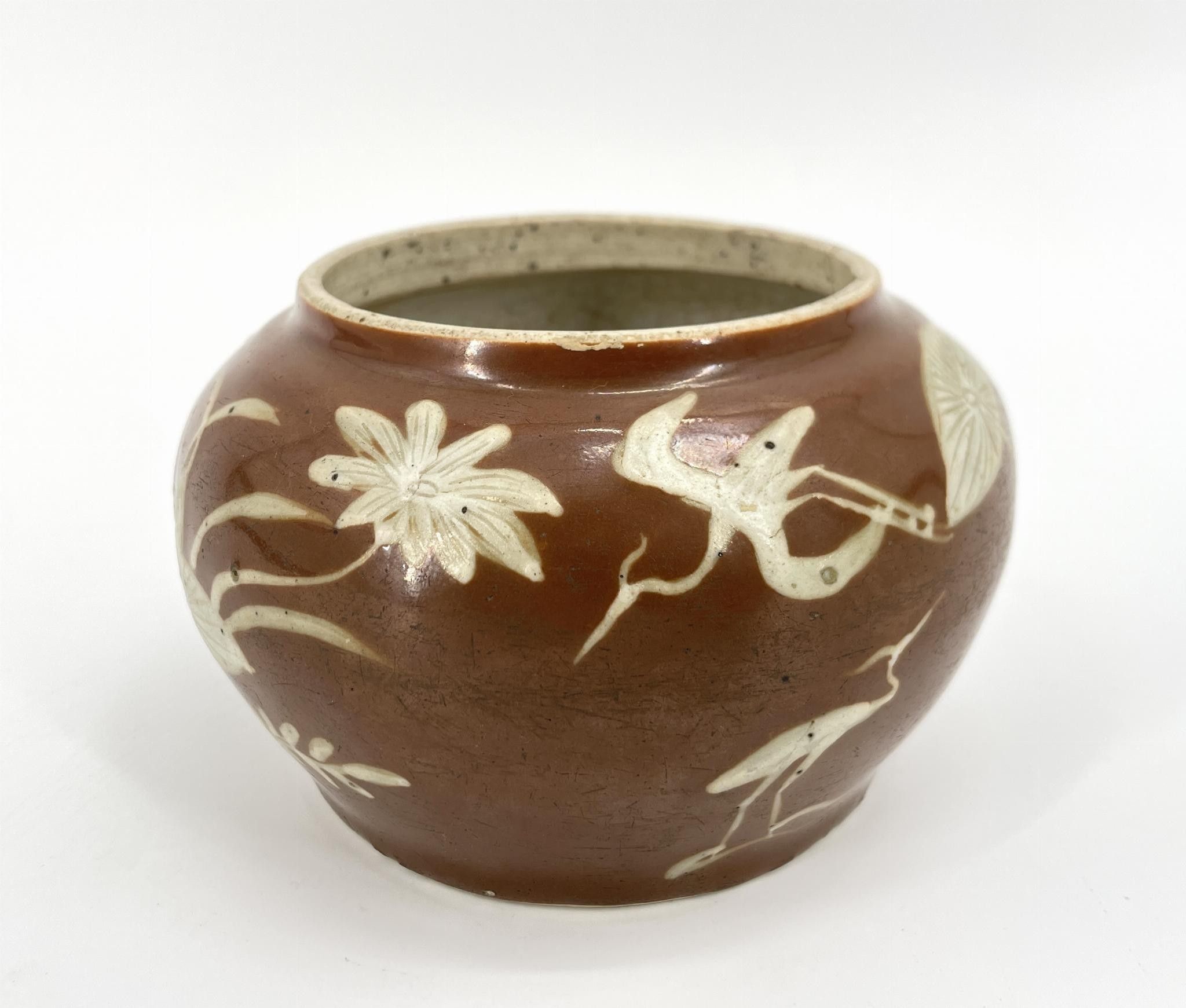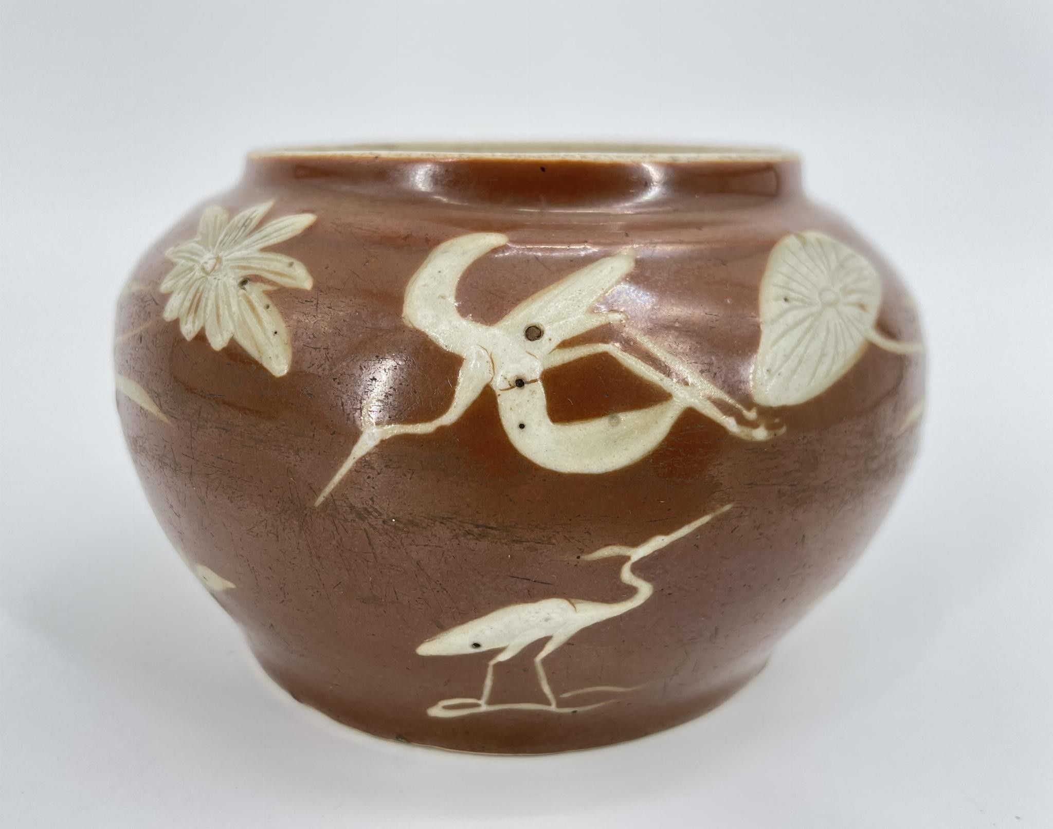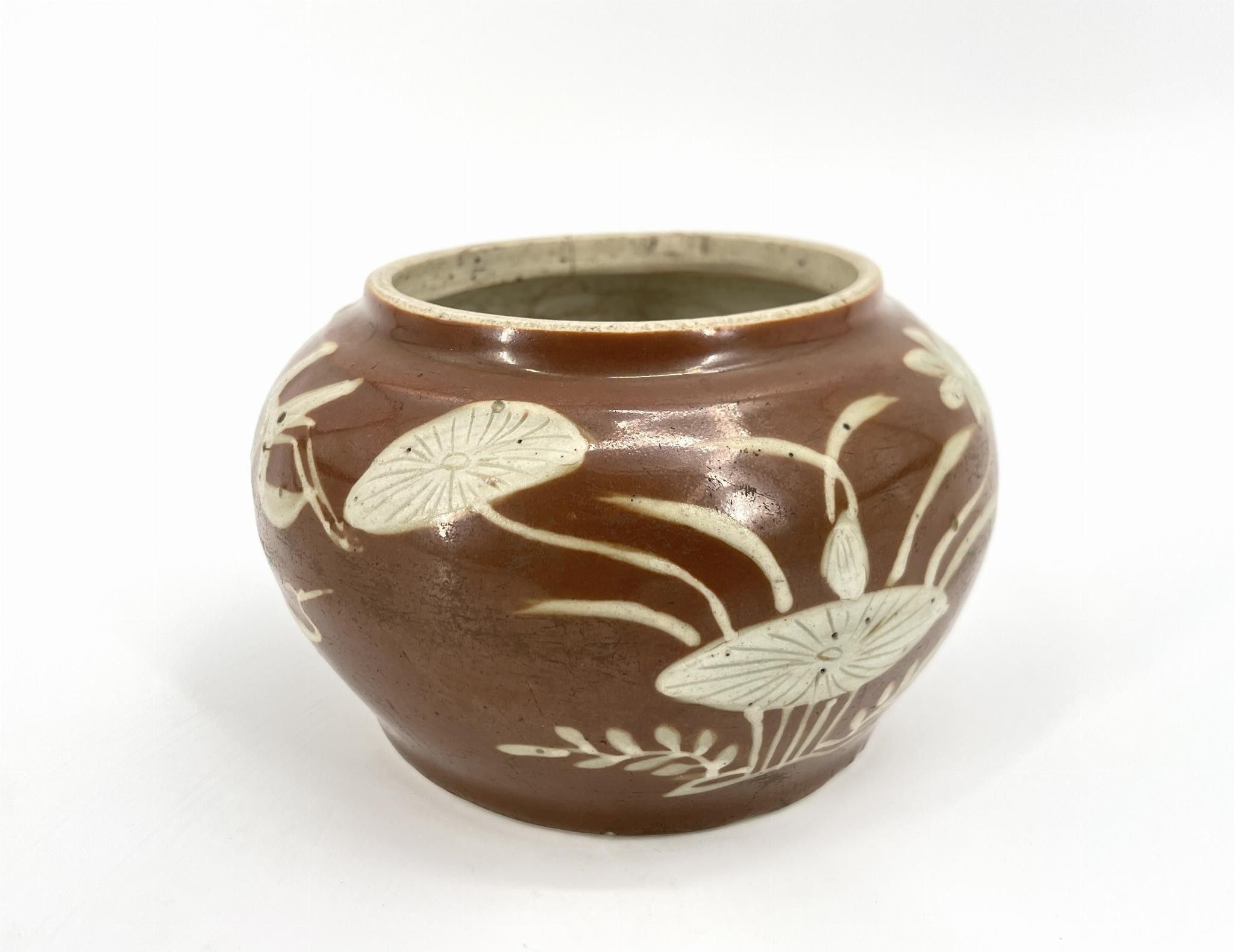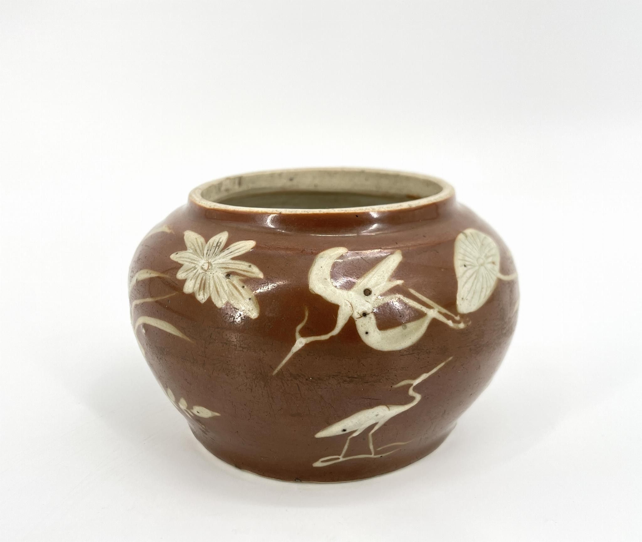 CHINA. Jar with aquatic decoration on a brown background.