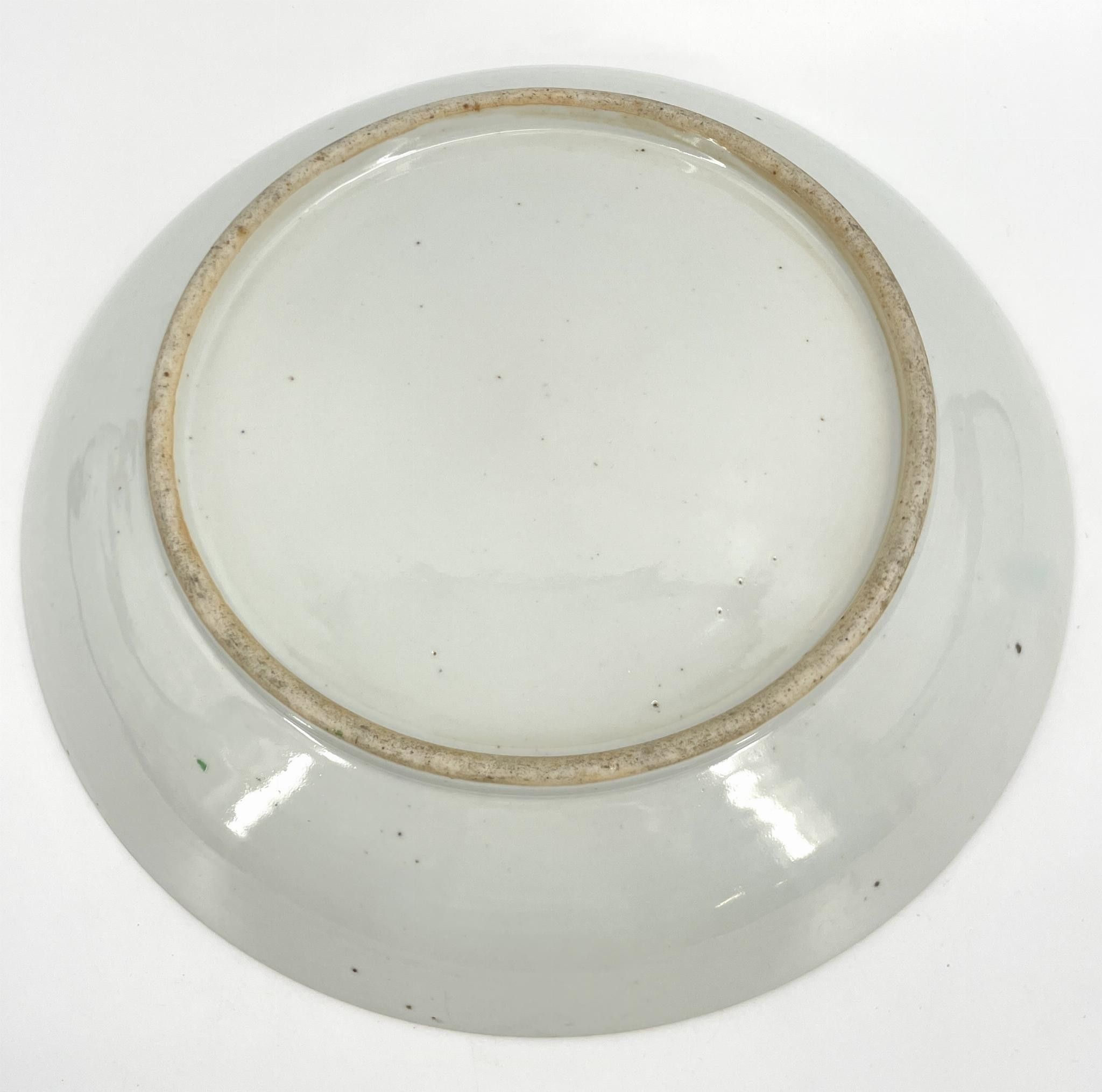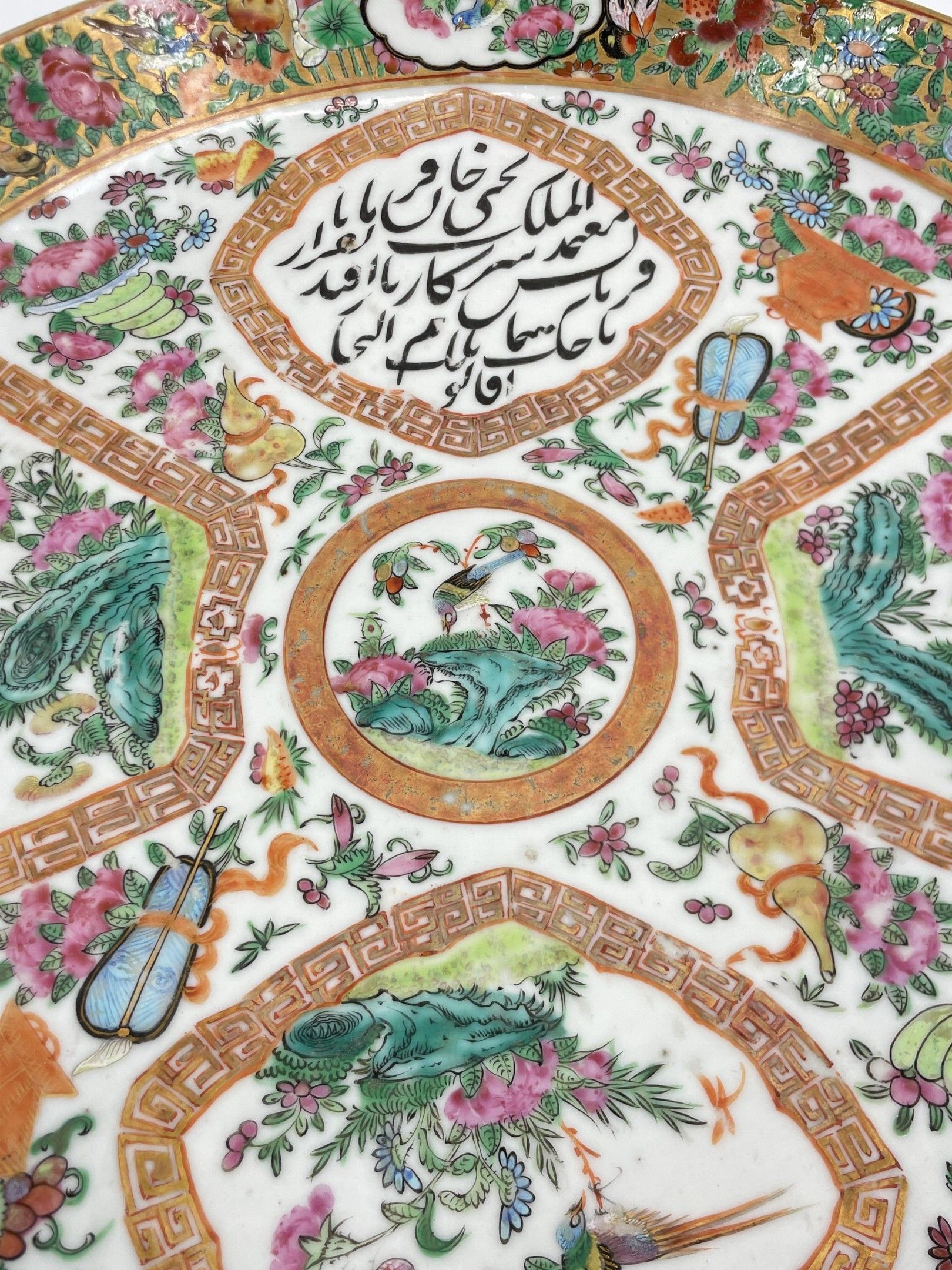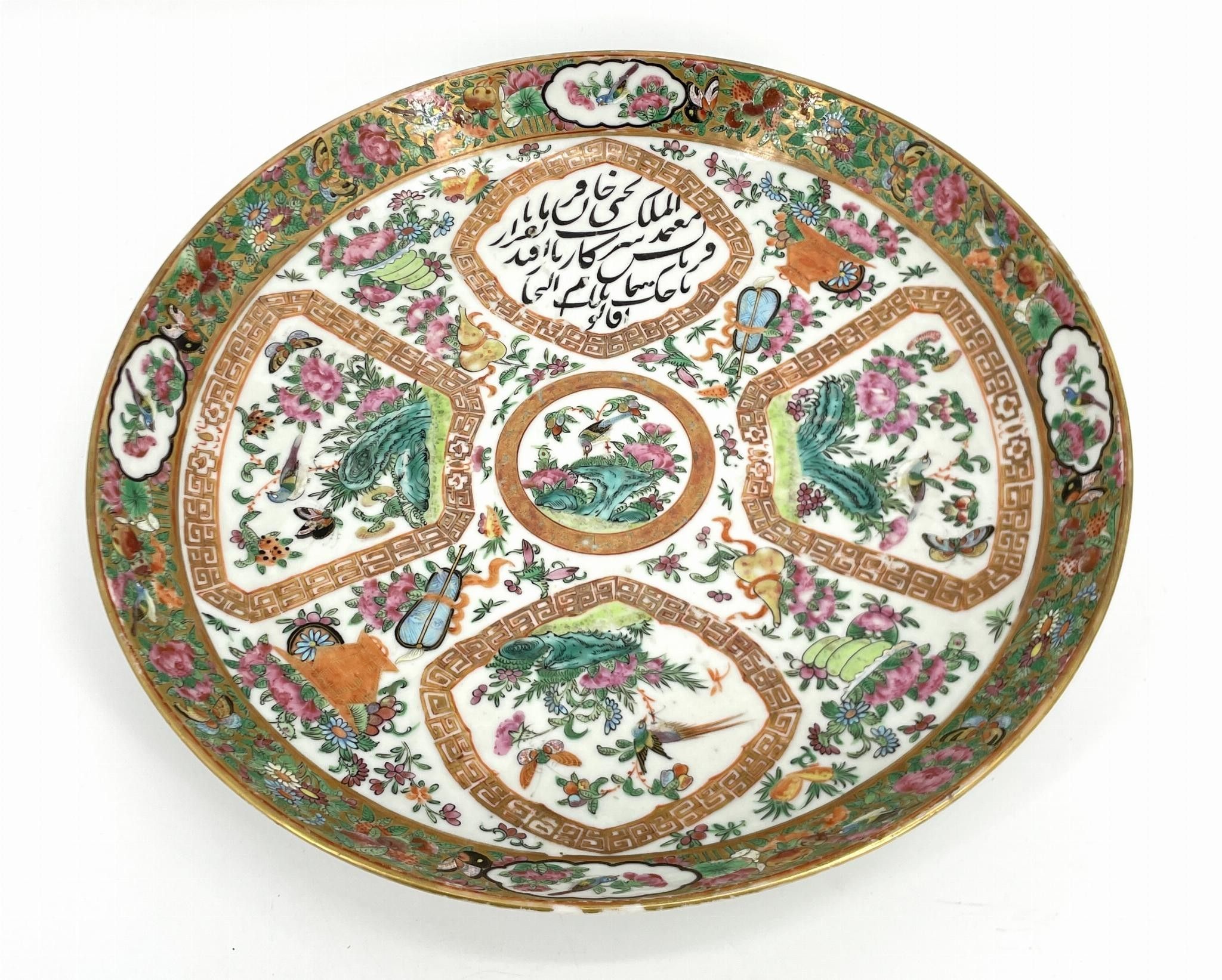 Dish decorated in reserves with flowers and birds and a cartouche in Arabic script.