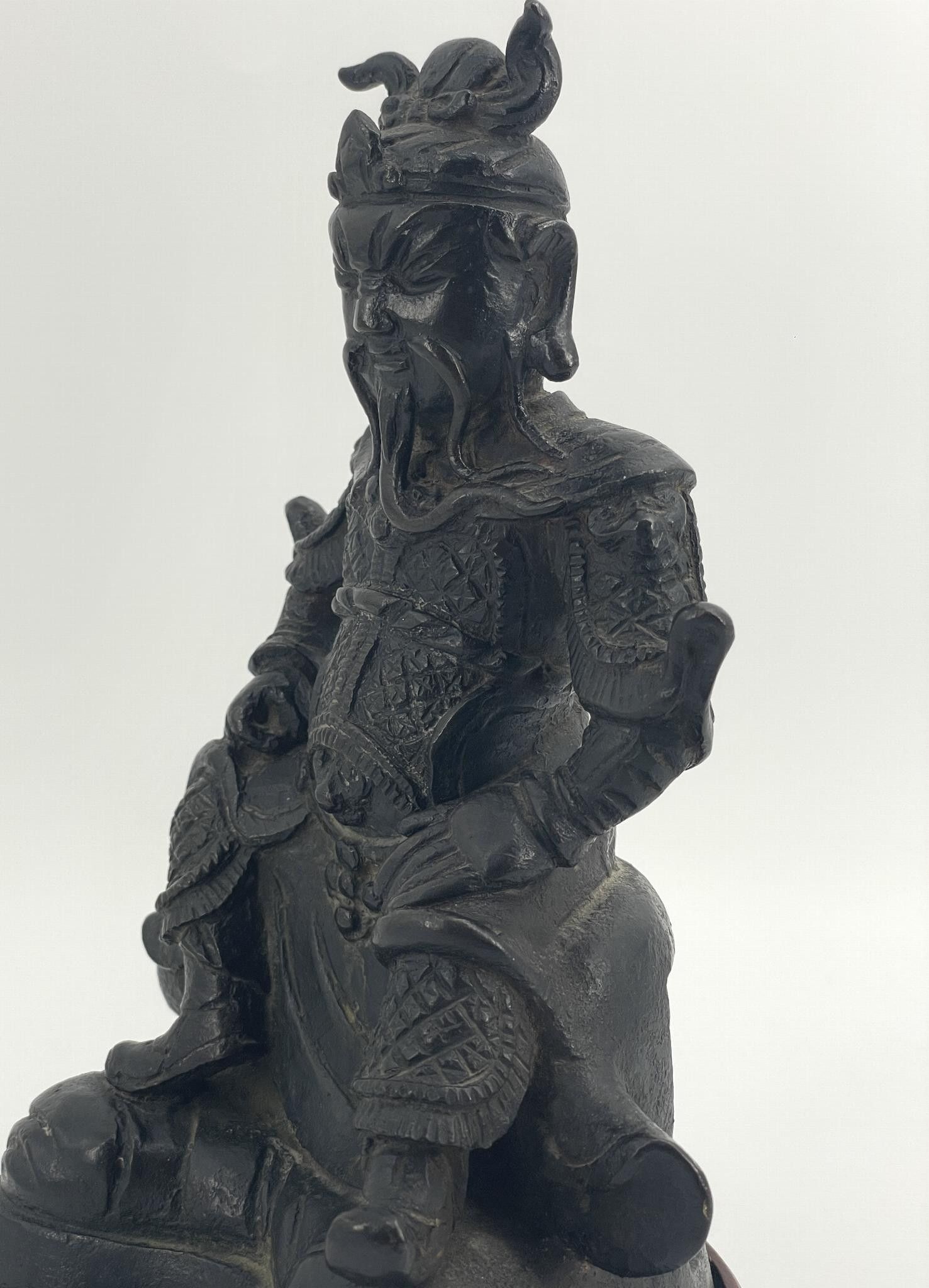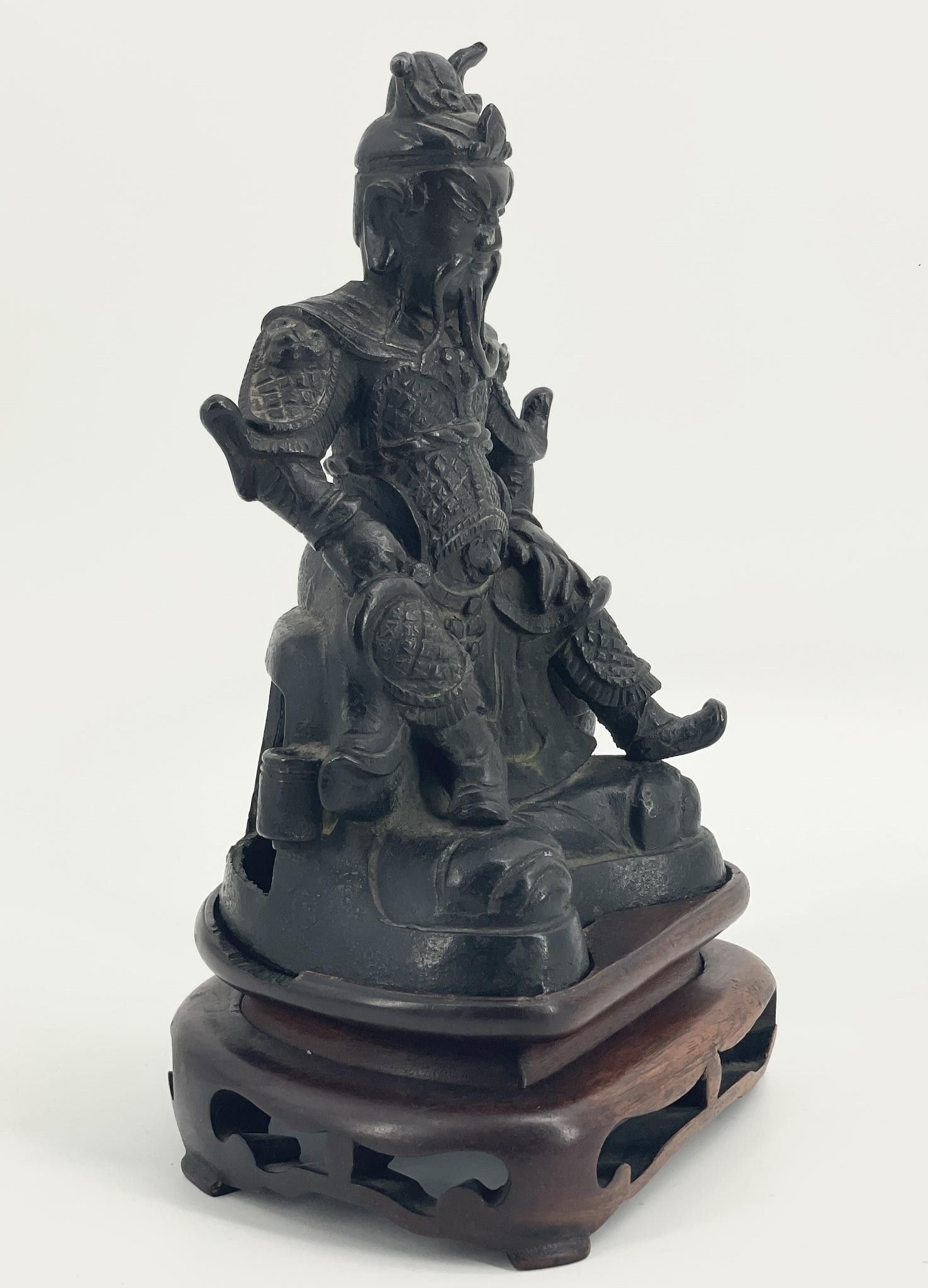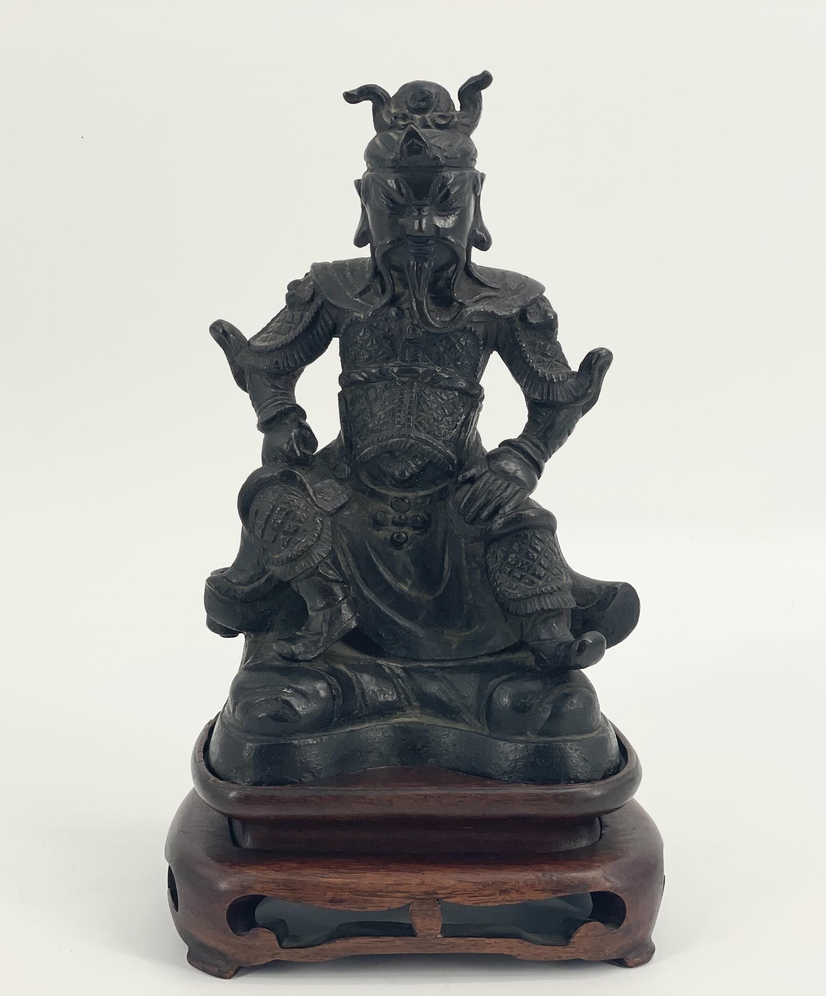 Depicted seated on a bench, hands resting on thighs, dressed in armour, severe face, wearing a cap, wooden base
