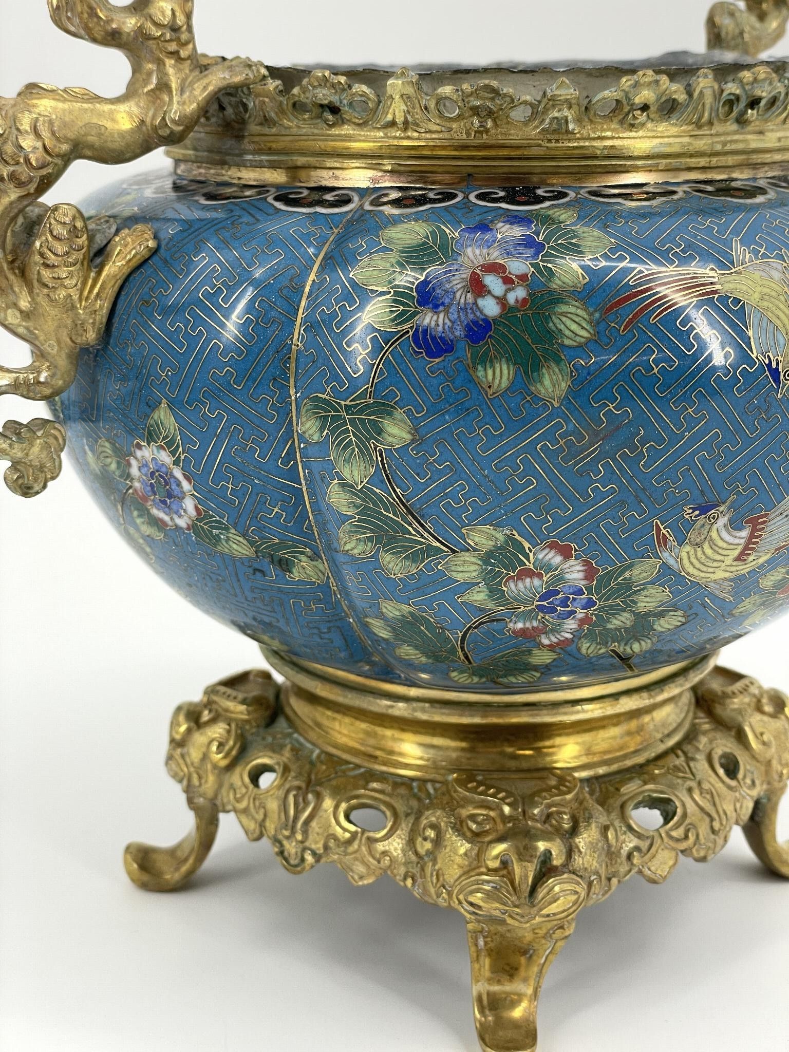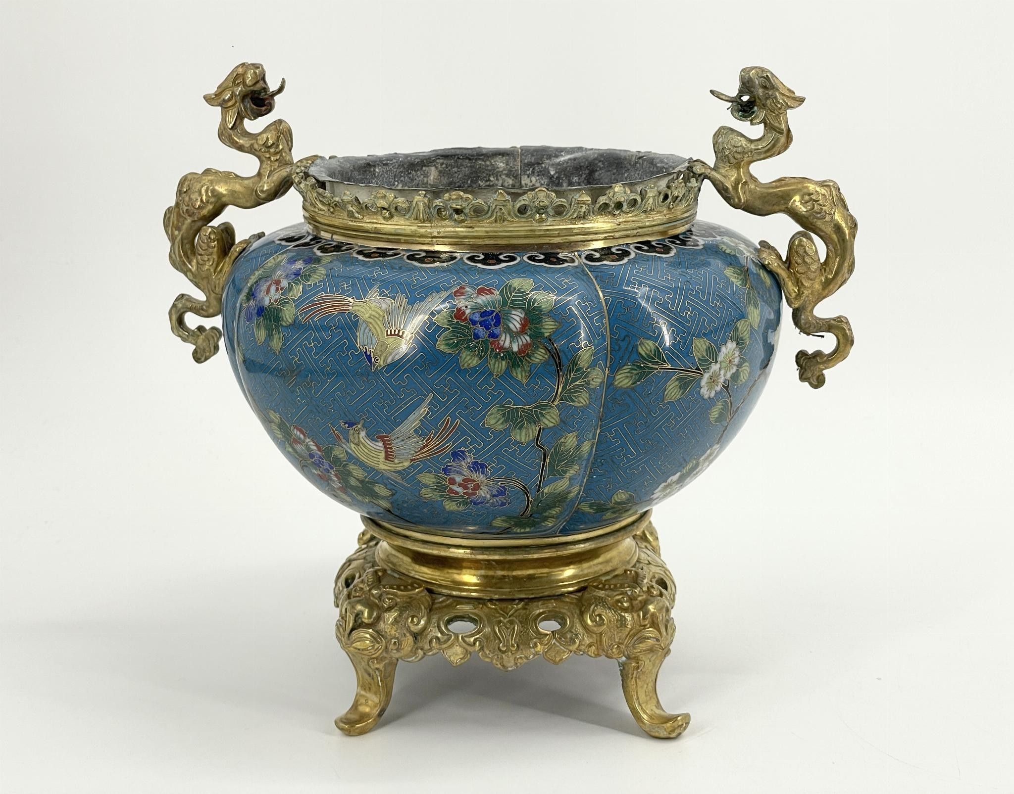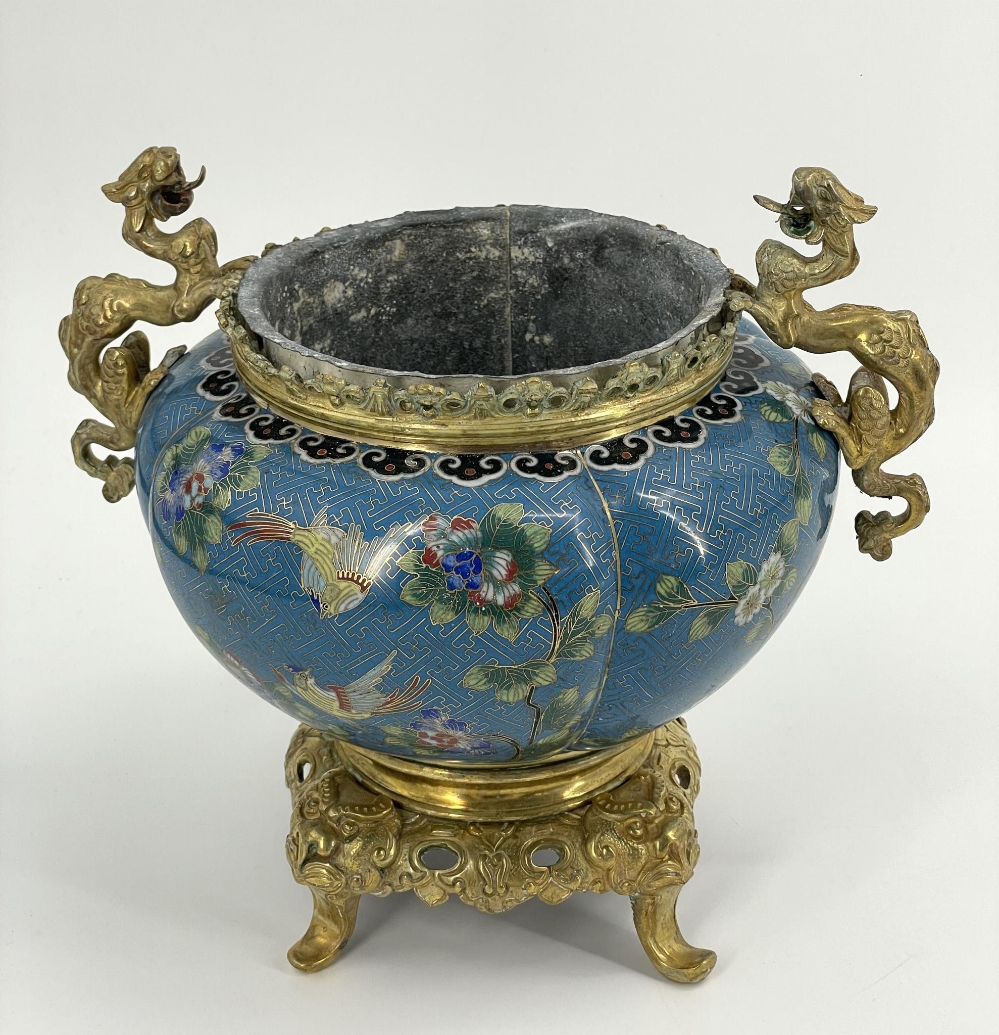A cloisonné enamel pot cover decorated with birds and flowers, with a Napoleon III period gilt bronze mounting showing two handles decorated with shilong and an openwork base with a fo dog.