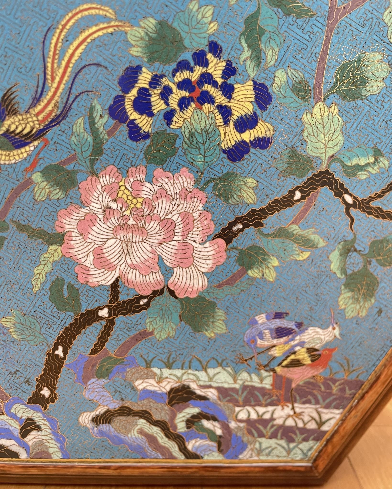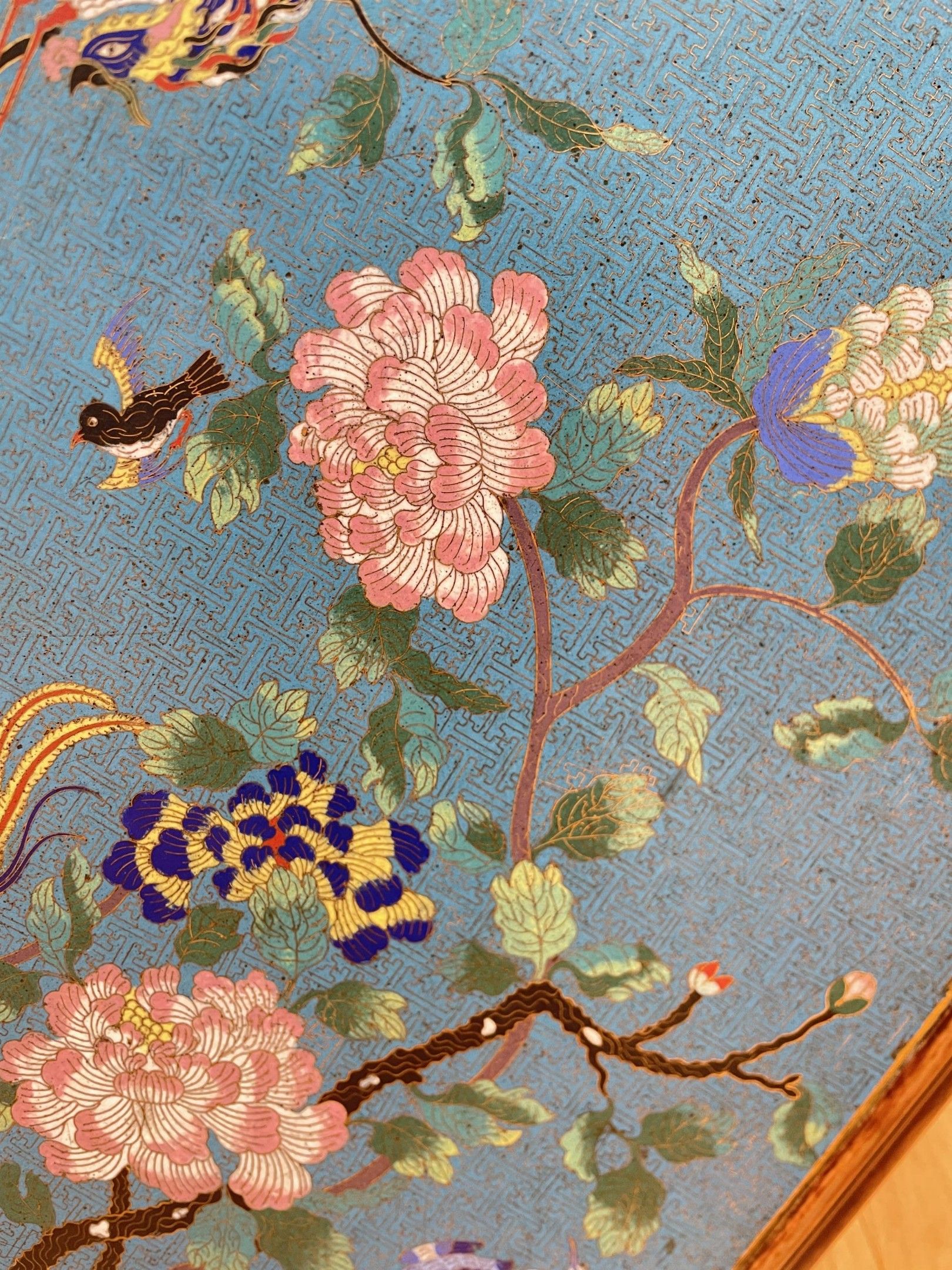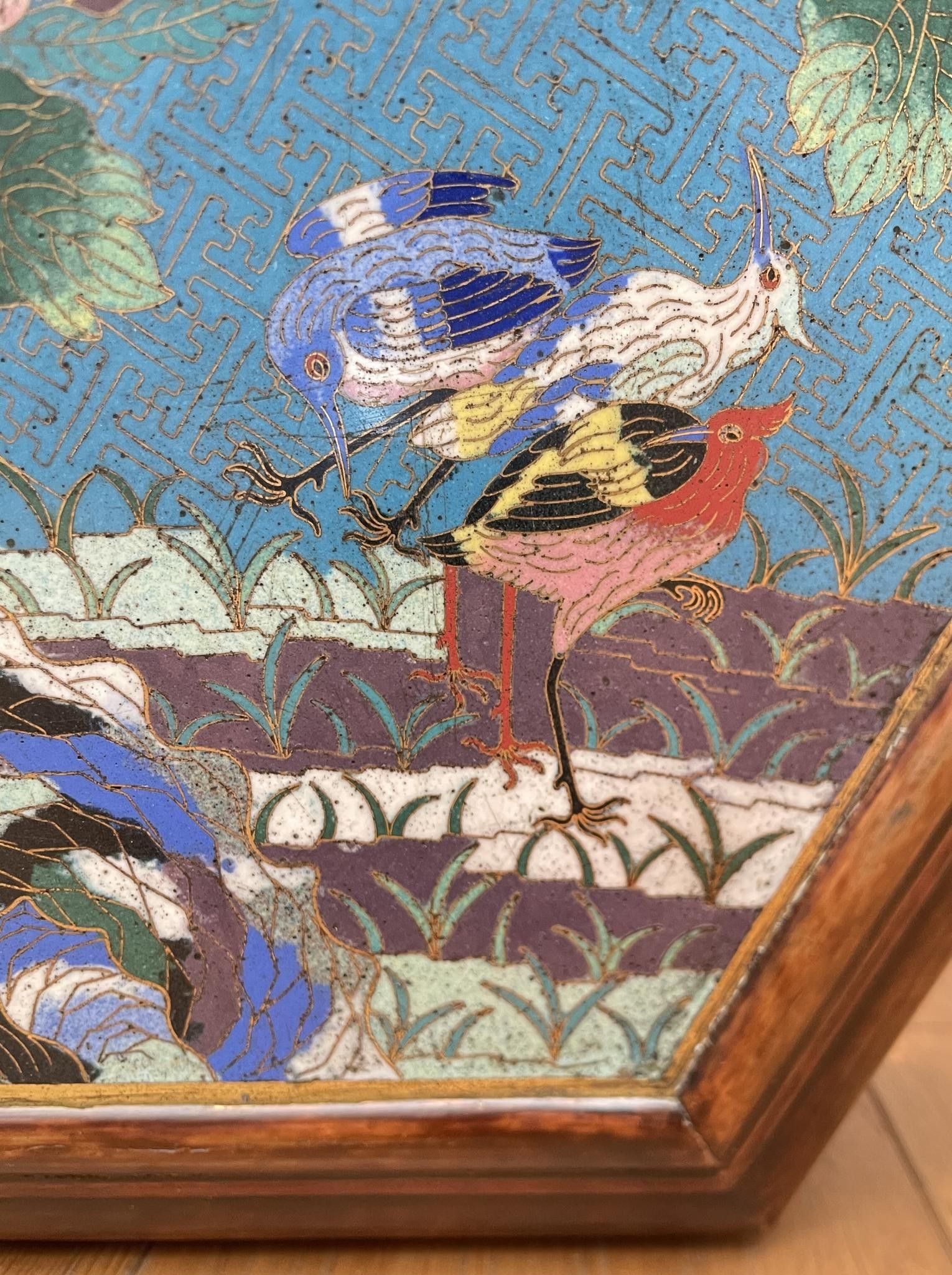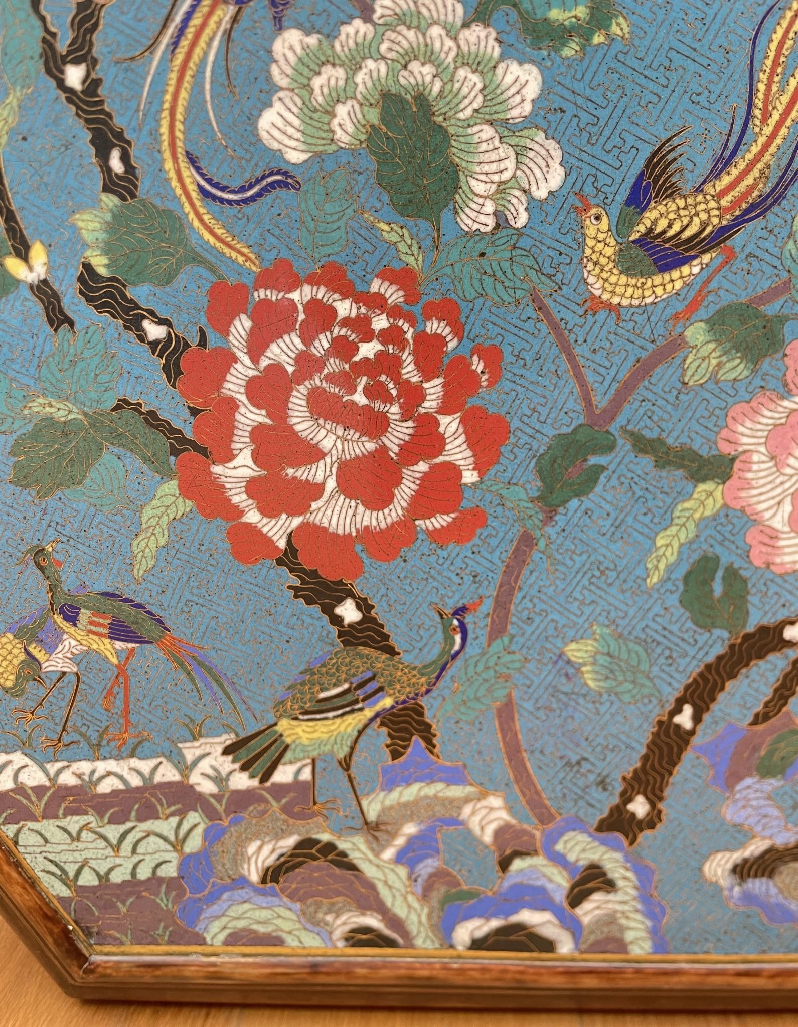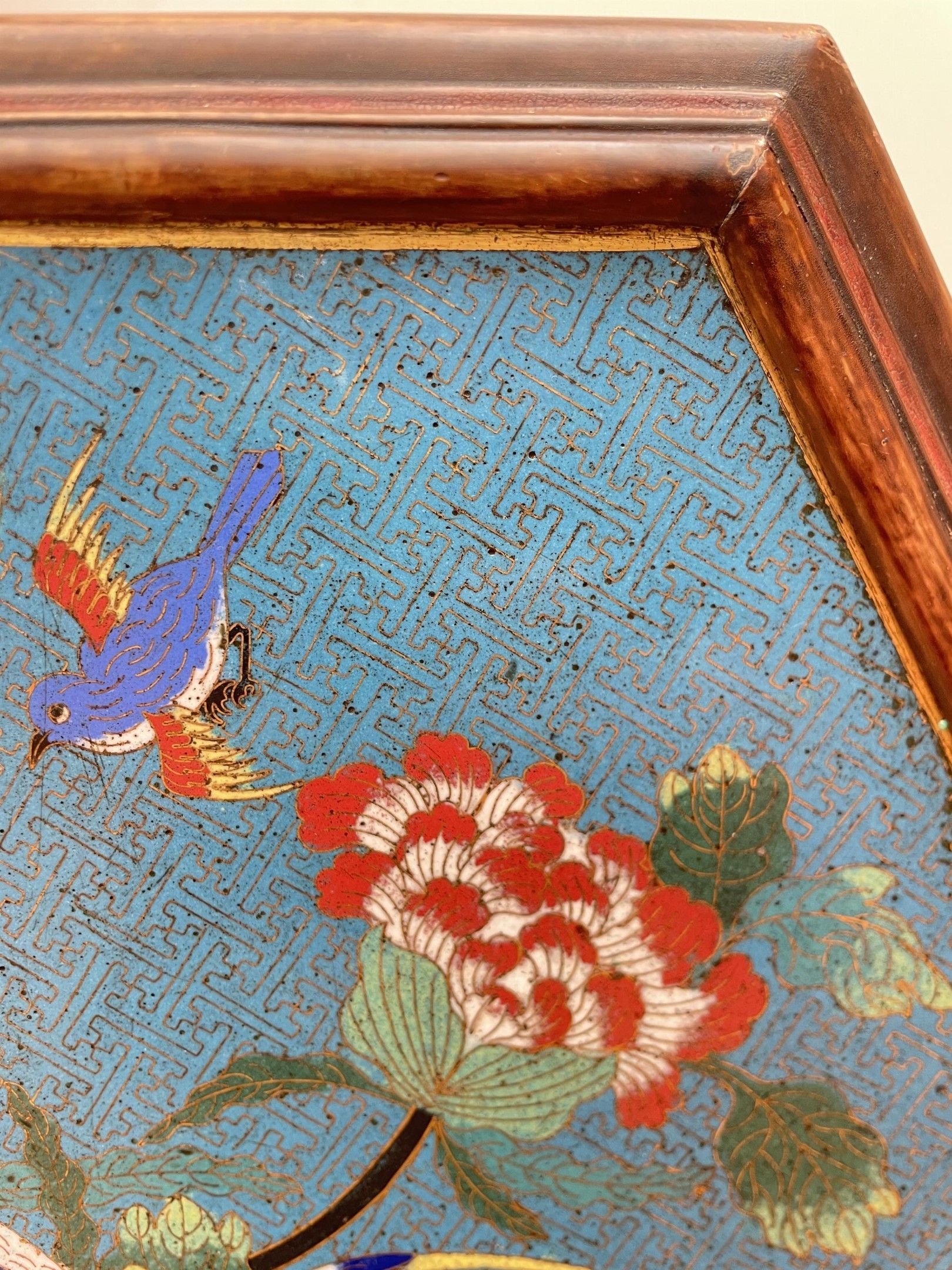 A large hexagonal plaque, decorated with phoenixes, pheasants and birds perched on branches of peonies or in flight, mounted on a later period wooden base.