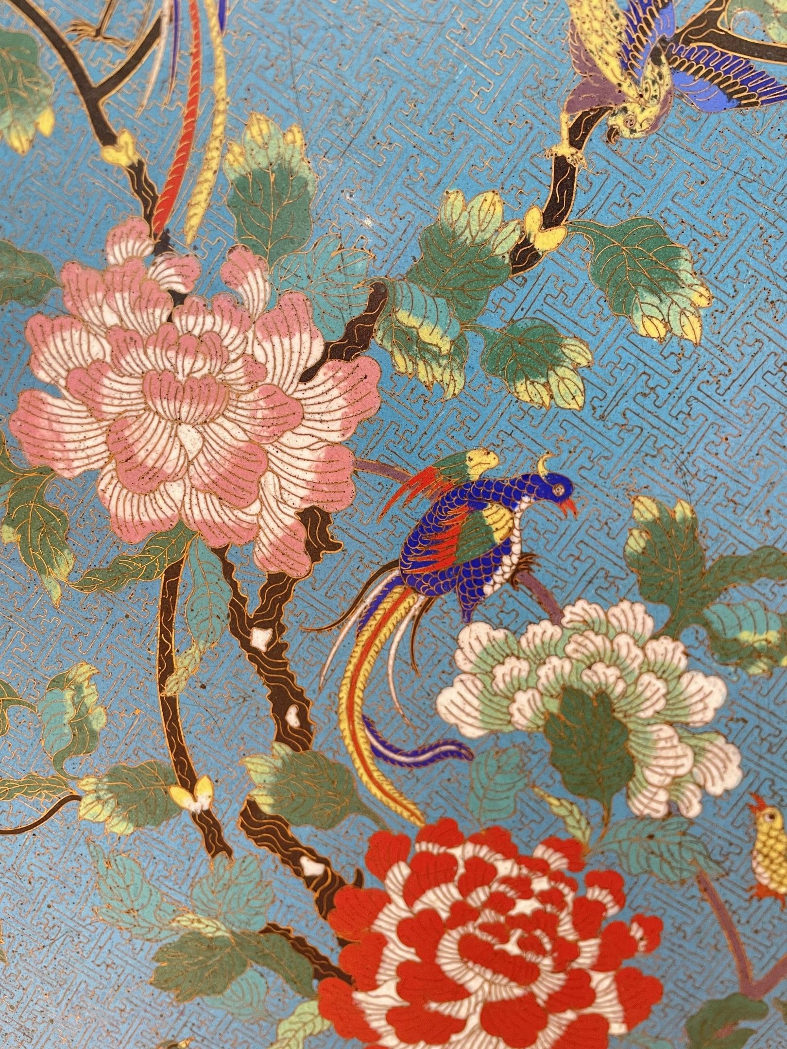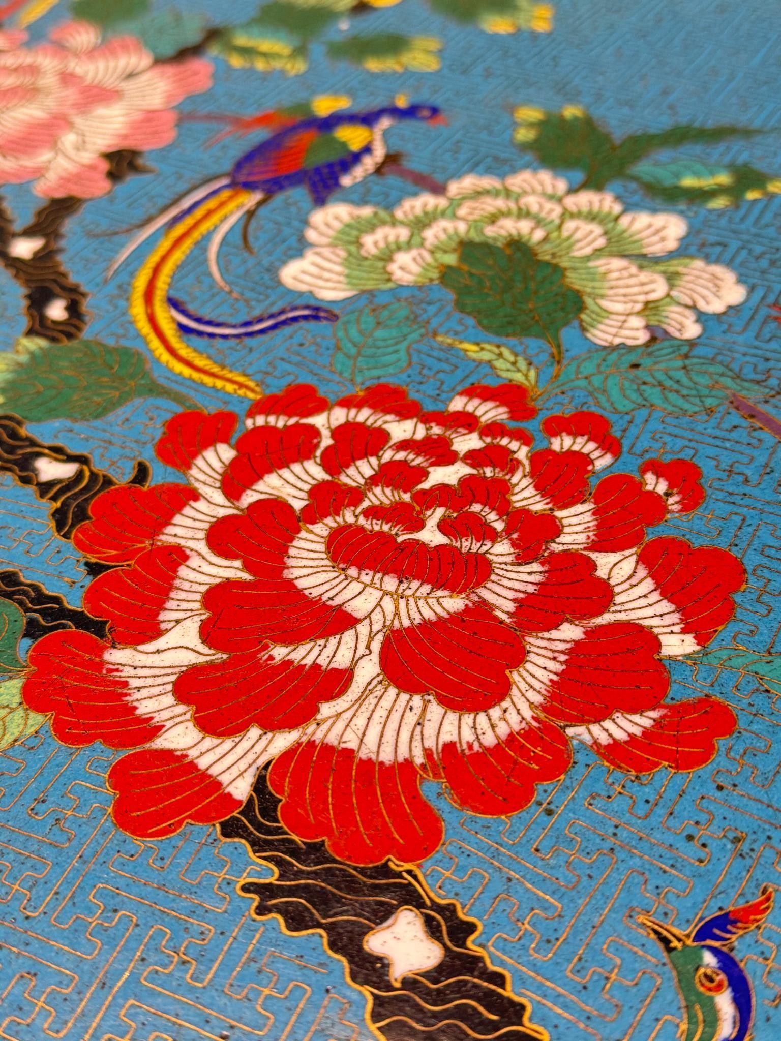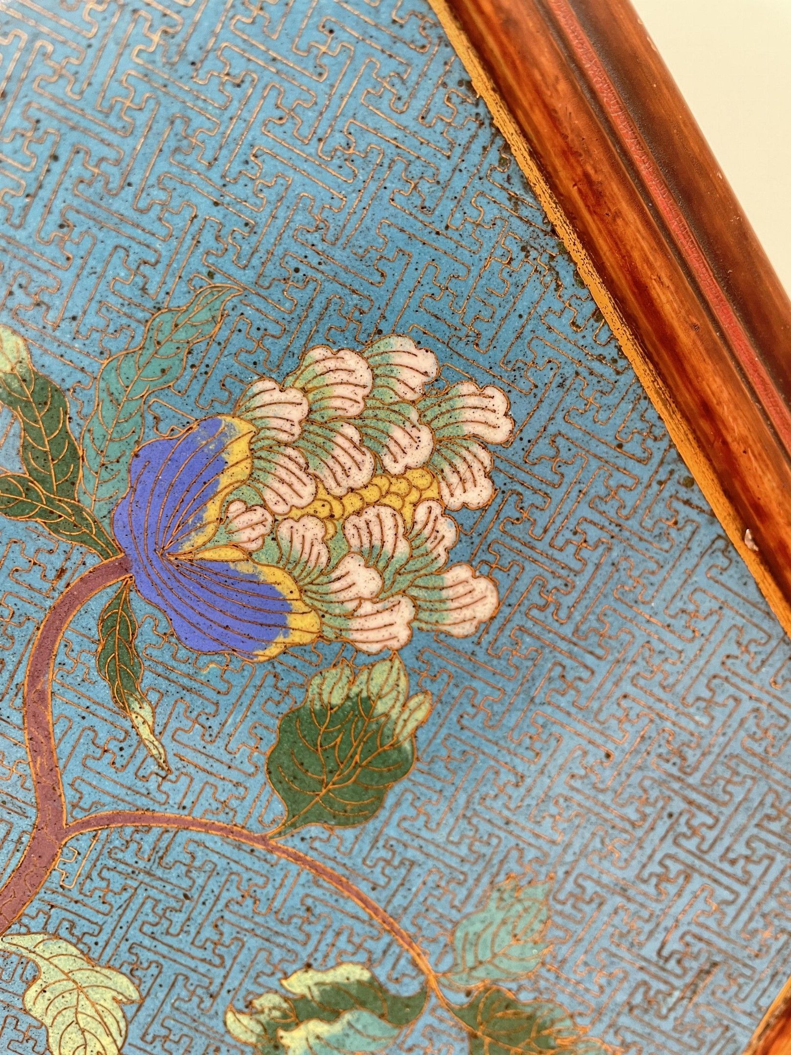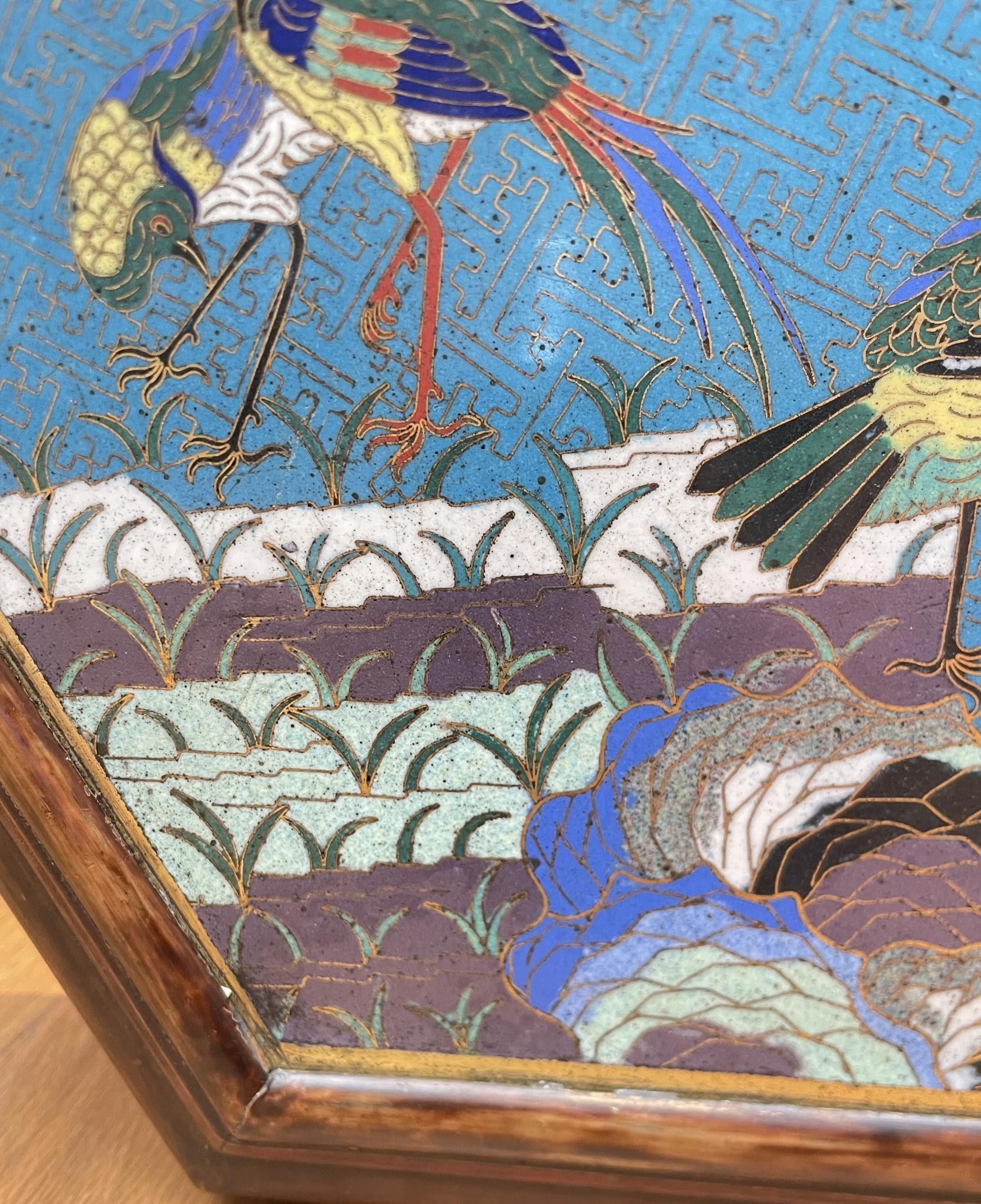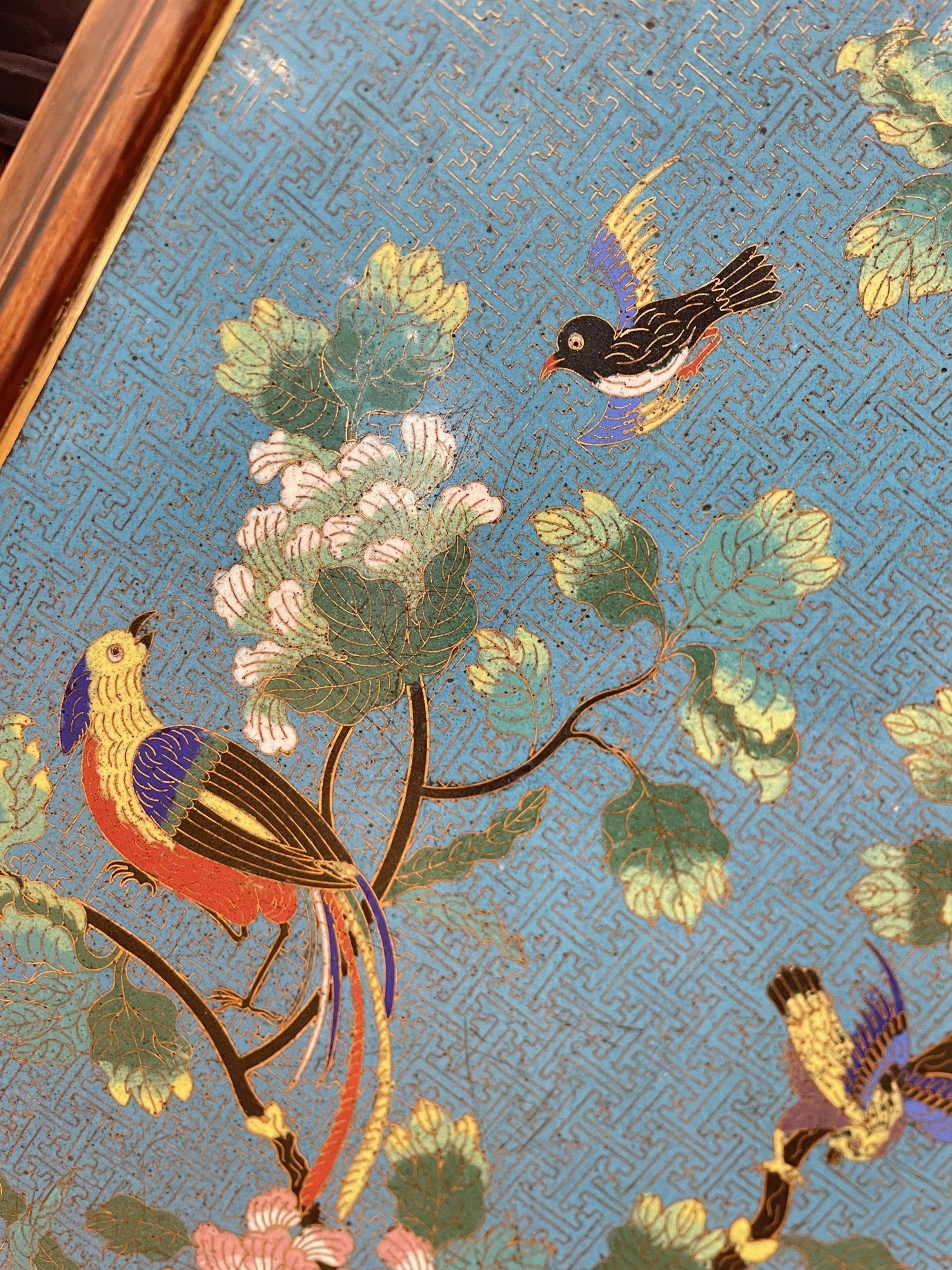 A large hexagonal plaque, decorated with phoenixes, pheasants and birds perched on branches of peonies or in flight, mounted on a later period wooden base.