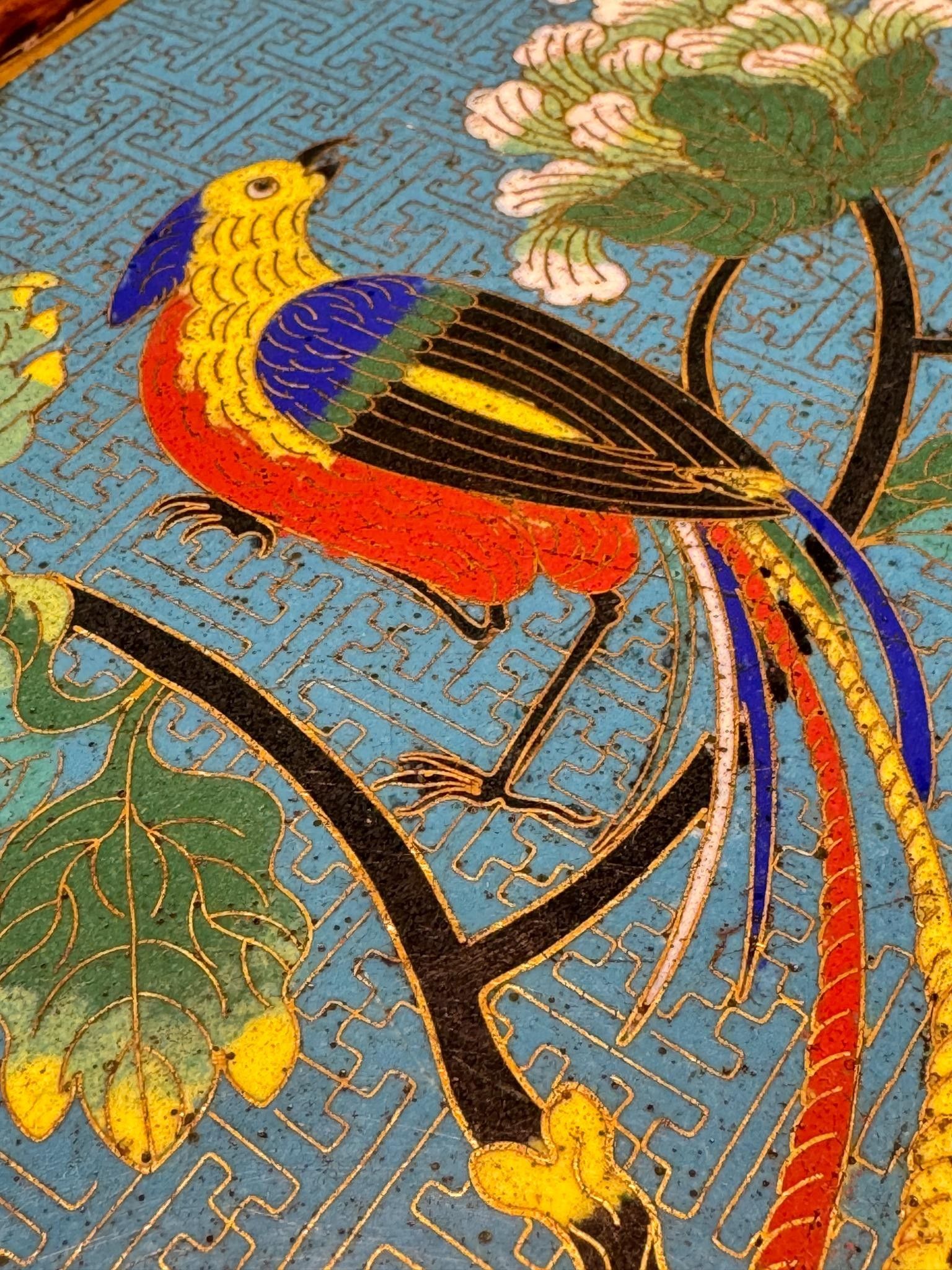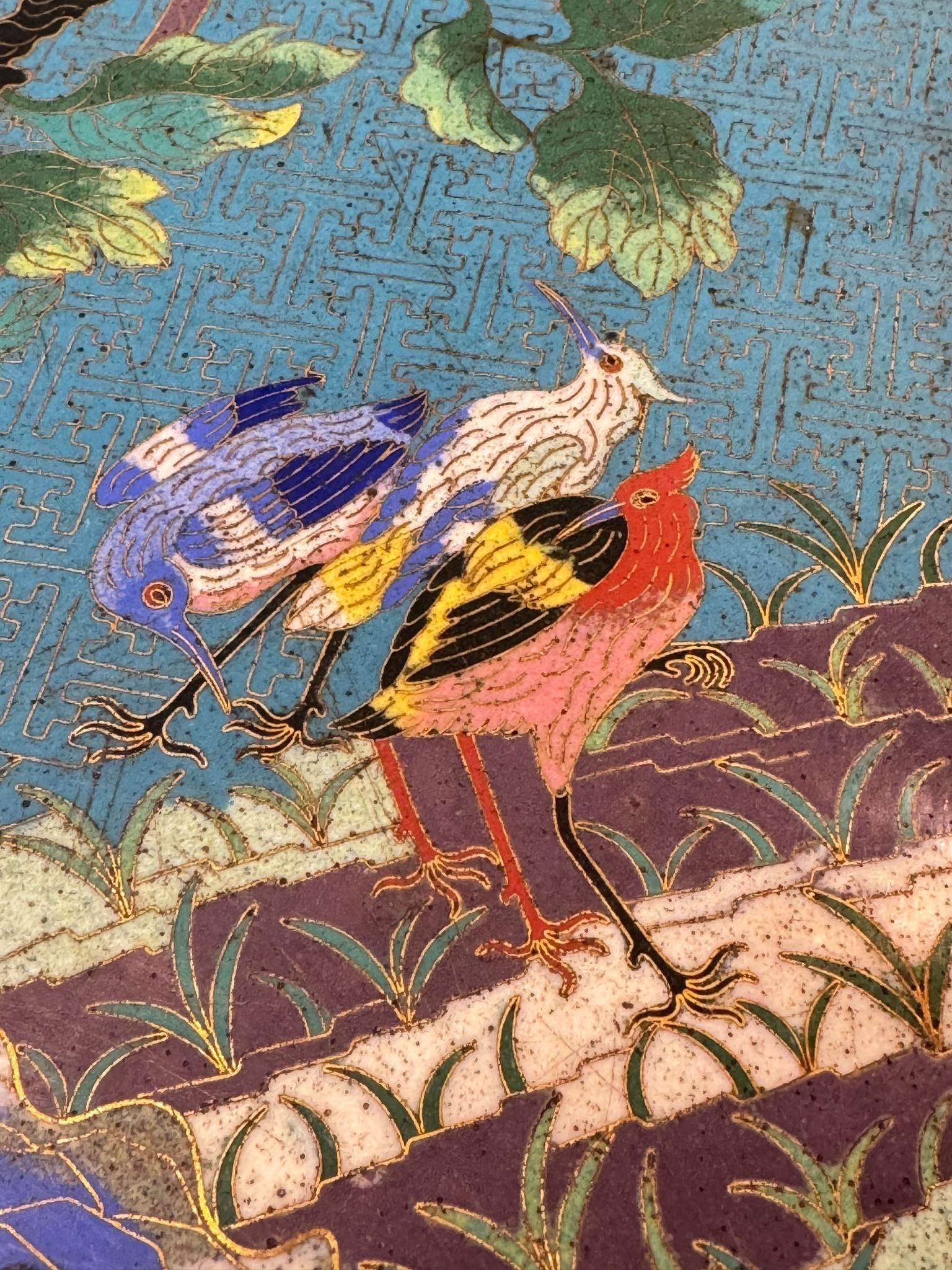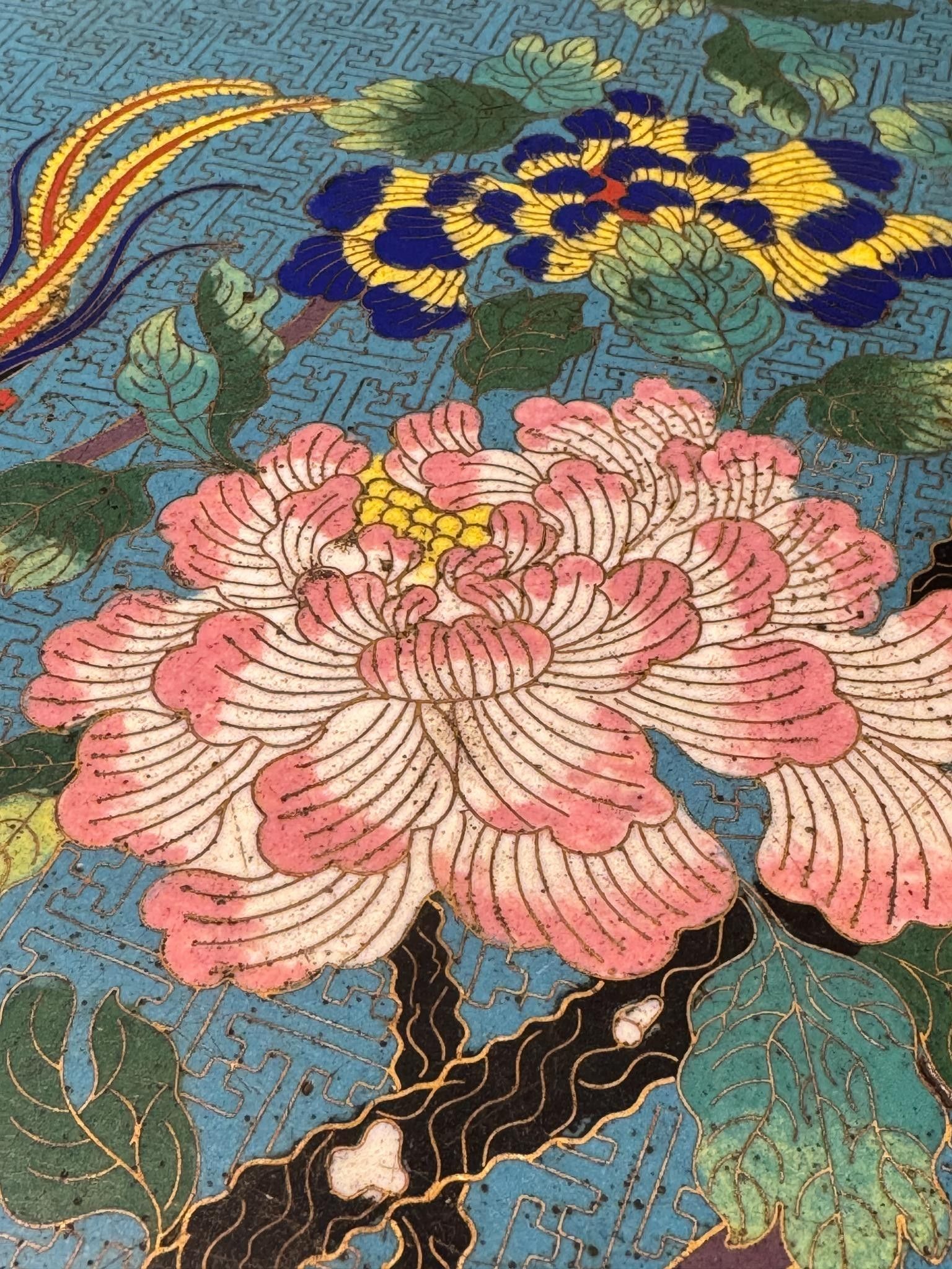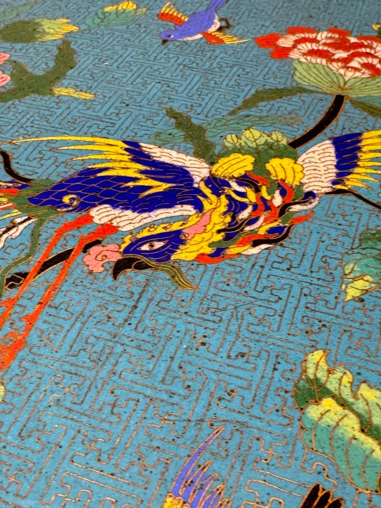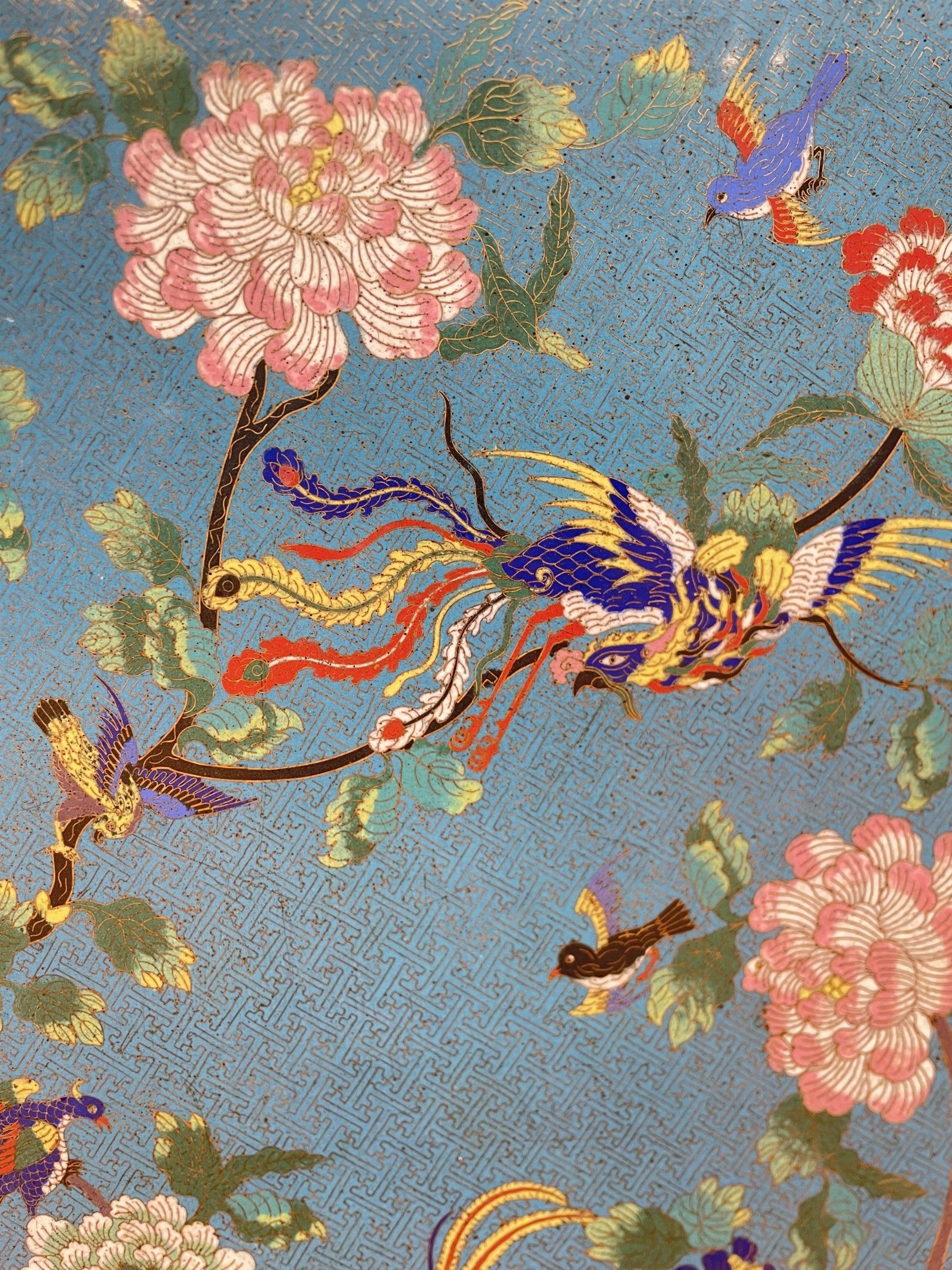 A large hexagonal plaque, decorated with phoenixes, pheasants and birds perched on branches of peonies or in flight, mounted on a later period wooden base.