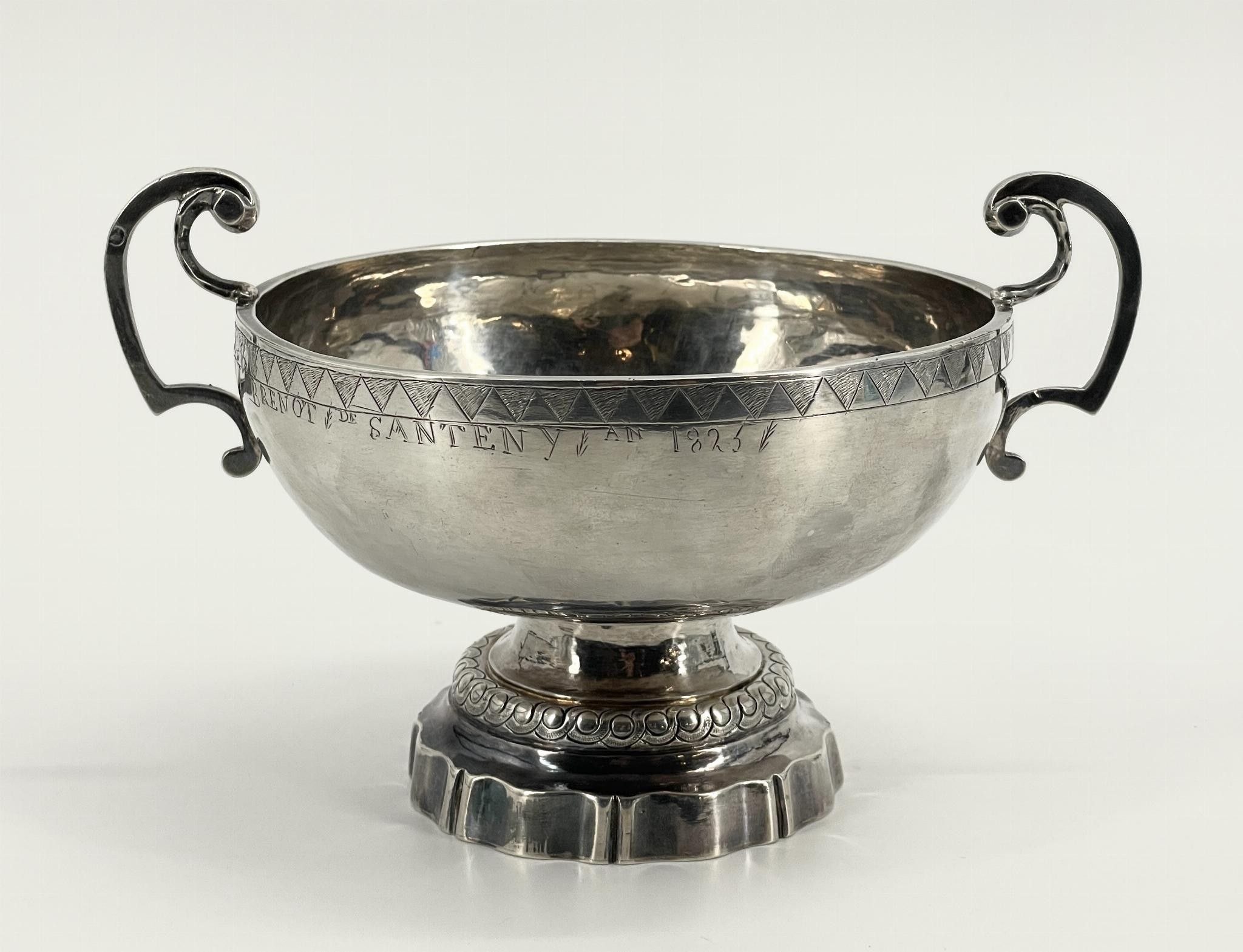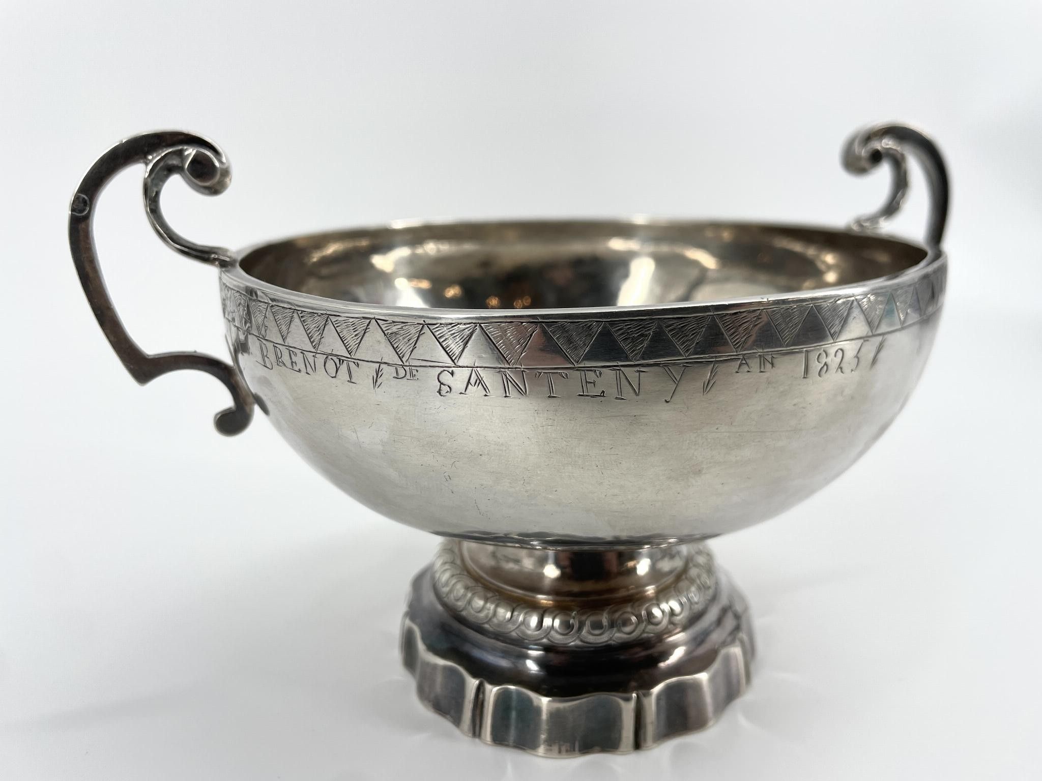 A Burgundian wedding bowl with two handles resting on a stepped base, the rim engraved with a geometric frieze, and the base with a frieze of interlacing, marked "M BENOIT DE SANTENY - an 1825", silver, Vieillard des départements hallmark, 800/1000th, master goldsmith's hallmark partly effaced.