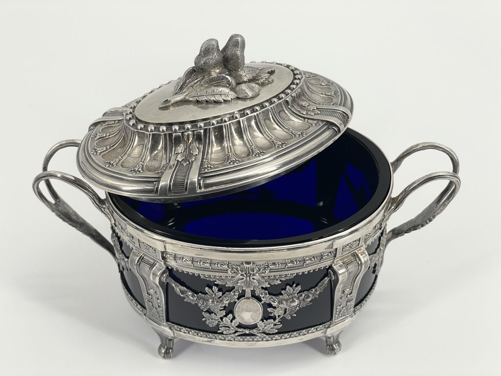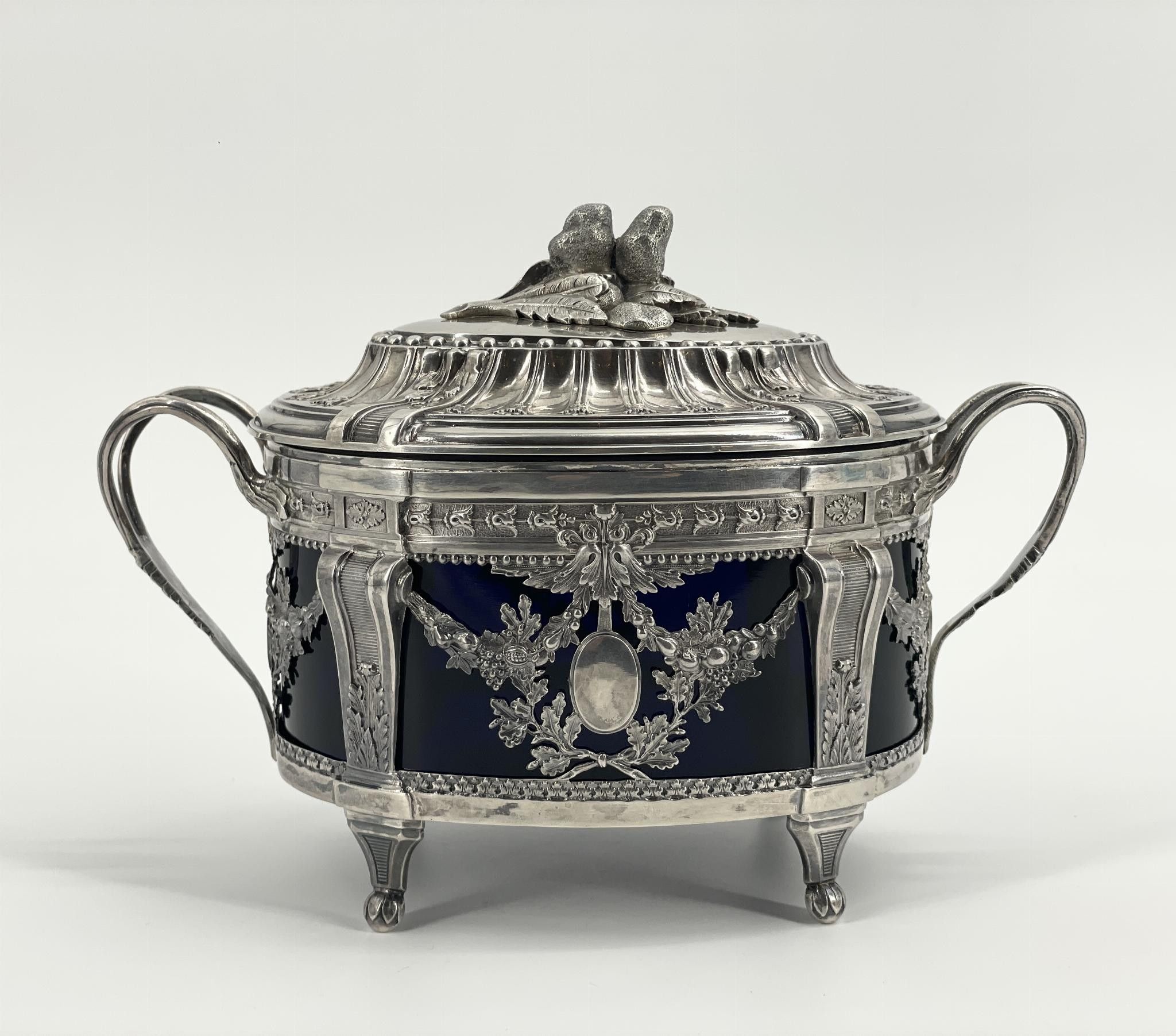 Covered sugar bowl with double handles, openwork frame decorated with garlands of holly, lid decorated with gadroons and frieze of pearls, fretel decorated with strawberries, silver, Minerve hallmark, 950/1000th, hallmark of master goldsmith Edmond Tetard, numbered 60967, blue glass interior.
