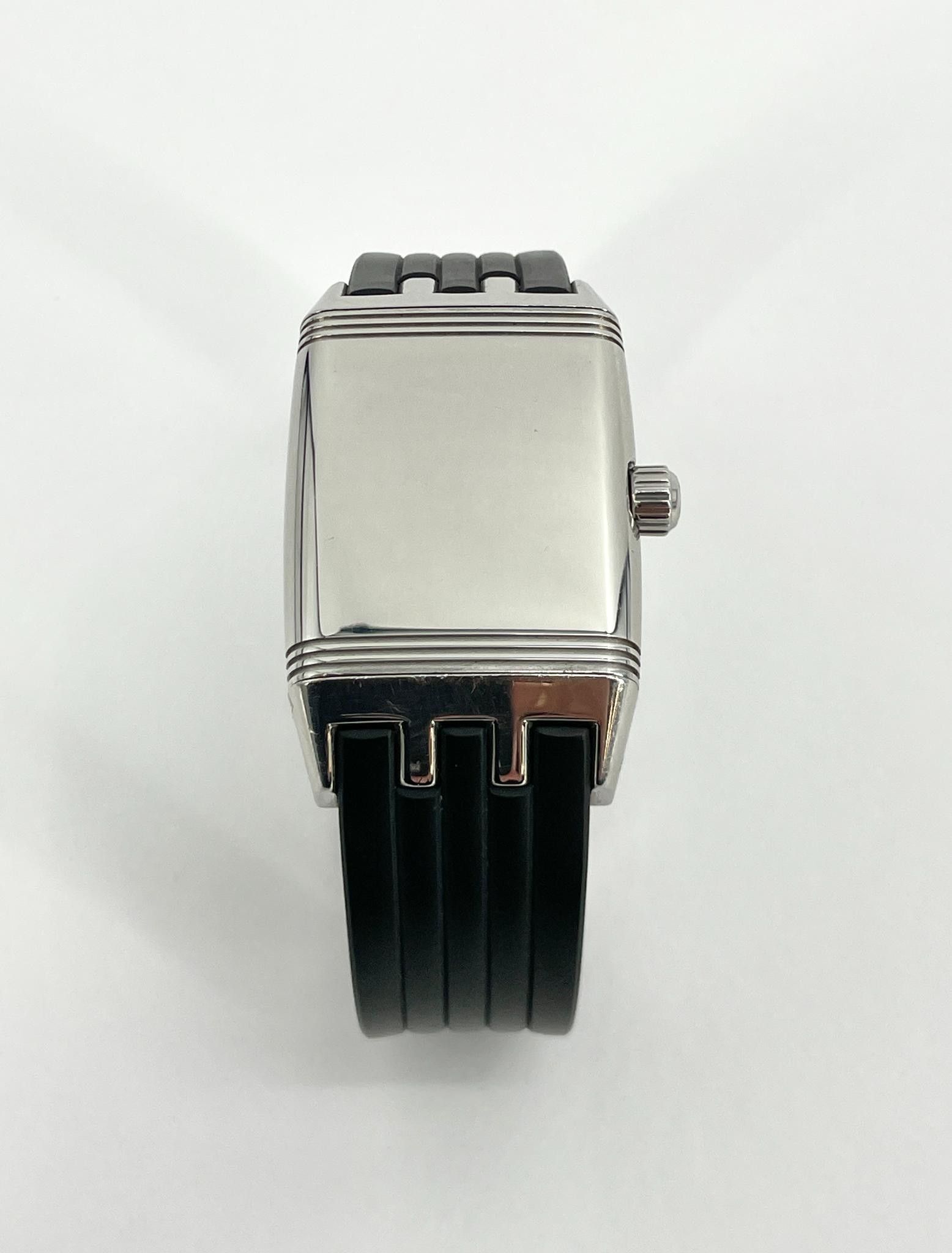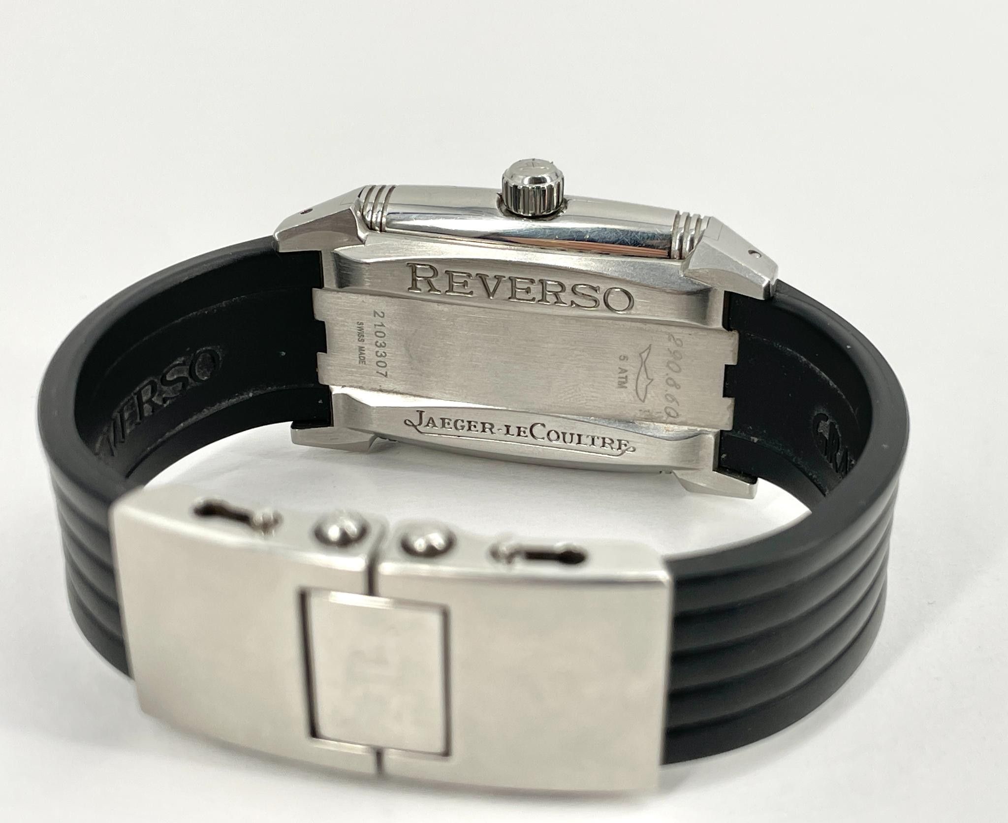 Reverso Grand Sport model watch bracelet, reversible dial, chocolate pattern dial with date window at 6 o'clock, steel case, ref. 290.8.60, numbered 2103307, mechanical winding movement, calibre numbered 960R and numbered 2972573, rubber strap and folding clasp.