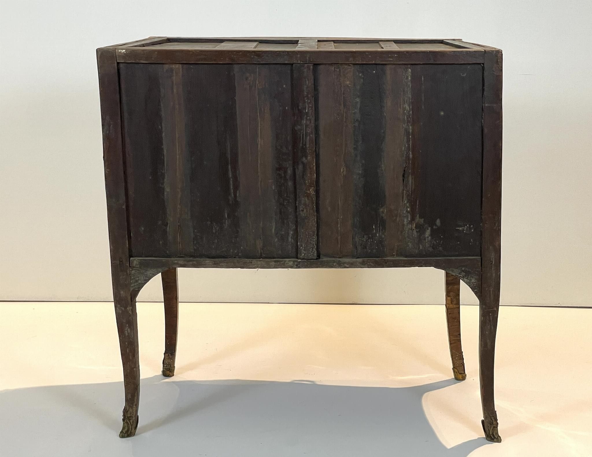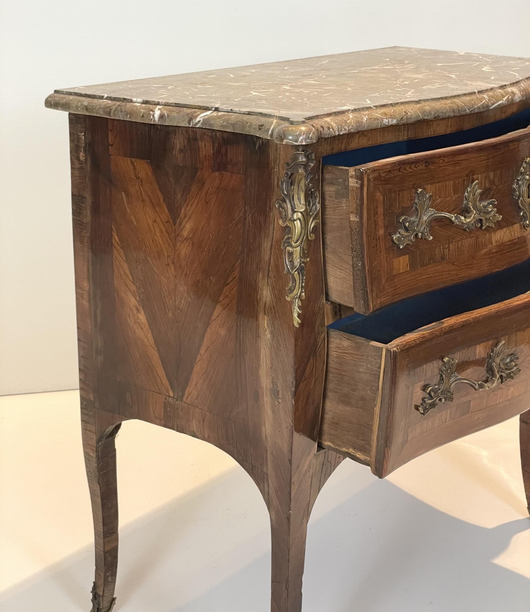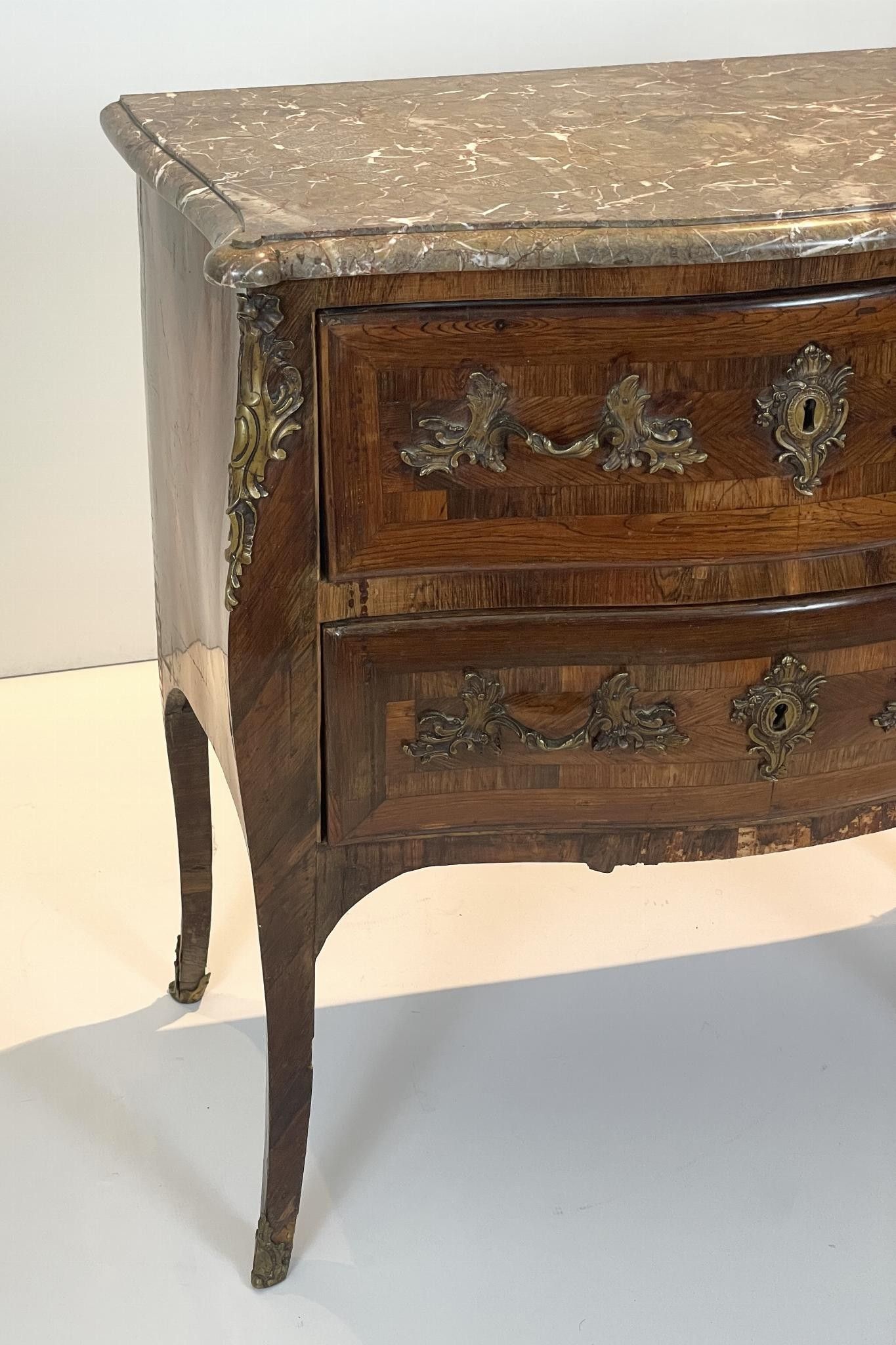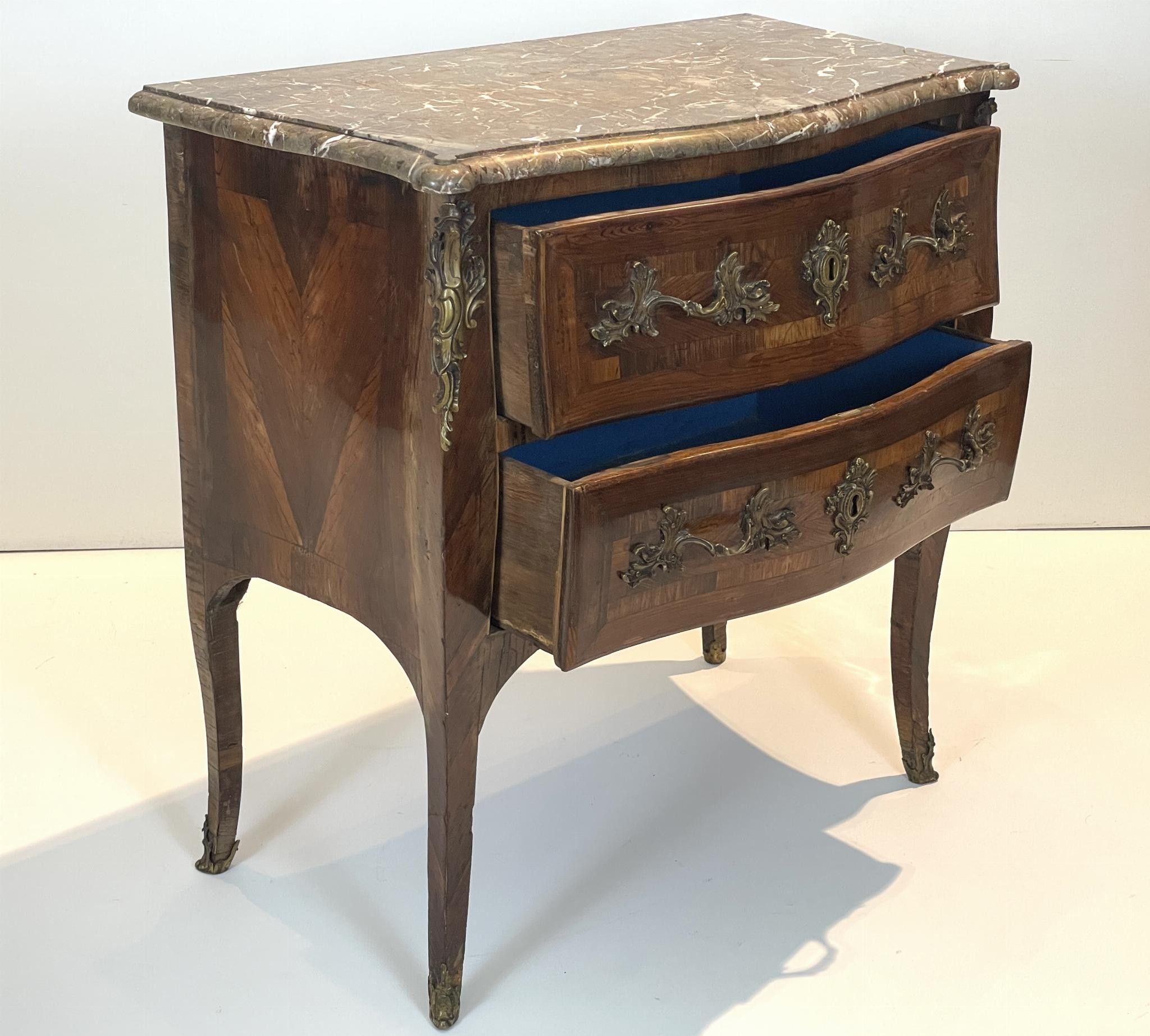 A three-sided inlaid curved commode with two drawers, ormolu ornamentation, cambered legs, scrolled marble top, Louis XV period.