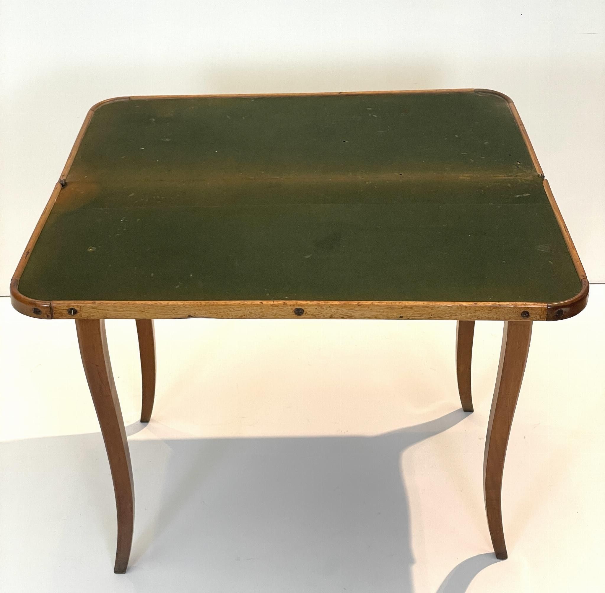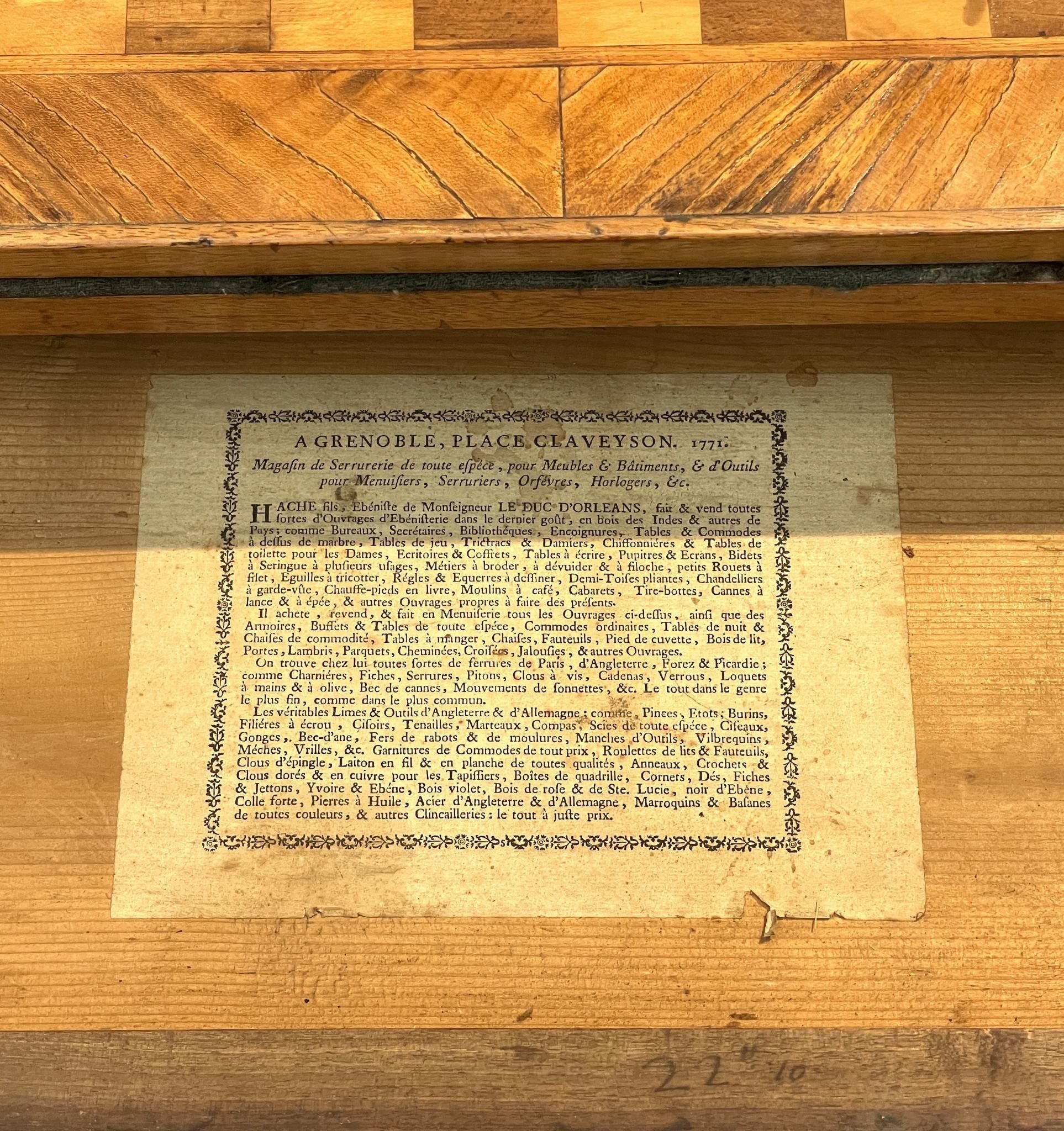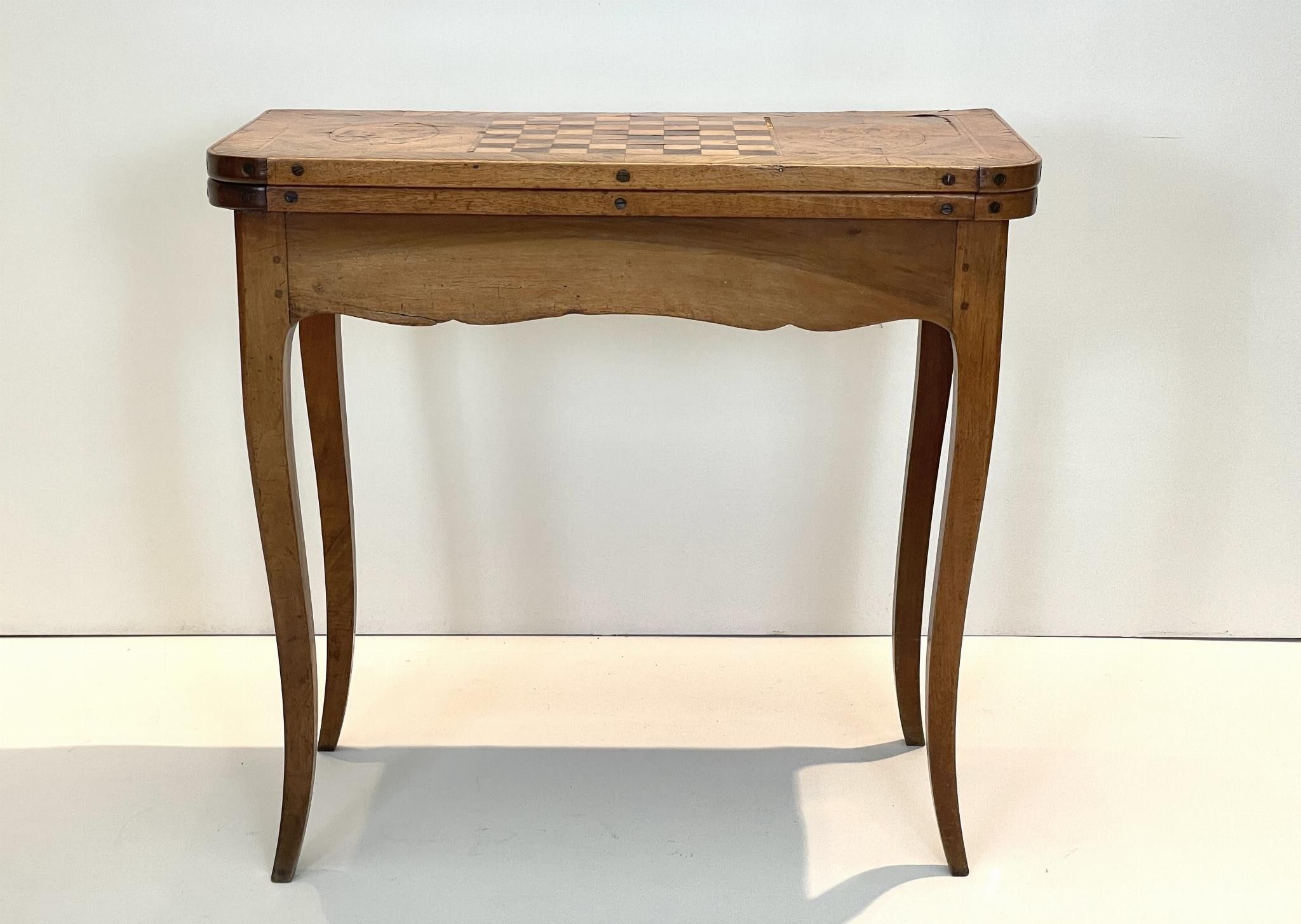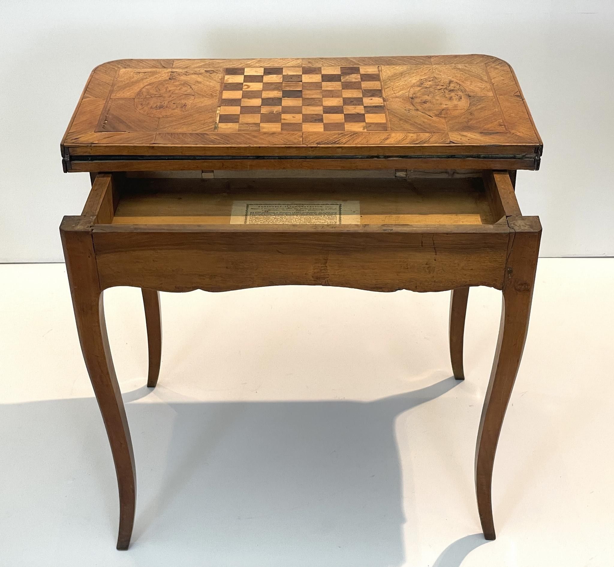 Game table, top with a checkerboard and reserves embellished with an oval, swivel top revealing a game board covered with green cloth, walnut and marquetry, it stands on four arched legs, the interior bears the cabinetmaker's label bearing the date 1771.